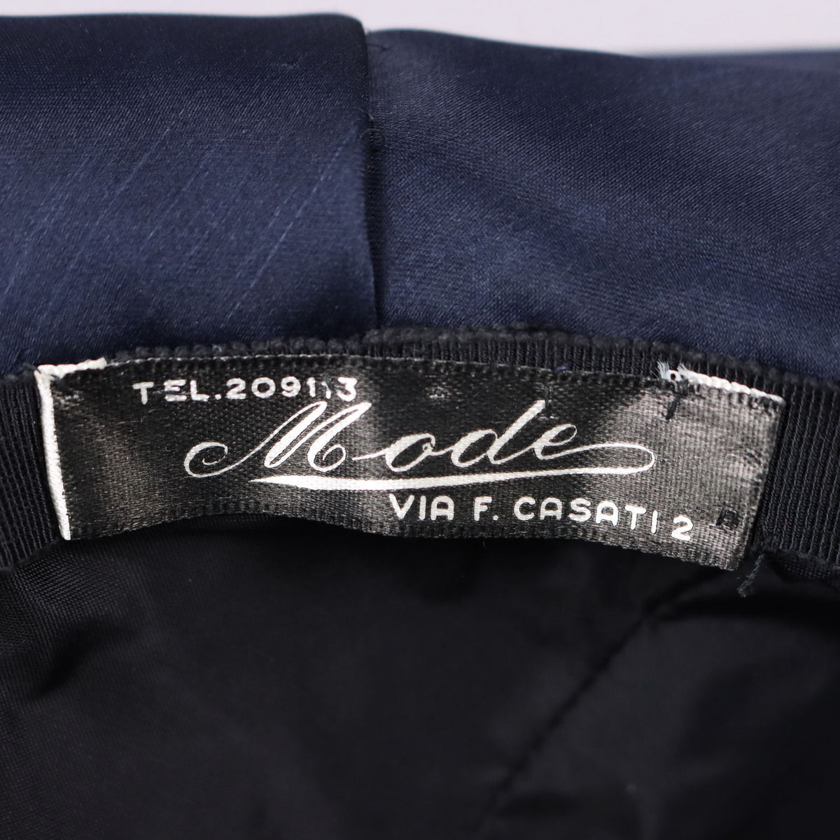 Pure dark blue silk hat with red fabric flower, datable to the 1950s / 60s. Circumference 50 cm, brim 9 cm at the maximum point. Vintage, vintage scraves, vintage scarf, vintage ties, vintage men's hats, vintage women's hats, vintage 1970s clothes, vintage 1960s clothes, 1950s vintage clothes, 1940s vintage dresses, vintage women's clothing, vintage bags, vintage objects, vintage clothing, vintage clothes, vintage shoes, vintage handbag, vintage belt, vintage clothes, , 1960s scarf, 1950s scarf, 1940s scarf, 1990s clothing, 1980s clothing, 1960s clothing, ancient hats.
