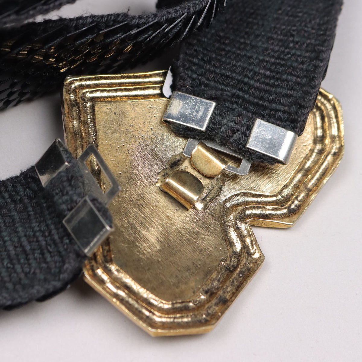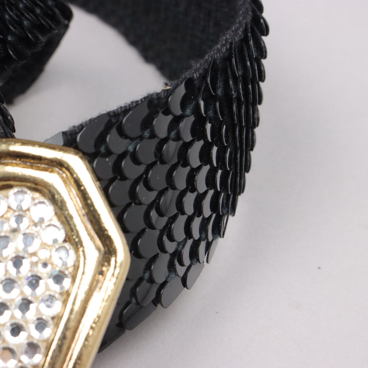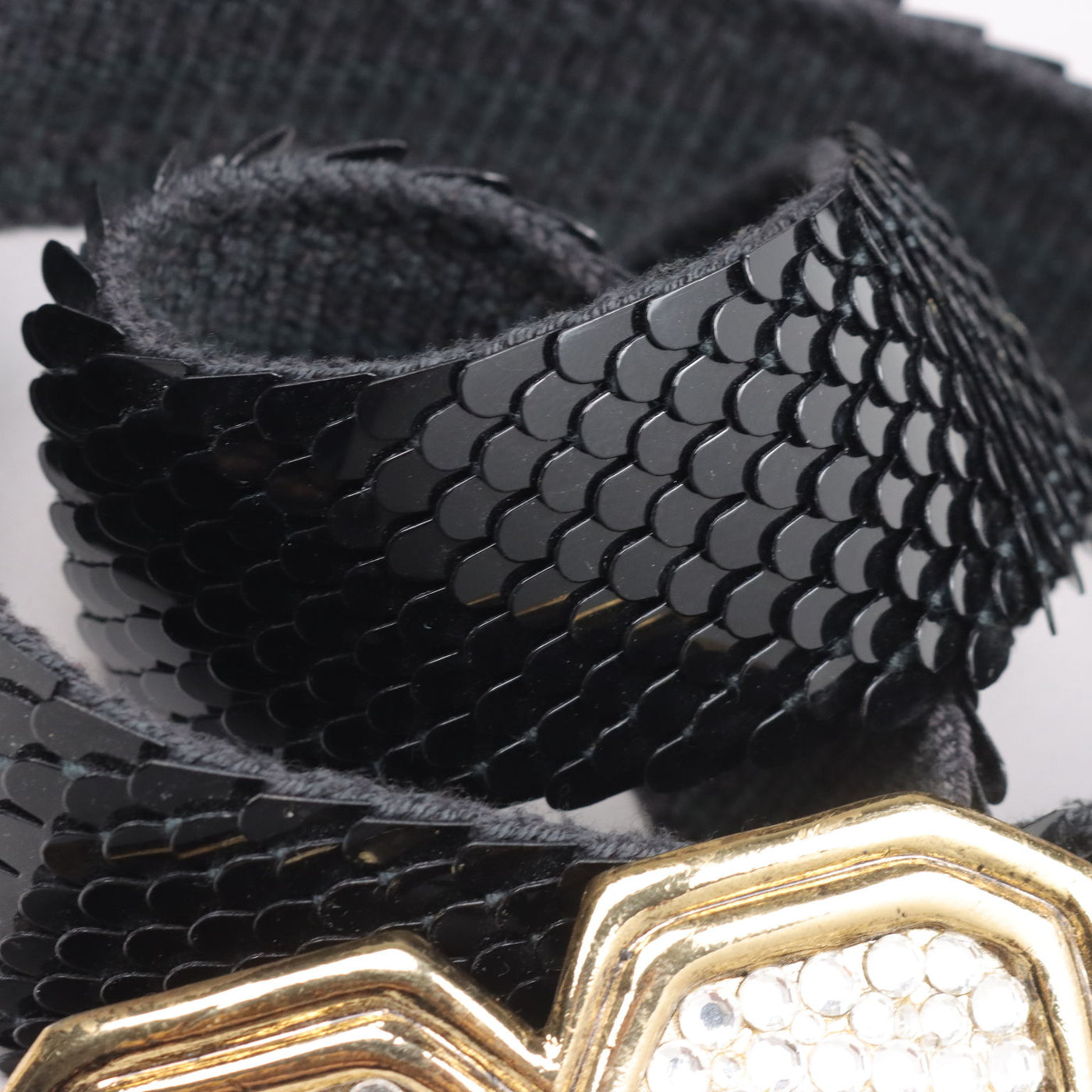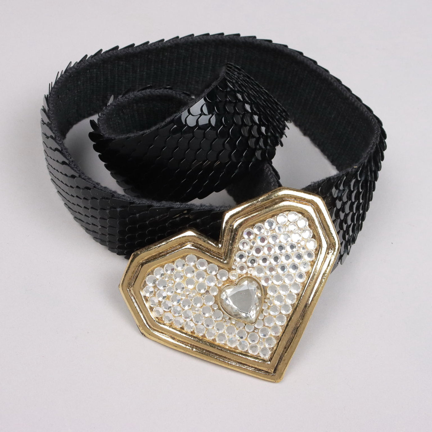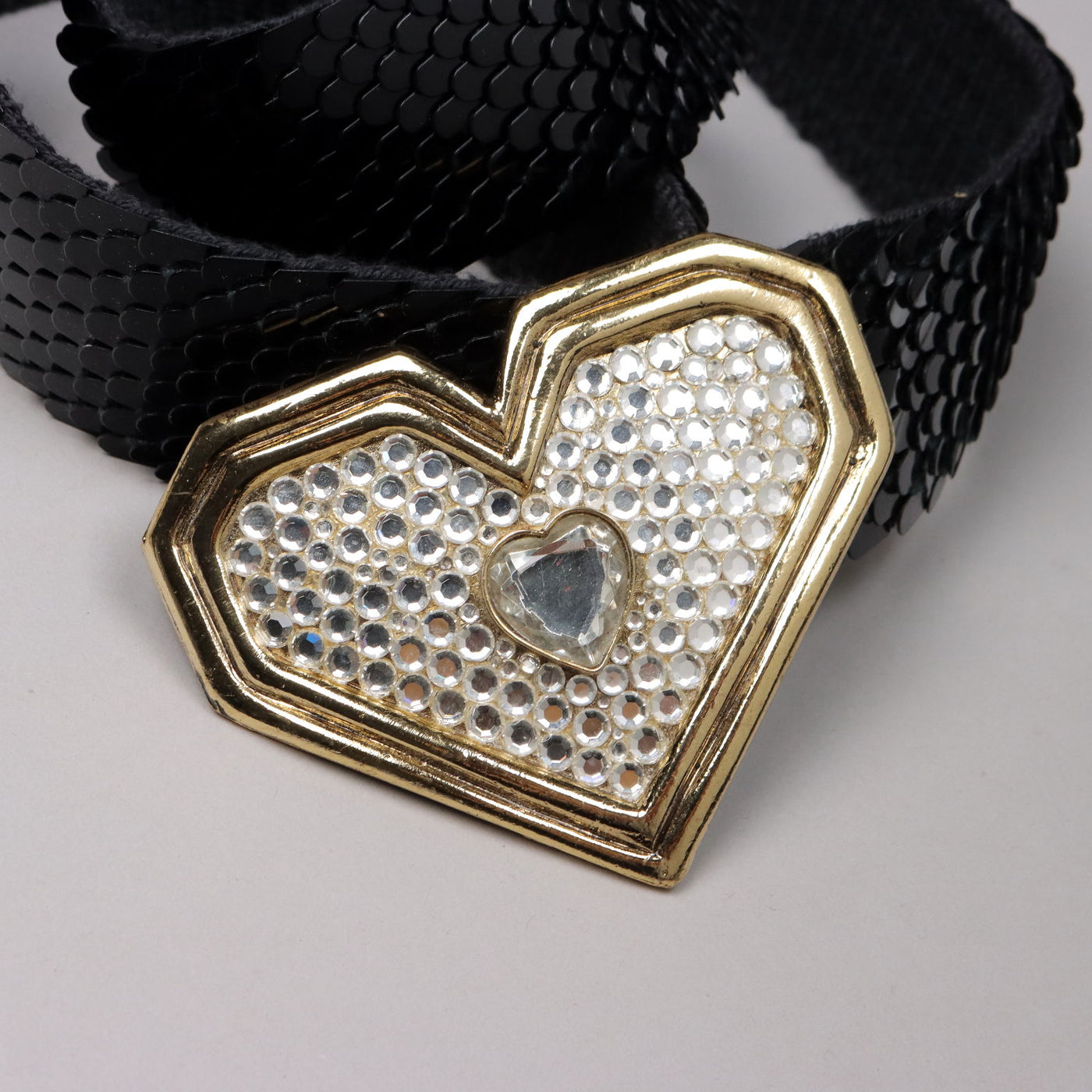 Belt from the 80s in elastic fabric, which allows it to be used on different types of size. It is covered with black plastic flakes; the flower-shaped golden metal buckle is worked with rhinestone applications. Vintage, vintage scraves, vintage scarf, vintage ties, vintage men's hats, vintage women's hats, vintage 1970s clothes, vintage 1960s clothes, 1950s vintage clothes, 1940s vintage dresses, vintage women's clothing, vintage bags, vintage objects, vintage clothing, vintage clothes, vintage shoes, vintage handbag, vintage belt, vintage clothes, accessories, earrings with pendants, vintage earring, 1960s scarf, 1950s scarf, 1940s scarf, 1980s objects, 1970s objects, vintage necklace.