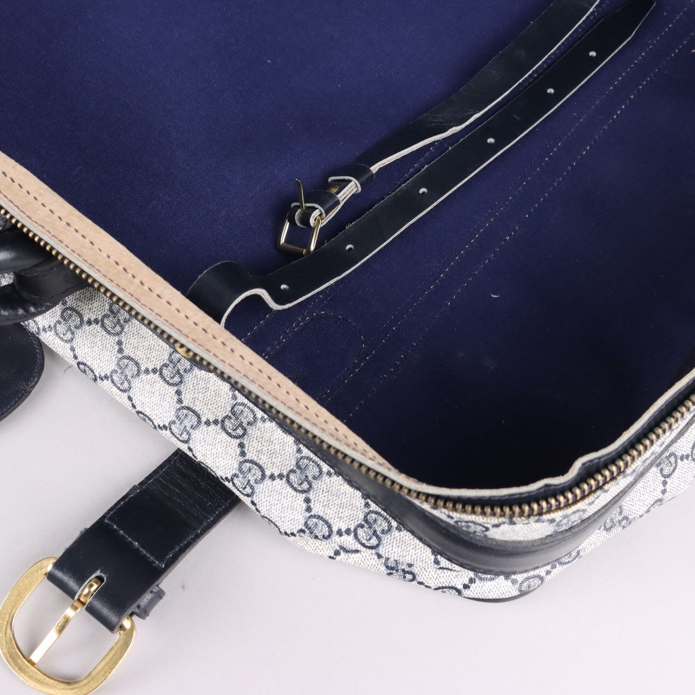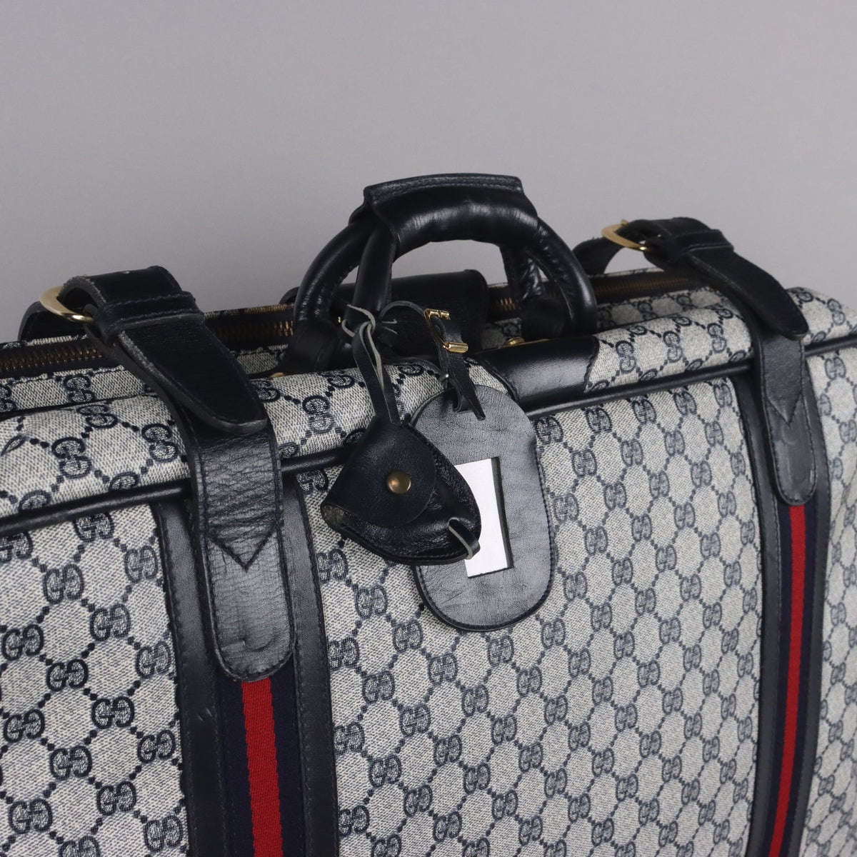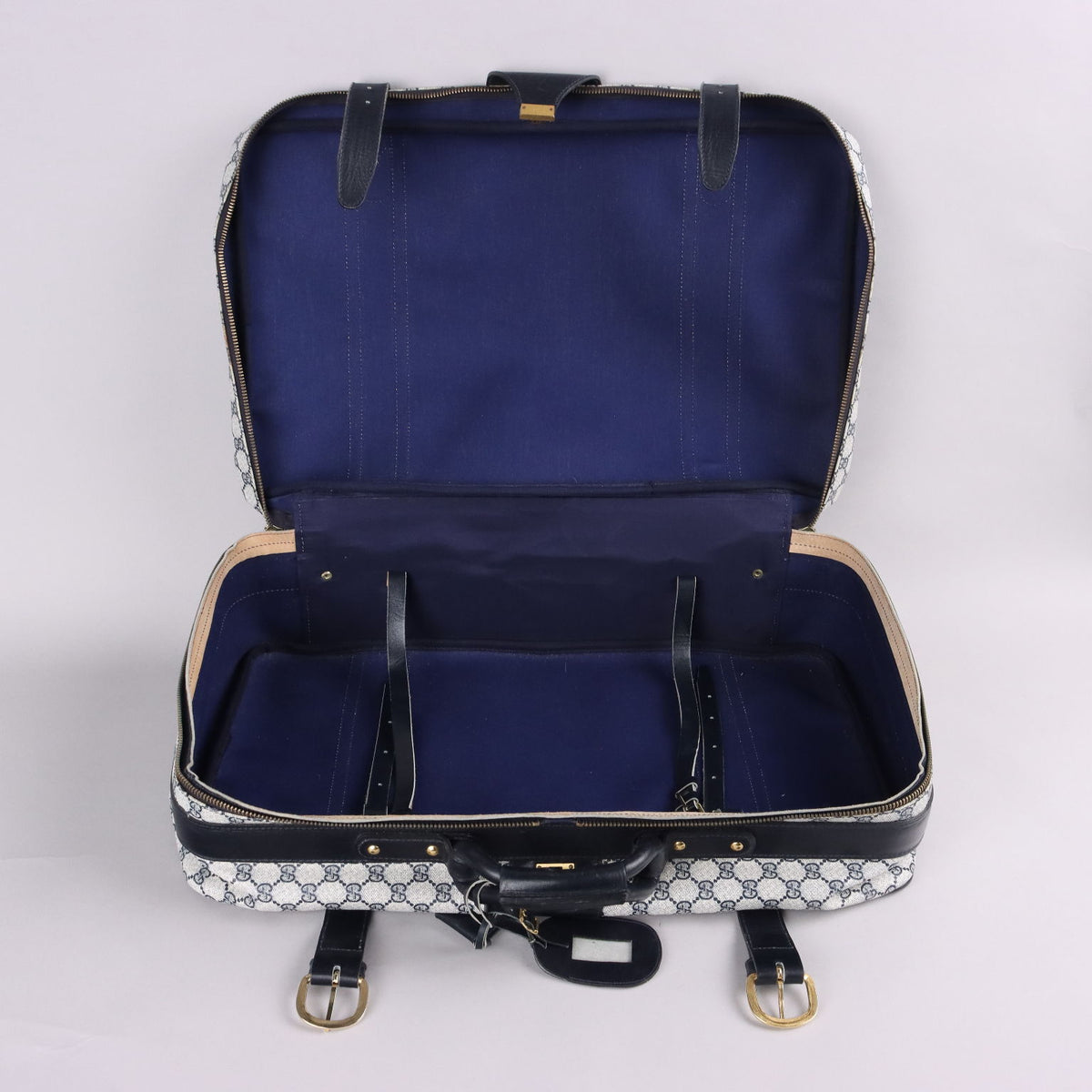 Travel bag signed by Gucci towards the end of the 1950s and very well preserved over time. It is in white and blue monogrammed canvas with dark blue leather trim. The two bands are in blue and red fabric. This is an item for collectors, but can also be used today. Vintage, vintage scraves, vintage scarf, vintage ties, vintage men's hats, vintage women's hats, vintage 1970s clothes, vintage 1960s clothes, 1950s vintage clothes, 1940s vintage dresses, vintage women's clothing, vintage bags, vintage objects, vintage clothing, vintage clothes, vintage shoes, vintage handbag, vintage belt, vintage clothes, suitcases, , used bags, second-hand bags, 1980s objects, 1970s objects, vintage dress, trunk.