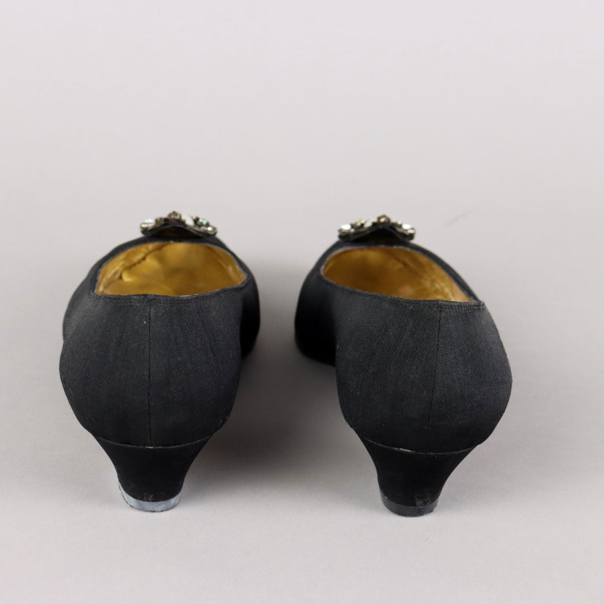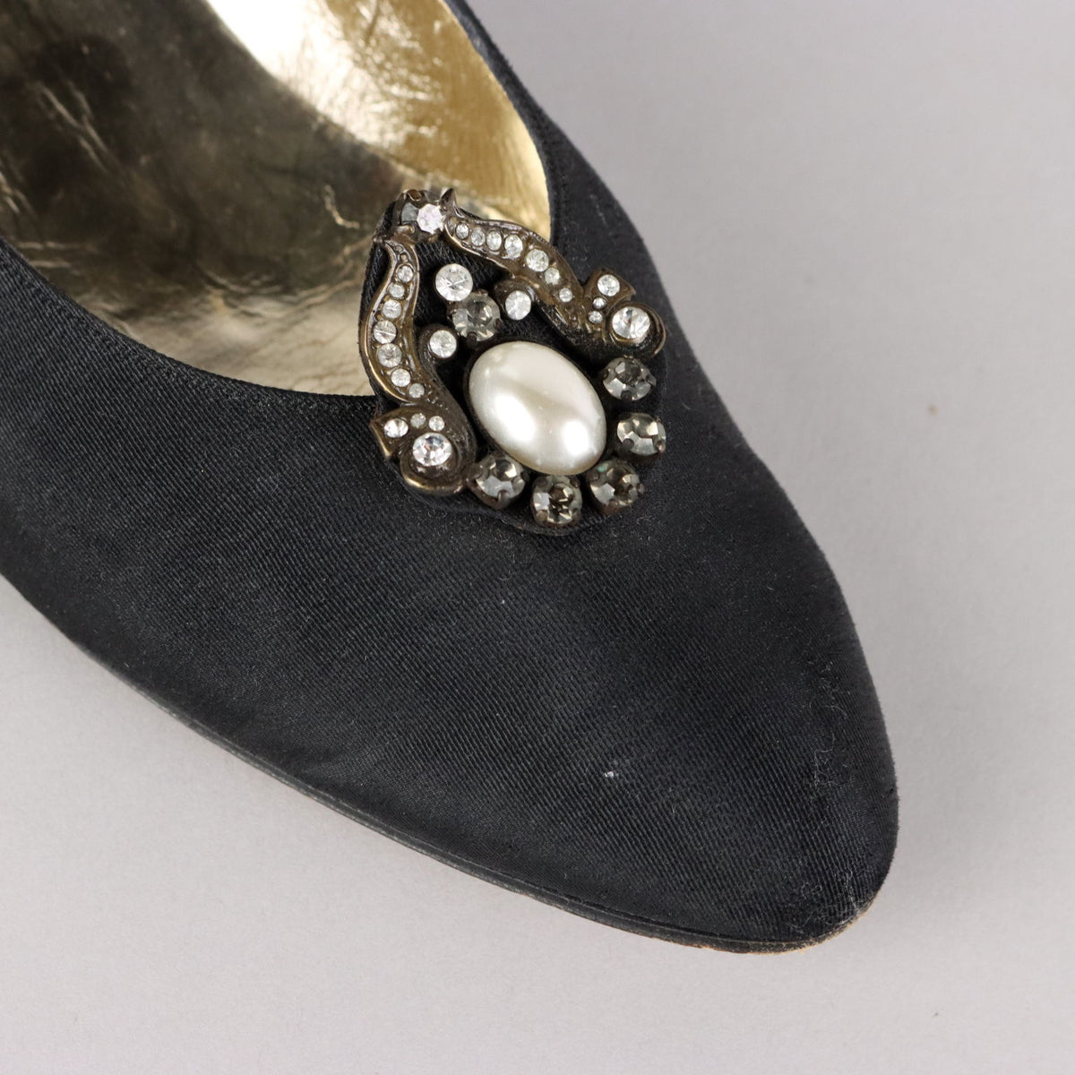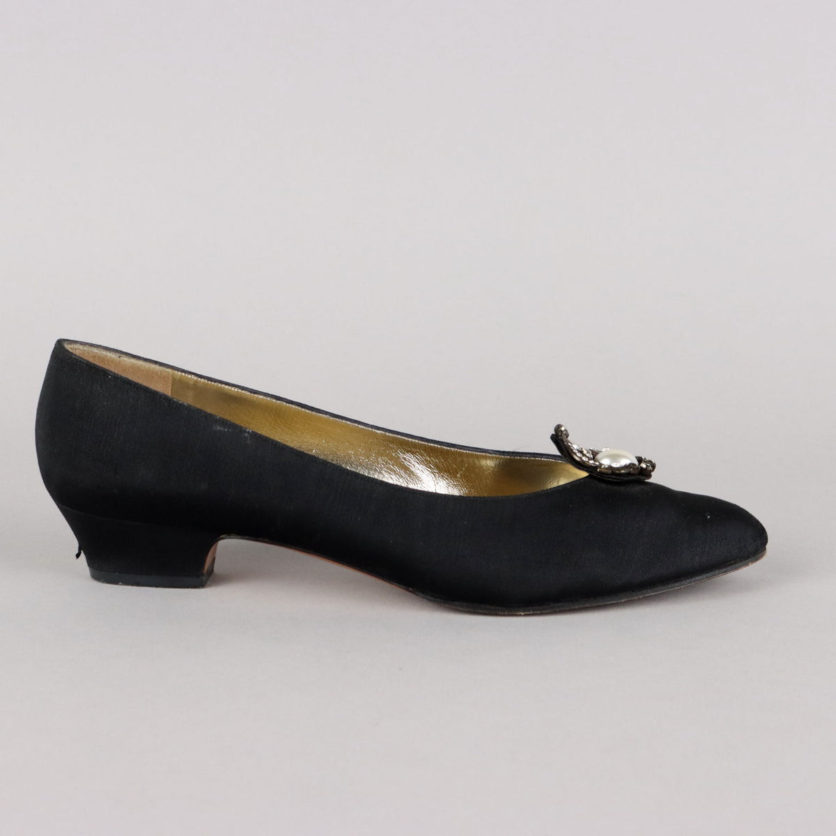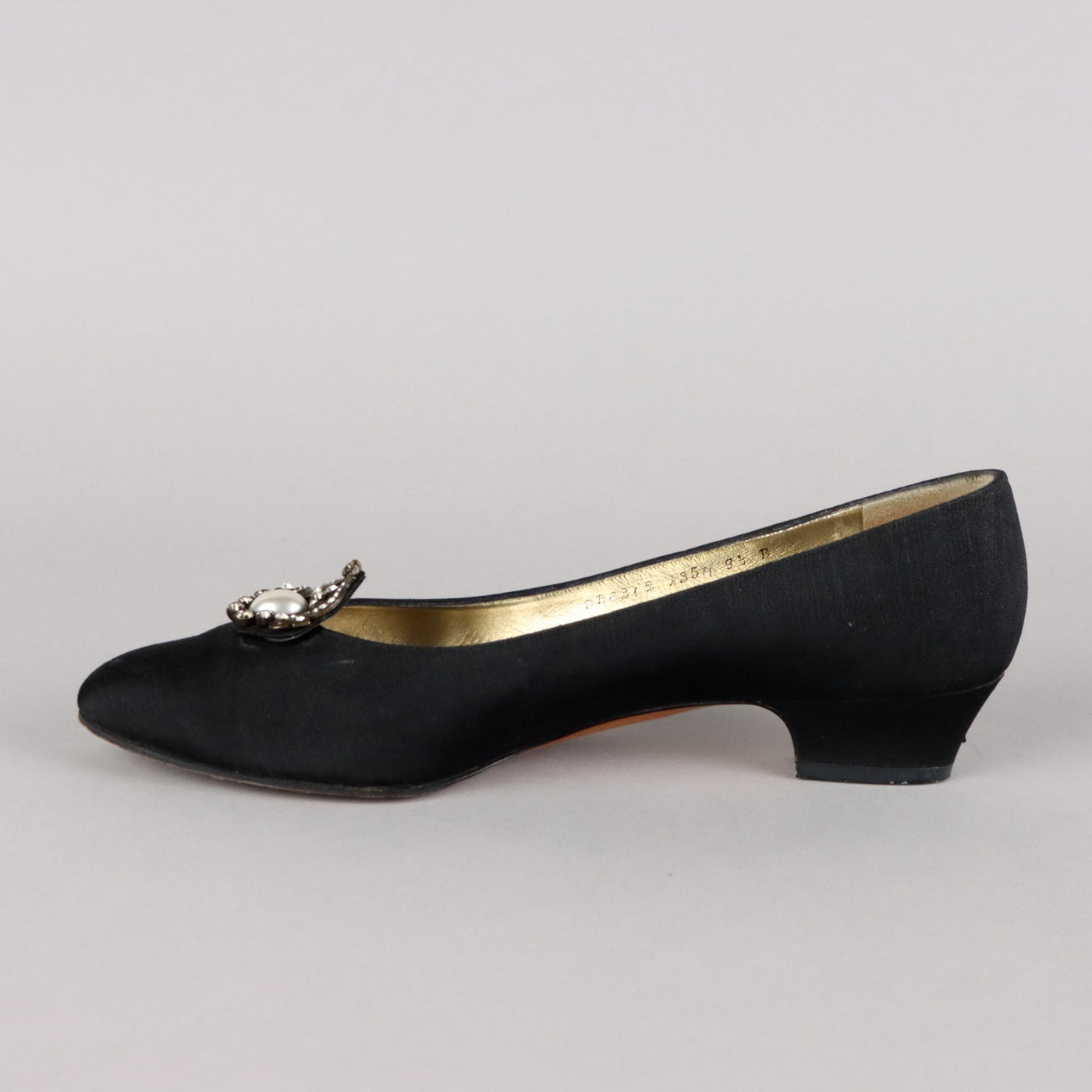 Black leather pumps covered in black satin, 3 centimeter heel, size 39. They are embellished with a rhinestone and pearl decoration. The conditions are good, they have small imperfections (a missing diamond and a mark on the heel. Vintage, vintage scraves, vintage scarf, vintage ties, vintage men's hats, vintage women's hats, vintage 1970s clothes, vintage 1960s clothes, 1950s vintage clothes, 1940s vintage dresses, vintage women's clothing, vintage bags, vintage objects, vintage clothing, vintage clothes, vintage shoes, vintage handbag, vintage belt, vintage clothes, shoes, , 1990s shoes, 1980s shoes, 1970s shoes, 1960s shoes, 1950s shoes, 1950s skirts, 1980s objects, 1970s objects.