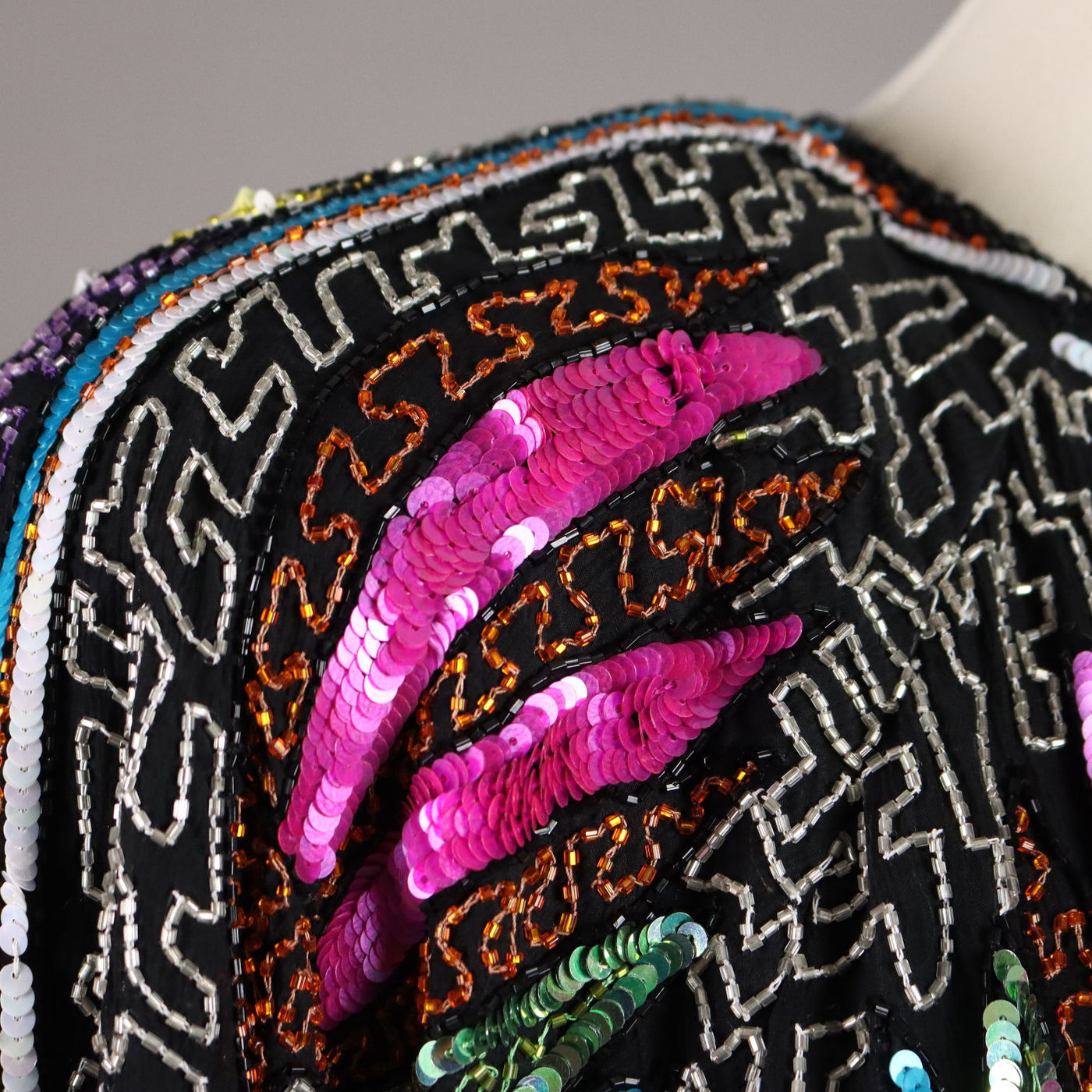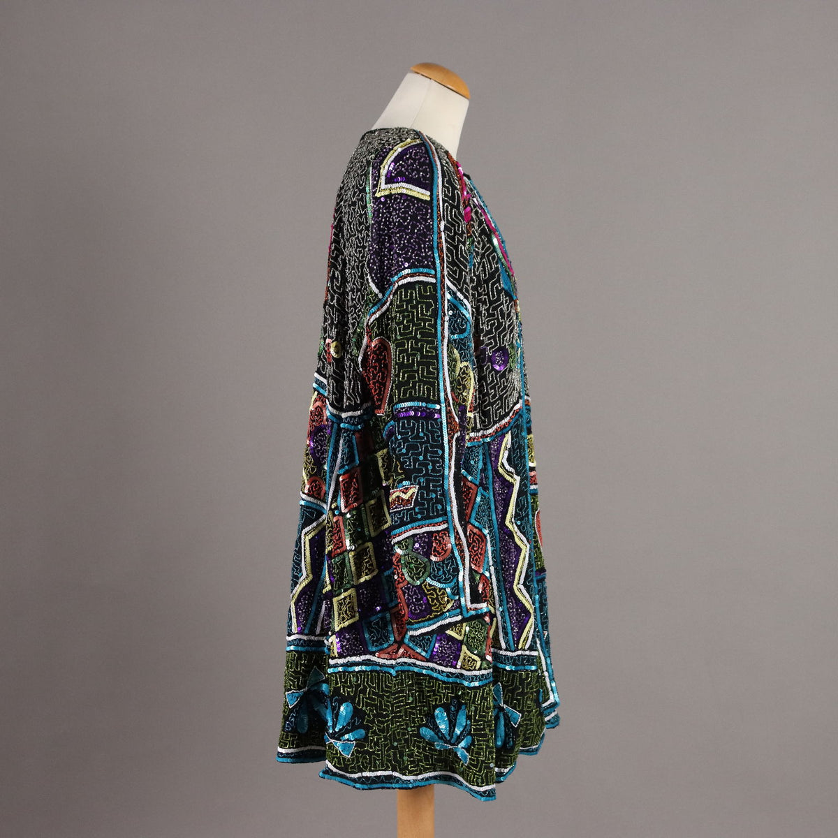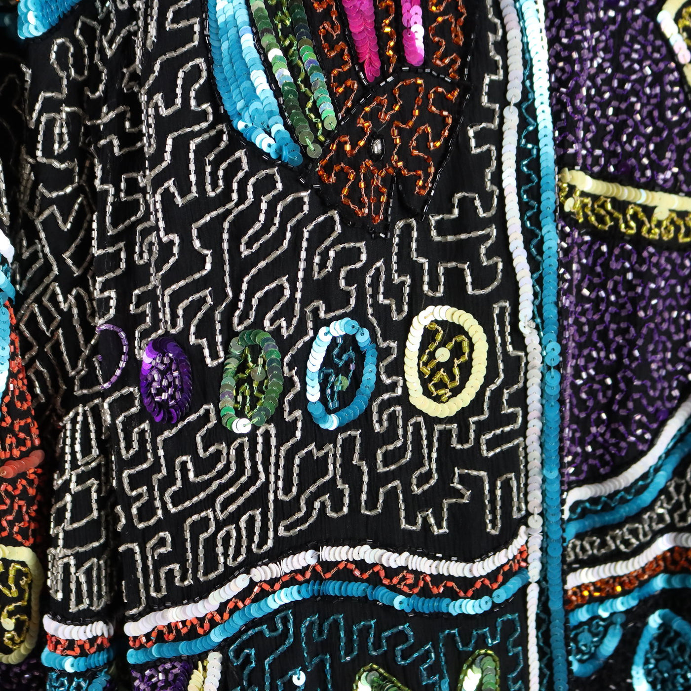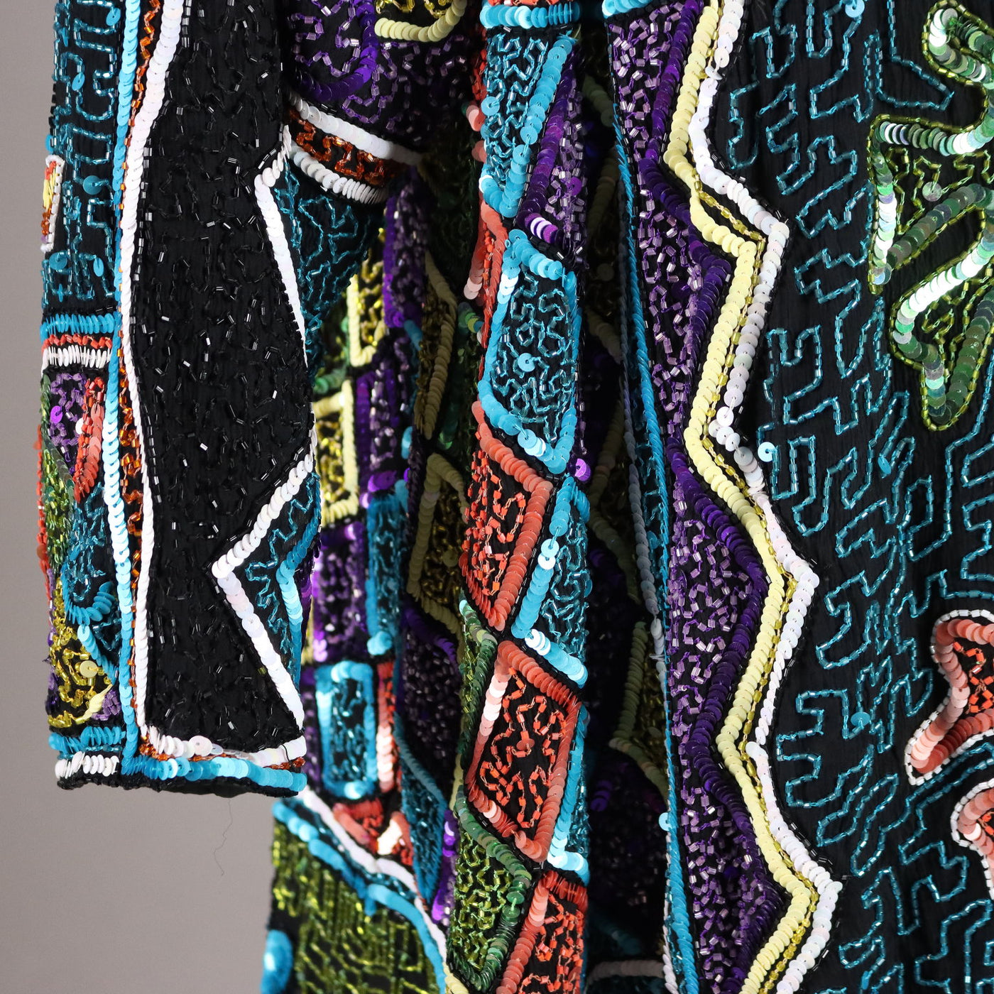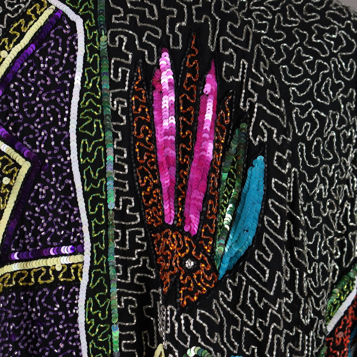 Tailored jacket richly hand embroidered with beads of various colors that form geometric designs. It dates back to the 80s and can be considered one size fits all: length 87 cm, shoulders cm Vintage, vintage scraves, vintage scarf, vintage ties, vintage men's hats, vintage women's hats, vintage 1970s clothes, vintage 1960s clothes, 1950s vintage clothes, 1940s vintage dresses, vintage women's clothing, vintage bags, vintage objects, vintage clothing, vintage clothes, vintage shoes, vintage handbag, vintage belt, vintage clothes, accessories, earrings with pendants, vintage earring, 1960s scarf, 1950s scarf, 1940s scarf, 1980s objects, 1970s objects, vintage necklace.