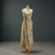 Evening dress in fabric worked with gold thread, tailored line, dating back to the 60s-70s. The size is XS (waist 60, breast 82, length 137). Vintage, vintage scraves, vintage scarf, vintage ties, vintage men's hats, vintage women's hats, vintage 1970s clothes, vintage 1960s clothes, 1950s vintage clothes, 1940s vintage dresses, vintage women's clothing, vintage bags, vintage objects, vintage clothing, vintage clothes, vintage shoes, vintage handbag, vintage belt, vintage clothes, accessories, earrings with pendants, vintage earring, 1960s scarf, 1950s scarf, 1940s scarf, 1980s objects, 1970s objects, vintage necklace.