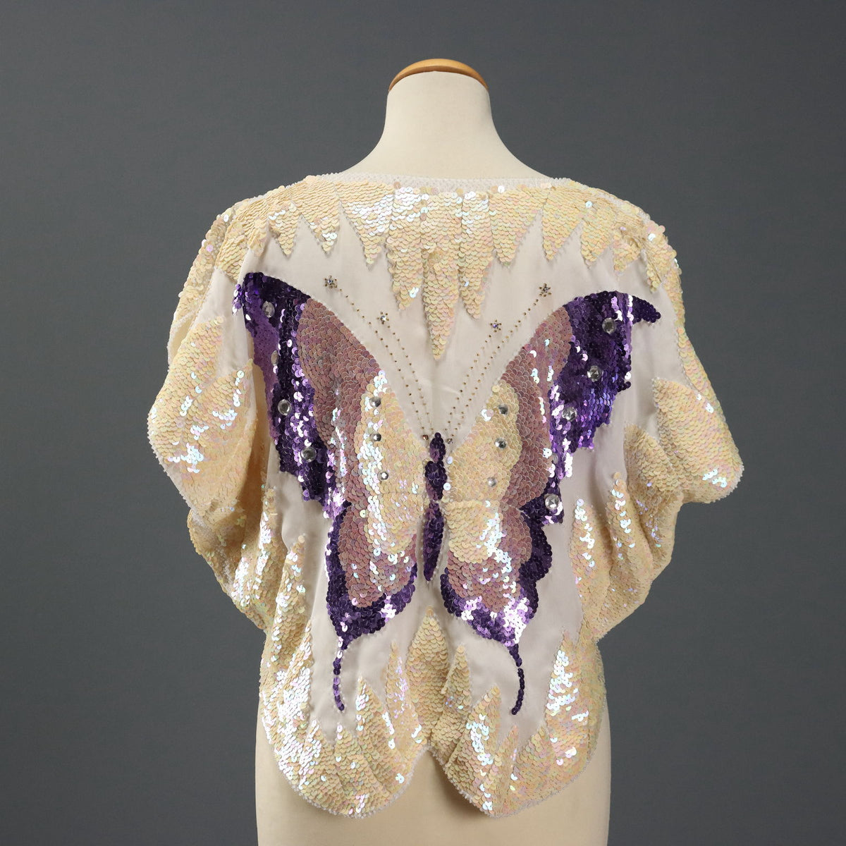T-shirt dating back to the 80s in lined tulle, worked entirely with colored sequins that form the figure of a butterfly and leaves. This is a unique piece with tailored workmanship. It can fit up to a size 50, but should be considered one size for its soft line (in centimeters length 55, waist 116, shoulders 49). Vintage, vintage scraves, vintage scarf, vintage ties, vintage men's hats, vintage women's hats, vintage 1970s clothes, vintage 1960s clothes, 1950s vintage clothes, 1940s vintage dresses, vintage women's clothing, vintage bags, vintage objects, vintage clothing, vintage clothes, vintage shoes, vintage handbag, vintage belt, vintage clothes, accessories, earrings with pendants, vintage earring, 1960s scarf, 1950s scarf, 1940s scarf, 1980s objects, 1970s objects, vintage necklace.