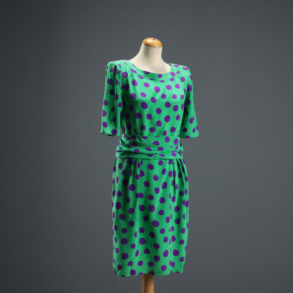 Pure silk cocktail dress by Ungaro for their women's line, featuring a purple polka dot print on a green background. Size 42, button fastening at the back, short sleeves, darts, and a removable matching belt (length 101 cm, waist 78 cm, shoulder 36 cm). The matching maxi silk scarf with a polka dot and check print measures 138 x 137 cm. Vintage, vintage scraves, vintage scarf, vintage ties, vintage men's hats, vintage women's hats, vintage 1970s clothes, vintage 1960s clothes, 1950s vintage clothes, 1940s vintage dresses, vintage women's clothing, vintage bags, vintage objects, vintage clothing, vintage clothes, vintage shoes, vintage handbag, vintage belt, vintage clothes, accessories, earrings with pendants, vintage earring, 1960s scarf, 1950s scarf, 1940s scarf, 1980s objects, 1970s objects, vintage necklace.