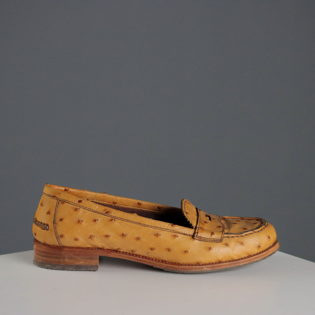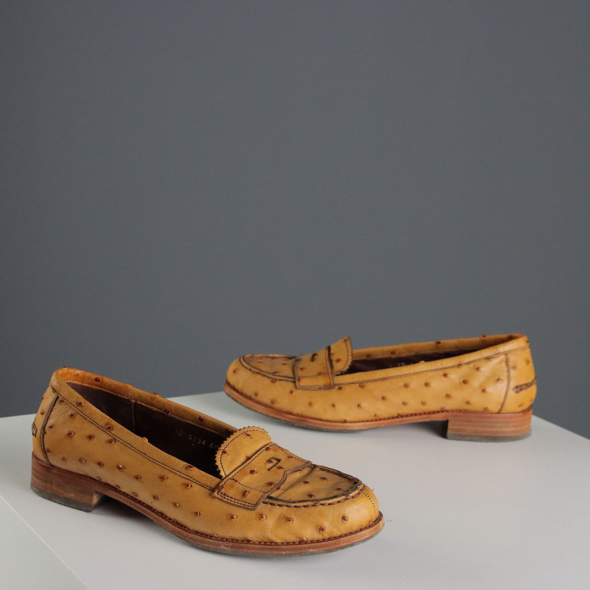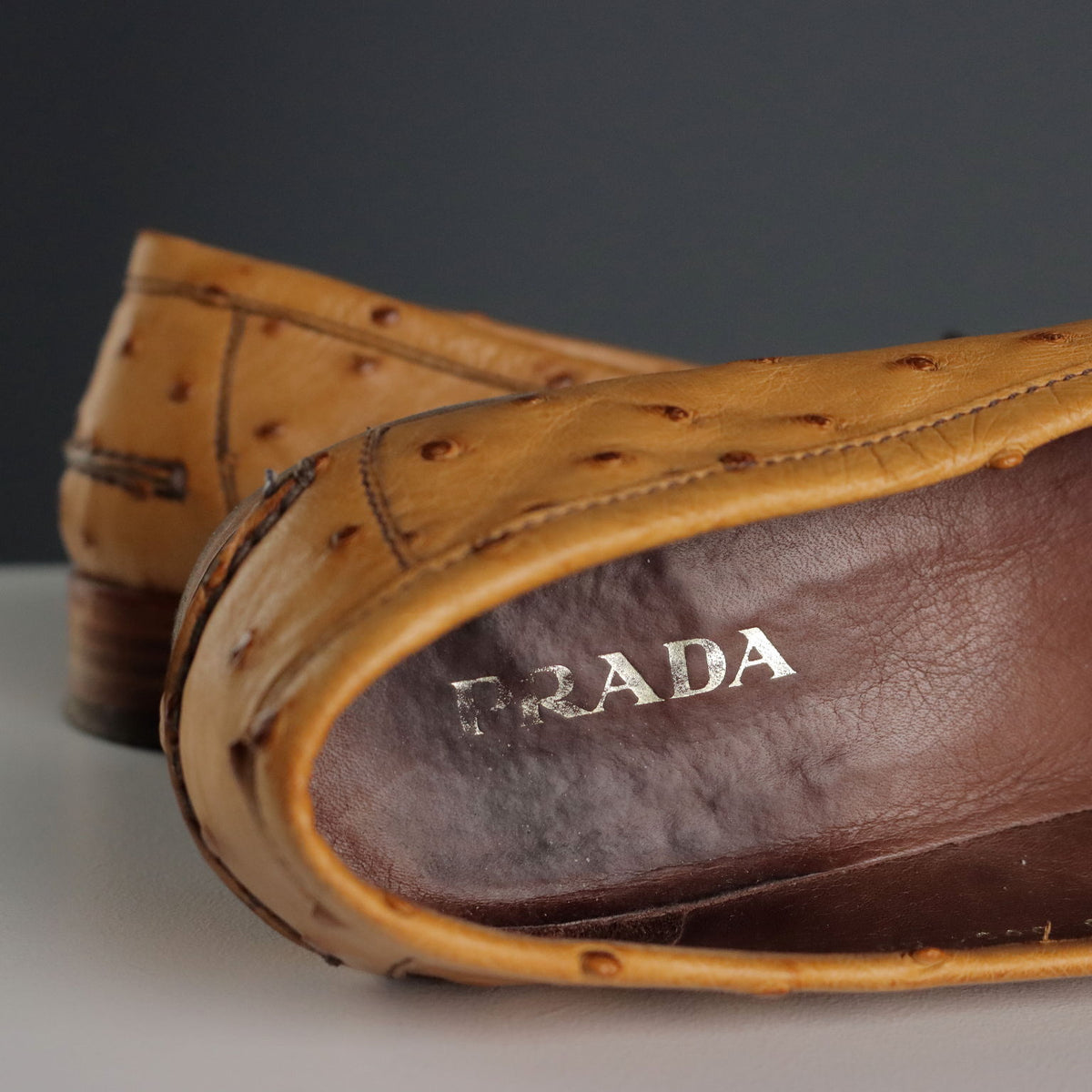 Prada mocassins from the 1990s, in dark ochre ostrich leather, size 40. Vintage, vintage scraves, vintage scarf, vintage ties, vintage men's hats, vintage women's hats, vintage 1970s clothes, vintage 1960s clothes, 1950s vintage clothes, 1940s vintage dresses, vintage women's clothing, vintage bags, vintage objects, vintage clothing, vintage clothes, vintage shoes, vintage handbag, vintage belt, vintage clothes, clothing, vintage elegant clothes, 1970s vintage clothes, 1960s vintage clothes, 1950s dresses, 1950s clothing, 1940s clothing, 1990s clothing, 1980s clothing, 1970s clothing, 1960s clothing, 2000s clothing.