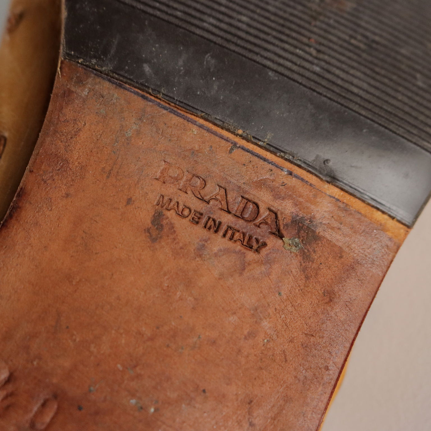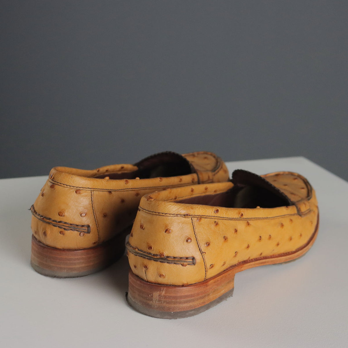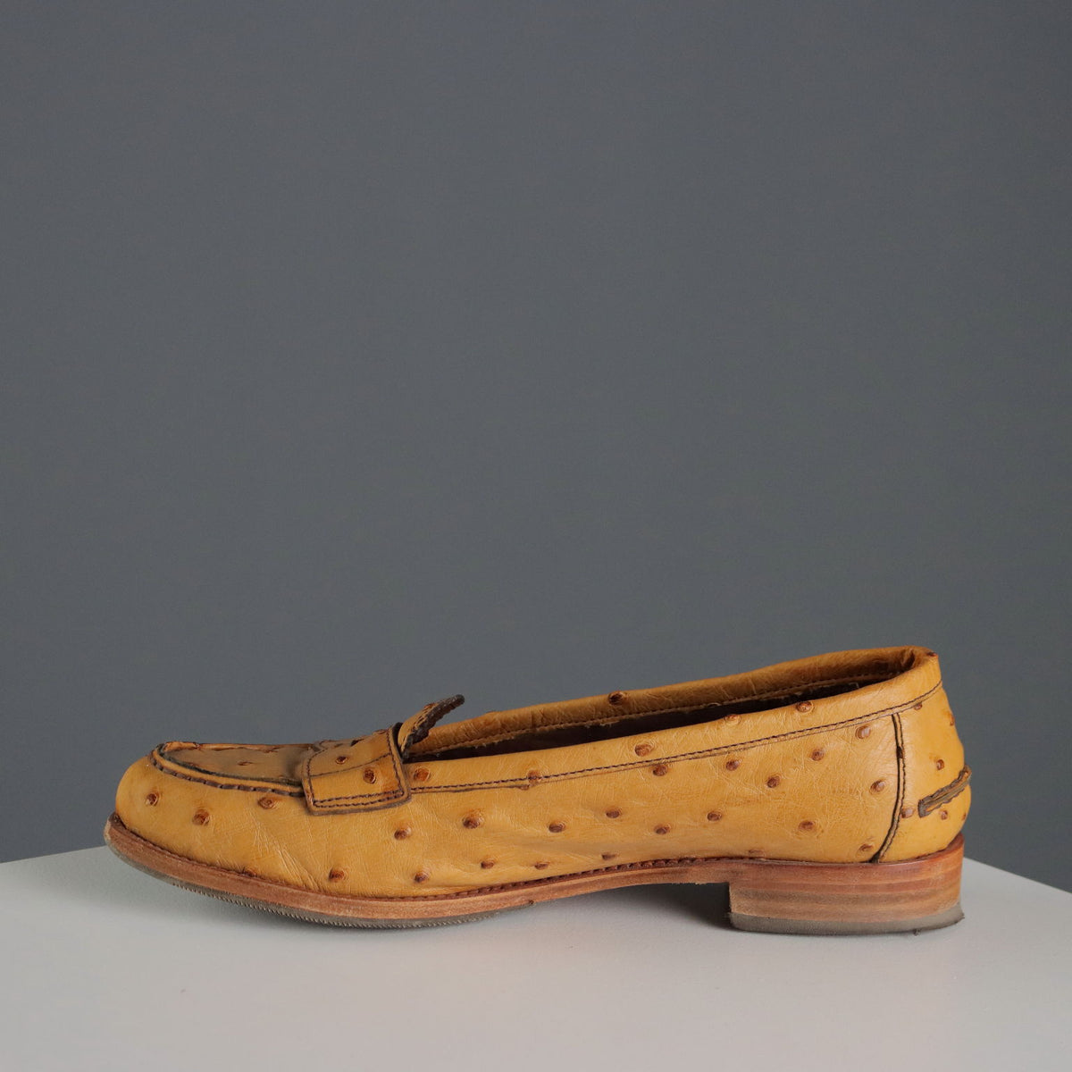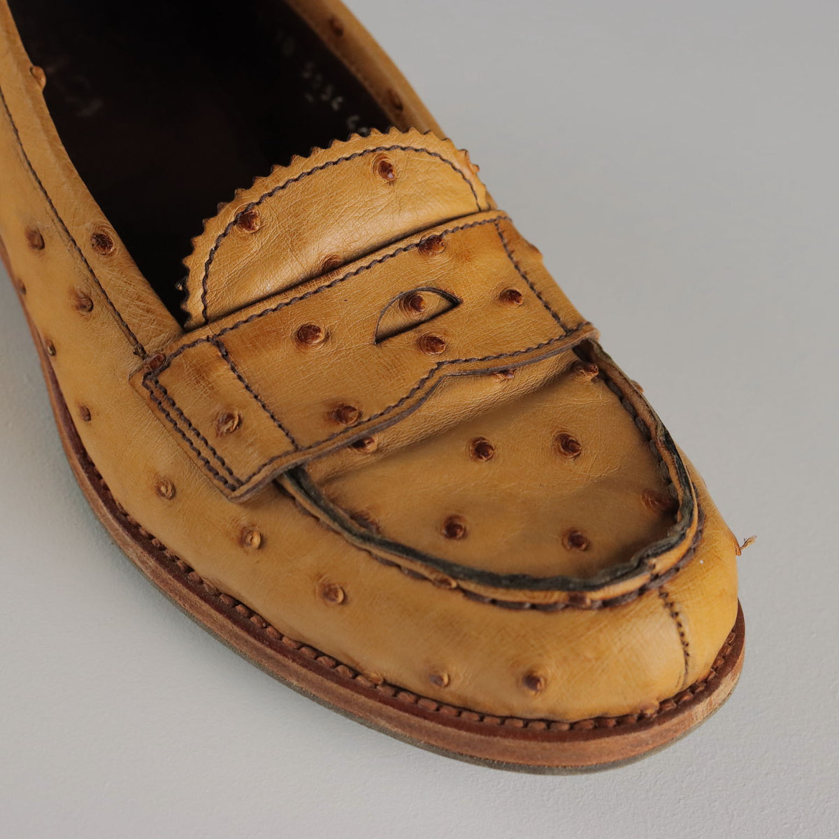 Prada mocassins from the 1990s, in dark ochre ostrich leather, size 40. Vintage, vintage scraves, vintage scarf, vintage ties, vintage men's hats, vintage women's hats, vintage 1970s clothes, vintage 1960s clothes, 1950s vintage clothes, 1940s vintage dresses, vintage women's clothing, vintage bags, vintage objects, vintage clothing, vintage clothes, vintage shoes, vintage handbag, vintage belt, vintage clothes, clothing, vintage elegant clothes, 1970s vintage clothes, 1960s vintage clothes, 1950s dresses, 1950s clothing, 1940s clothing, 1990s clothing, 1980s clothing, 1970s clothing, 1960s clothing, 2000s clothing.