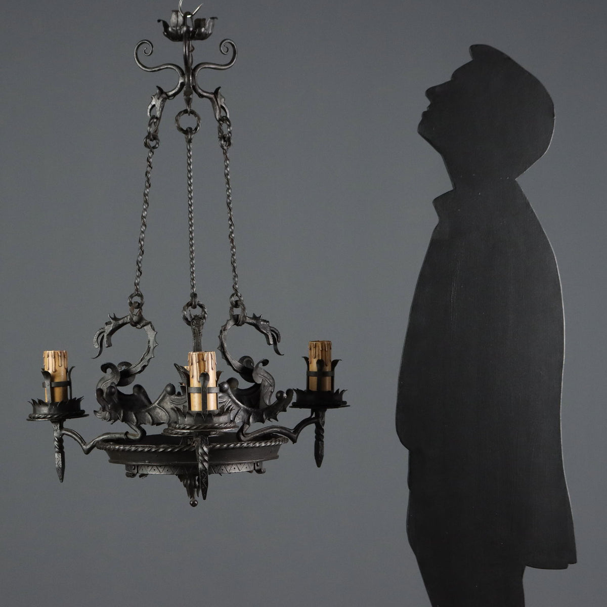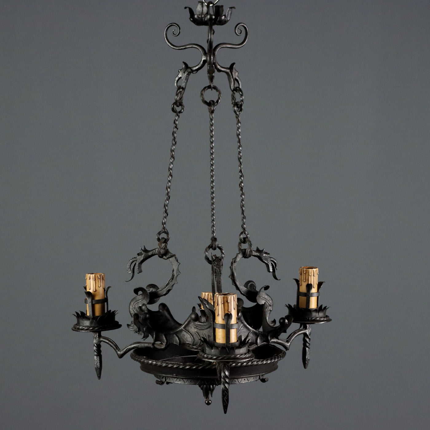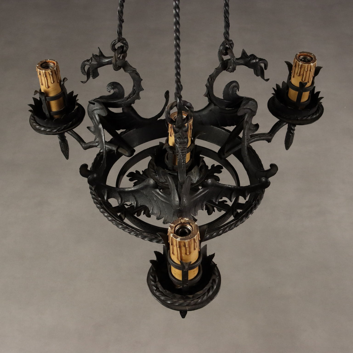 Neo-Renaissance style chandelier in wrought iron, four lights, one central and three on curved arms. Three dragons support the central body with leafy decorations. Four E14 bulbs. Italy, early 20th century. Ceiling lamp, oil lamp, lantern, chandelier, ceiling lamp.