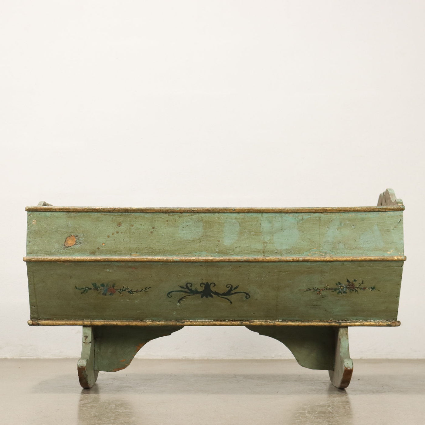 Cradle in lacquered poplar wood, 20th century Italy. Adorned with golden moldings and painted floral elements. Deficiencies in the lacquering and gilding. Other antiques.