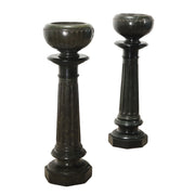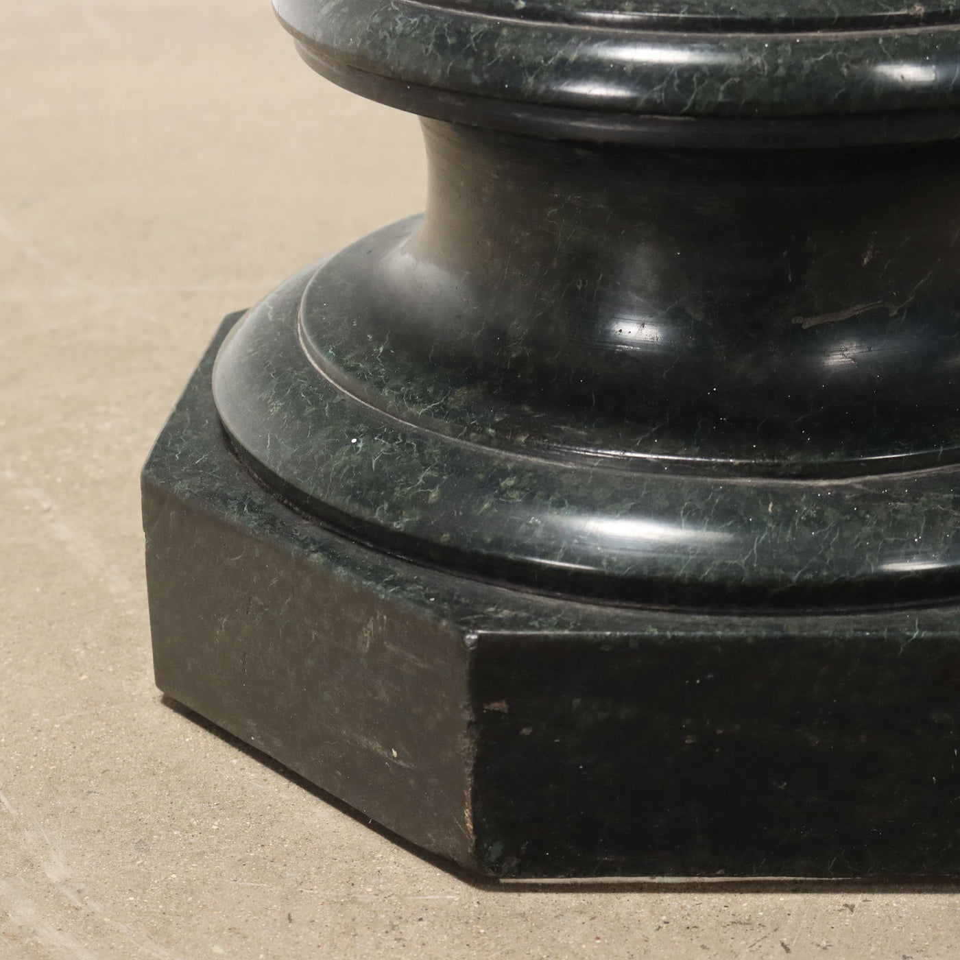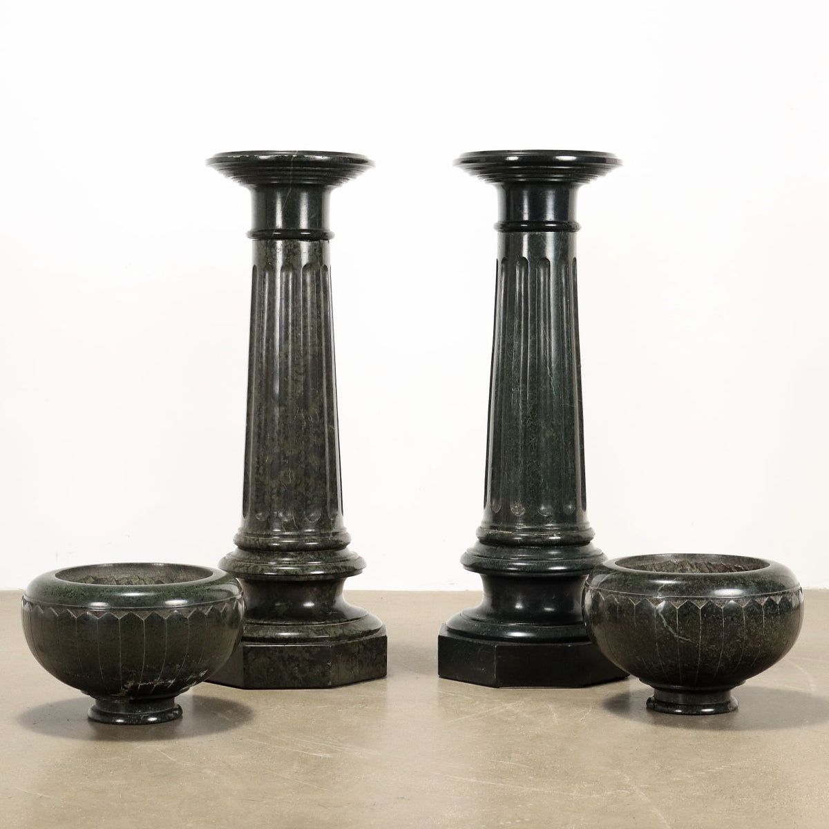 Pair of classical columns, with turned capitals and fluted body in green serpentine marble, surmounted by two cups carved on the outside with arrow motifs. Chips and missing parts. Other ancient cabinets, , cabinets antiques, ancient cabinets, trunks, chest.