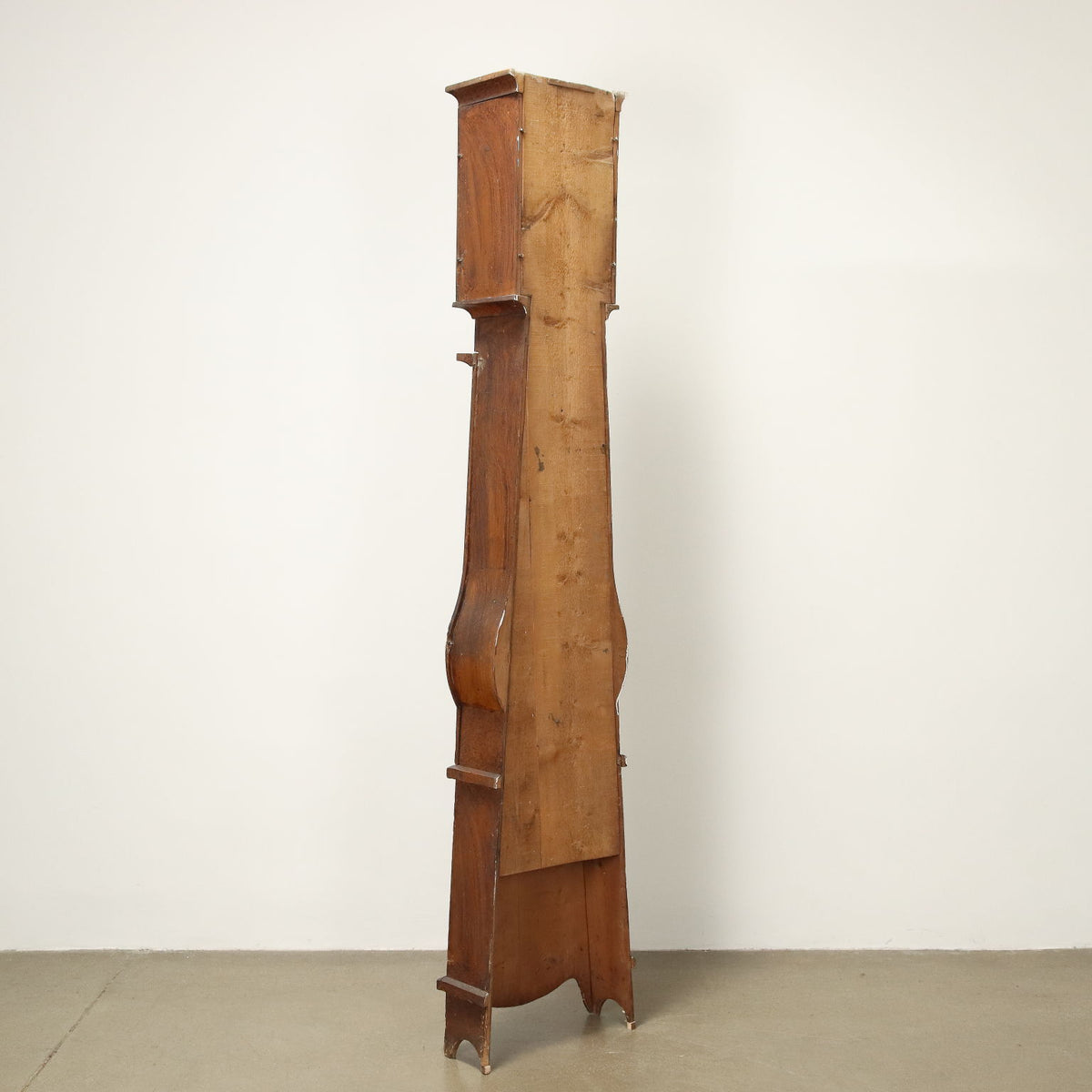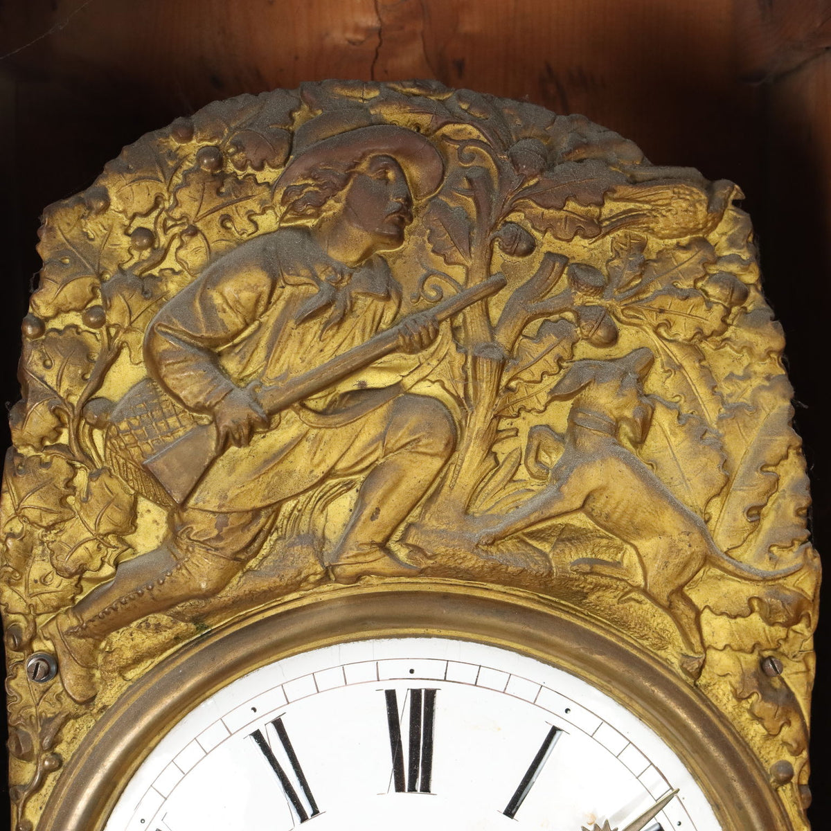 Tower clock from the late 19th century, called 'morbier'. It is made of fir painted in fake wood with floral designs, with the typical mandolin shape, the clock has the typical dial surmounted by a decorative motif made of embossed and gilded sheet metal, in this case, depicting a hunter with a dog. The face is enameled with the hours in Roman numerals, contemporary pendulum and weights. Other ancient cabinets, , cabinets antiques, ancient cabinets, trunks, chest.