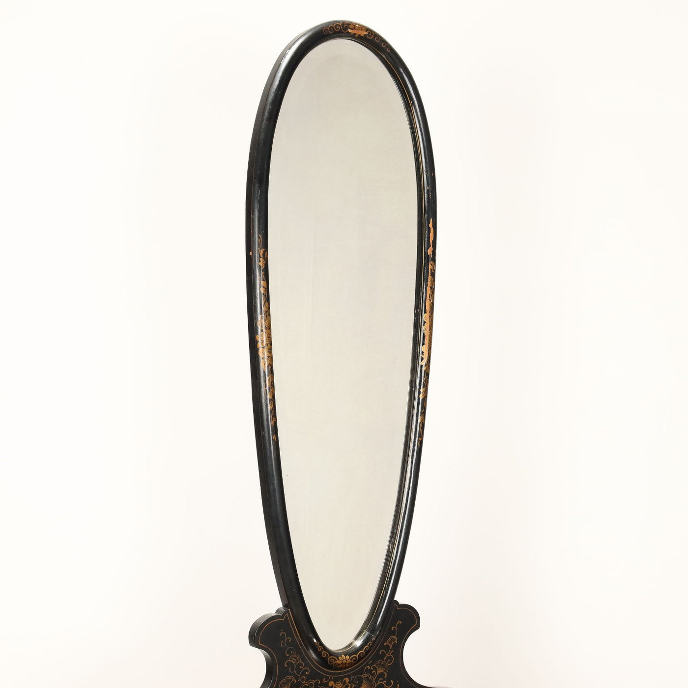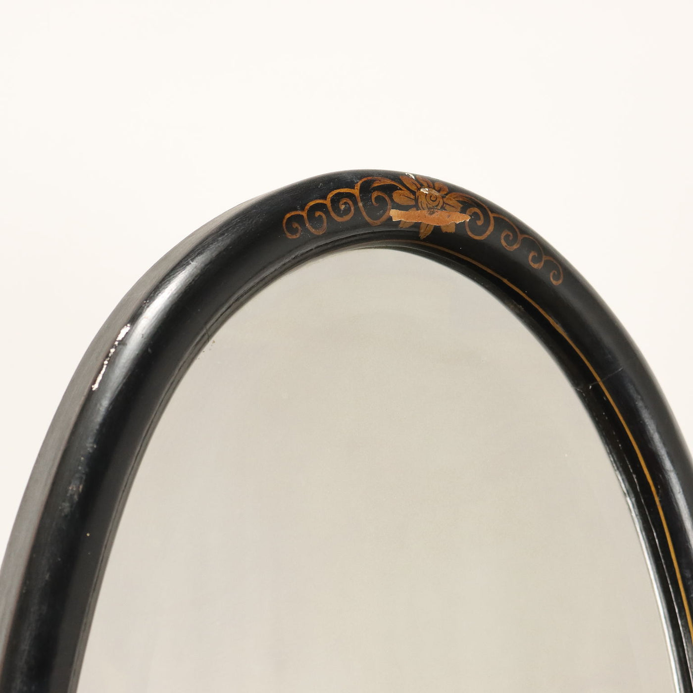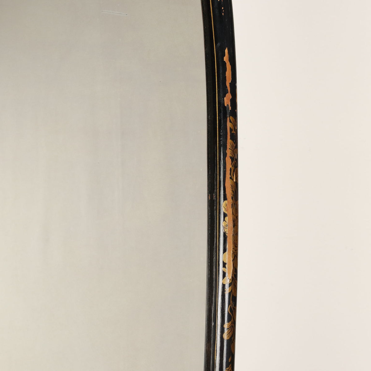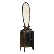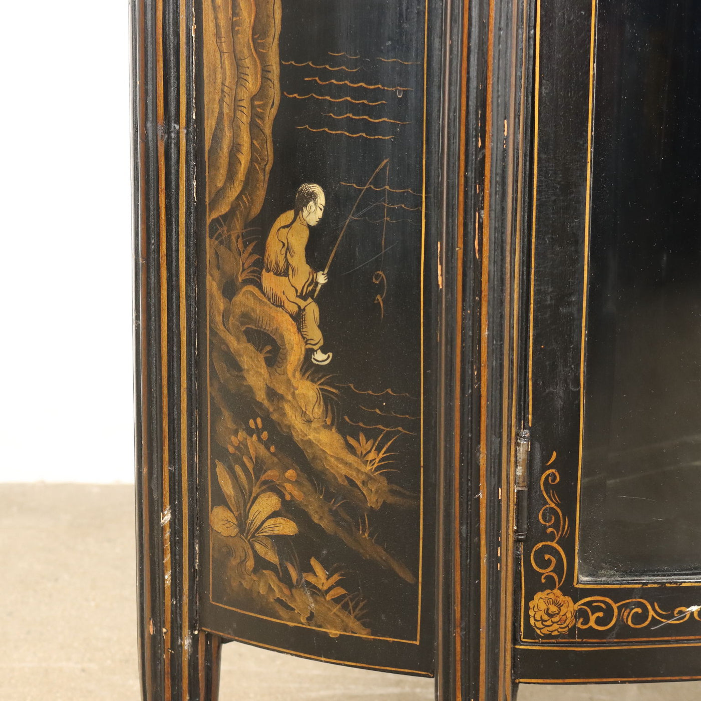 Half moon display cabinet with finely ebonized and gold-painted mirror with chinoiserie motifs, beveled glass and mirror. Italy, 20th century. Showcases, showcase, case, small showcase, shelf, cabinet, bookcase.