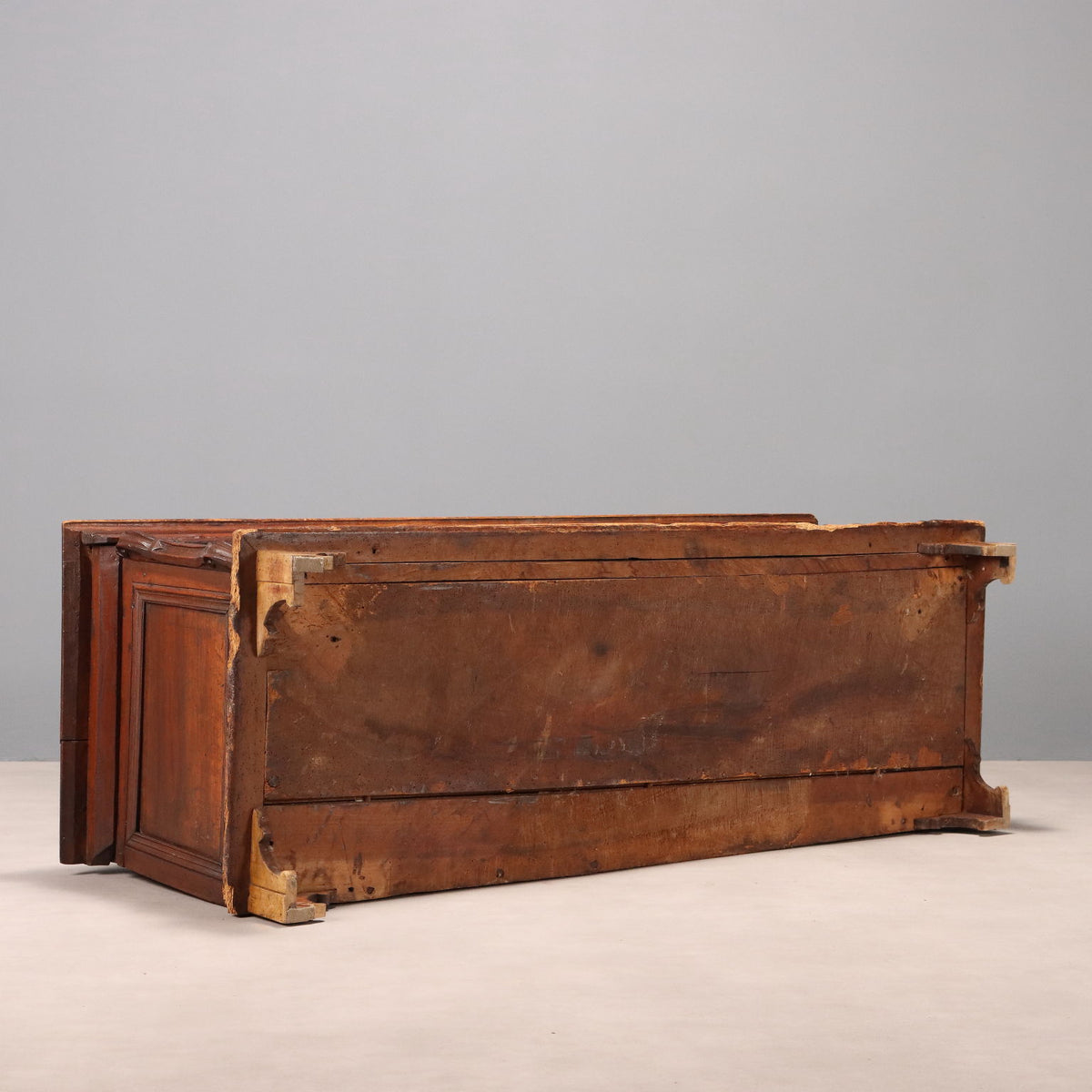Walnut chest, bipartite and paneled front, 45-degree uprights carved with scrolls, bracket feet. Italy, early 19th century. cabinets antiques, ancient cabinets, small bench, bench, other ancient cabinets, trunks, chest.