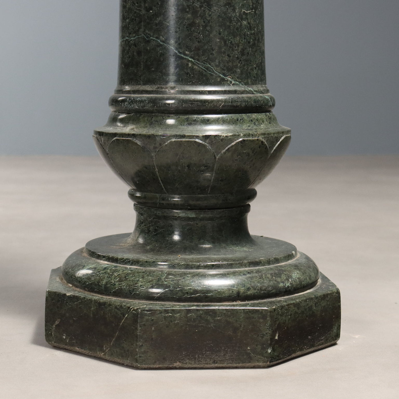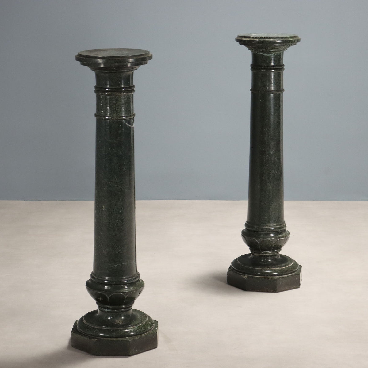 Pair of turned green marble columns, hexagonal base and round capital. One column has chipping and repairs. Italy, early 20th century. Other ancient cabinets, , cabinets antiques, ancient cabinets, trunks, chest.