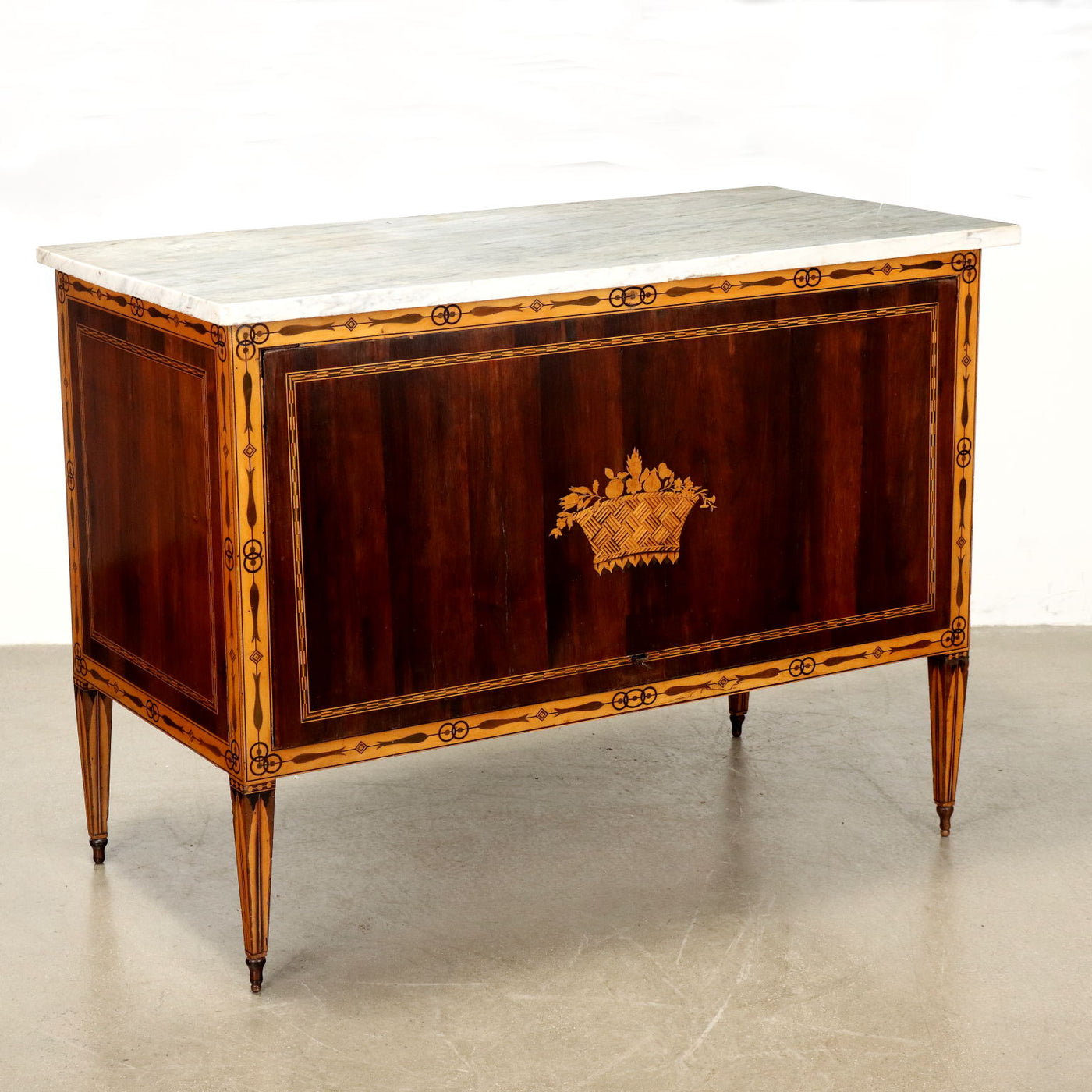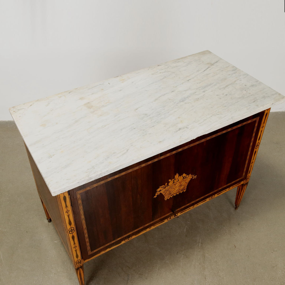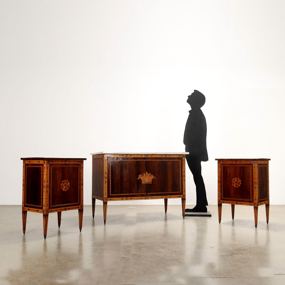 Tuscan neoclassical suite, consisting of a chest of drawers and two bedside tables. The chest of drawers has a disappearing door that hides three drawers with bronze pulls inside, the bedside tables with a drop-down top and an opening door hide the compartments where the toilet ceramics were housed. Tall truncated pyramid legs ending with elegant turnings and inlaid with maple and Indian walnut in the shape of leaves, support the furniture veneered in dark Indian walnut with inlaid borders in maple, boxwood, chestnut with geometric motifs, in the center of the door of the bedside tables a rosette is inlaid, on the door of the chest of drawers a basket of flowers; the tops of the bedside tables have white marble set in an inlaid border of various woods on the chest of drawers instead it is simply supported. Filaments on the marbles of the bedside tables. Original hardware. In plate XXX of the "Furniture Warehouse ...." there is a model of chest of drawers similar in colour and which has a door not divided into drawers. chest of drawers, cabinet, bedroom cabinet, chest of drawers.