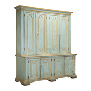 Baroque double body sideboard, supported by carved shelf feet, in the lower part it has four doors with tiles, also in the upper part there are four degrees doors, here decorated with characteristic tiles. Entirely lacquered in blue. kitchen cabinet, wardrobe, cabinet, pantry, cupboard, chest.
