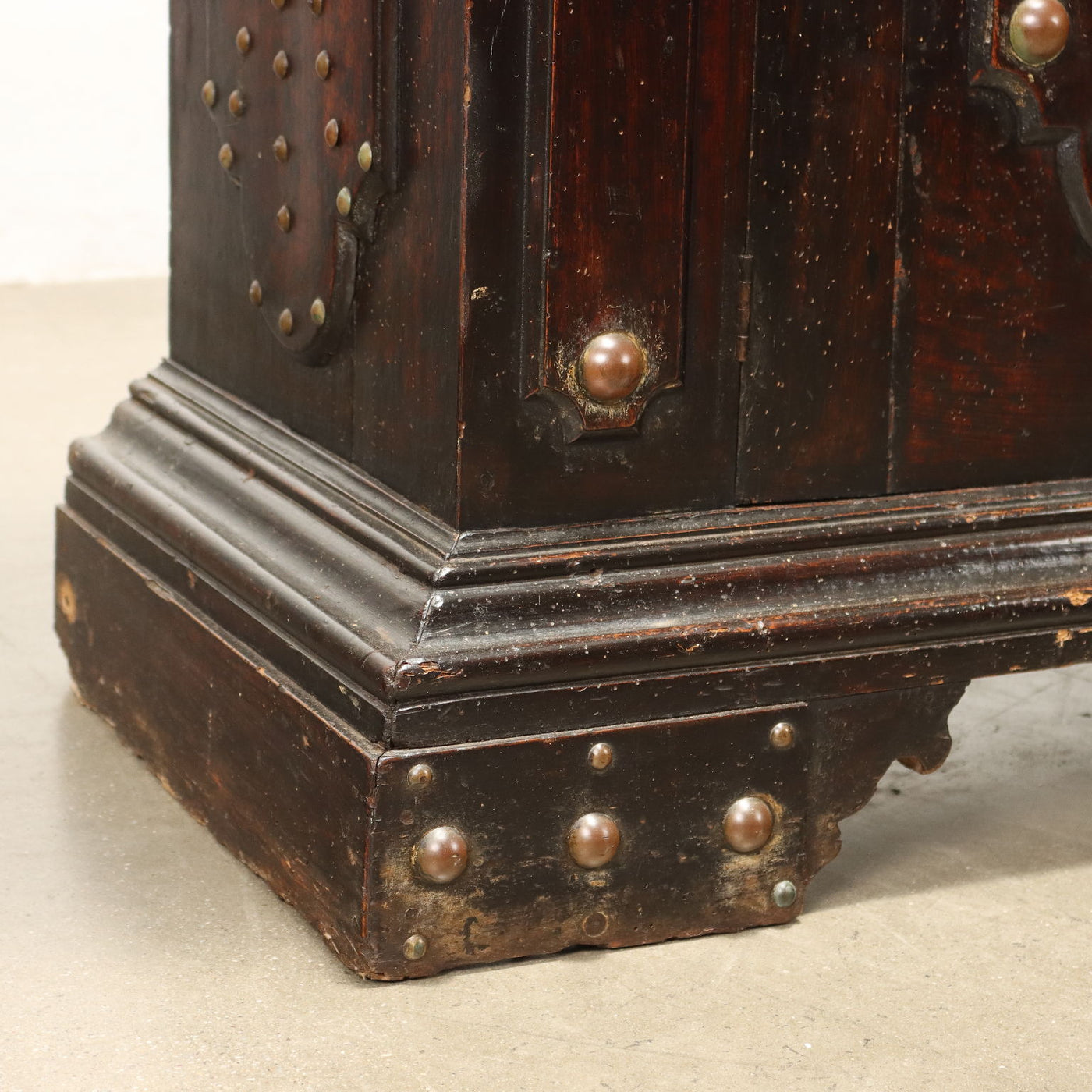 Cupboard with walnut upper part in Emilian baroque style made with ancient woods, Italy, early 20th century. Removable top, with band hosting a pair of drawers. The upper part is connected, via four turned bases, to the sideboard, the latter equipped with two doors on the front and shelf feet. The piece of furniture is also embellished with tiles and metal studs. Poplar and fir interior. kitchen cabinet, wardrobe, cabinet, pantry, cupboard, chest.