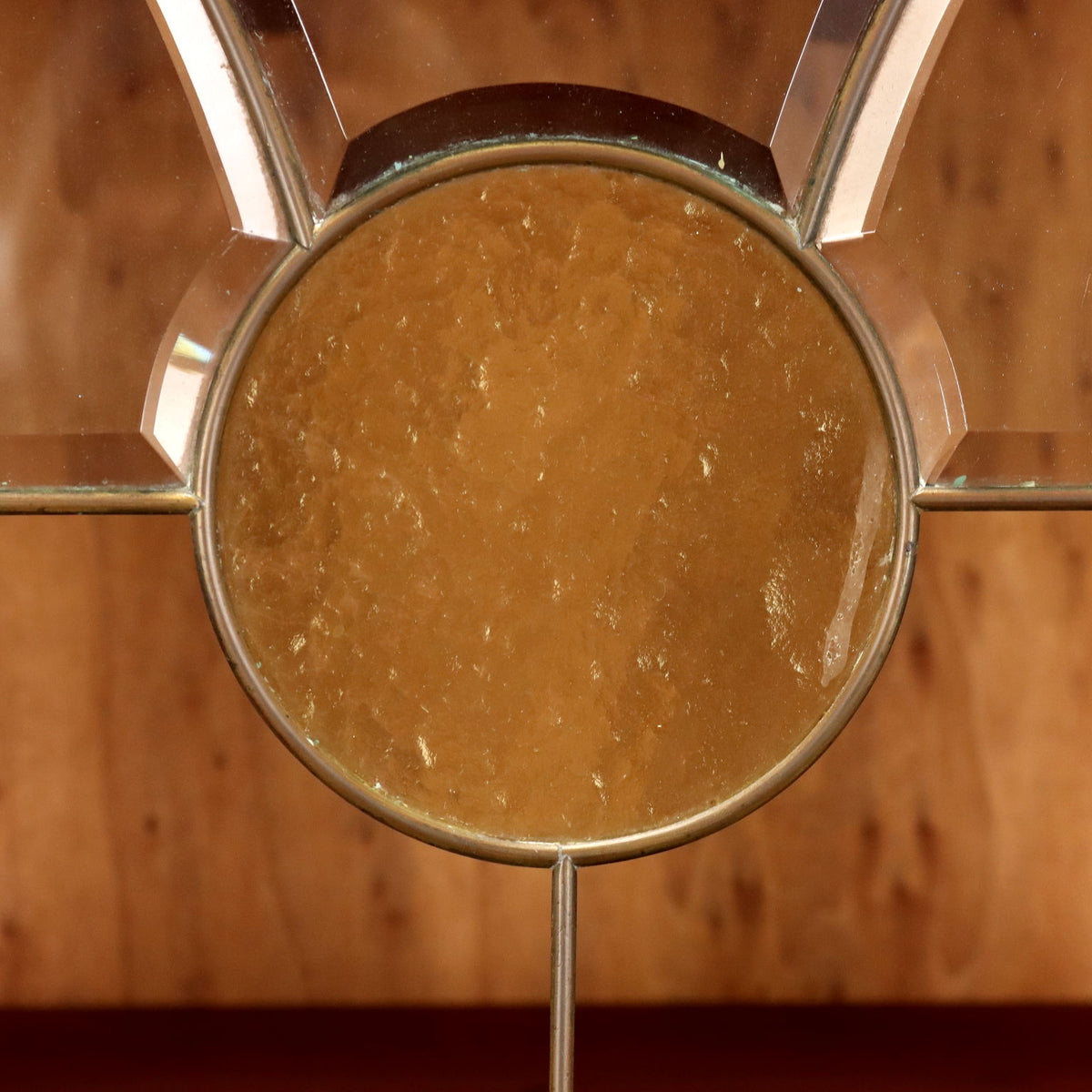 Art Nouveau oak display cabinet, quadripartite front with pair of central doors with stained glass cathedral glass, milk glass and chamfered transparent glass, lower panels and upper band with carvings of stylised floral motifs. Missing glass. Italy, early 20th century. kitchen cabinet, wardrobe, cabinet, pantry, cupboard, chest.
