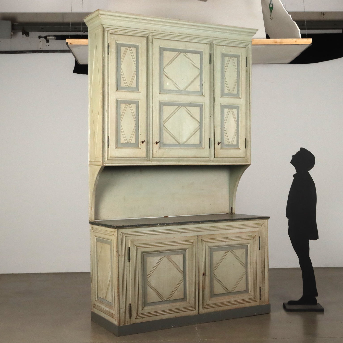 Double-top cupboard from the late 18th century, Lombardy. Made of fir and lacquered in beige and grey with a black top. Two doors in the base and three in the upper part with diamond-shaped carved panels, bayonet hinges, antique hardware. kitchen cabinet, wardrobe, cabinet, pantry, cupboard, chest.