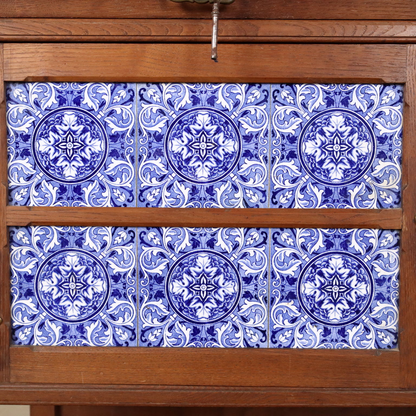 Art Nouveau cupboard, two-drawer front, two doors with decorative tiles and open compartments, top with two shelf-support columns. Small missing parts. Italy, early 20th century. kitchen cabinet, wardrobe, cabinet, pantry, cupboard, chest.