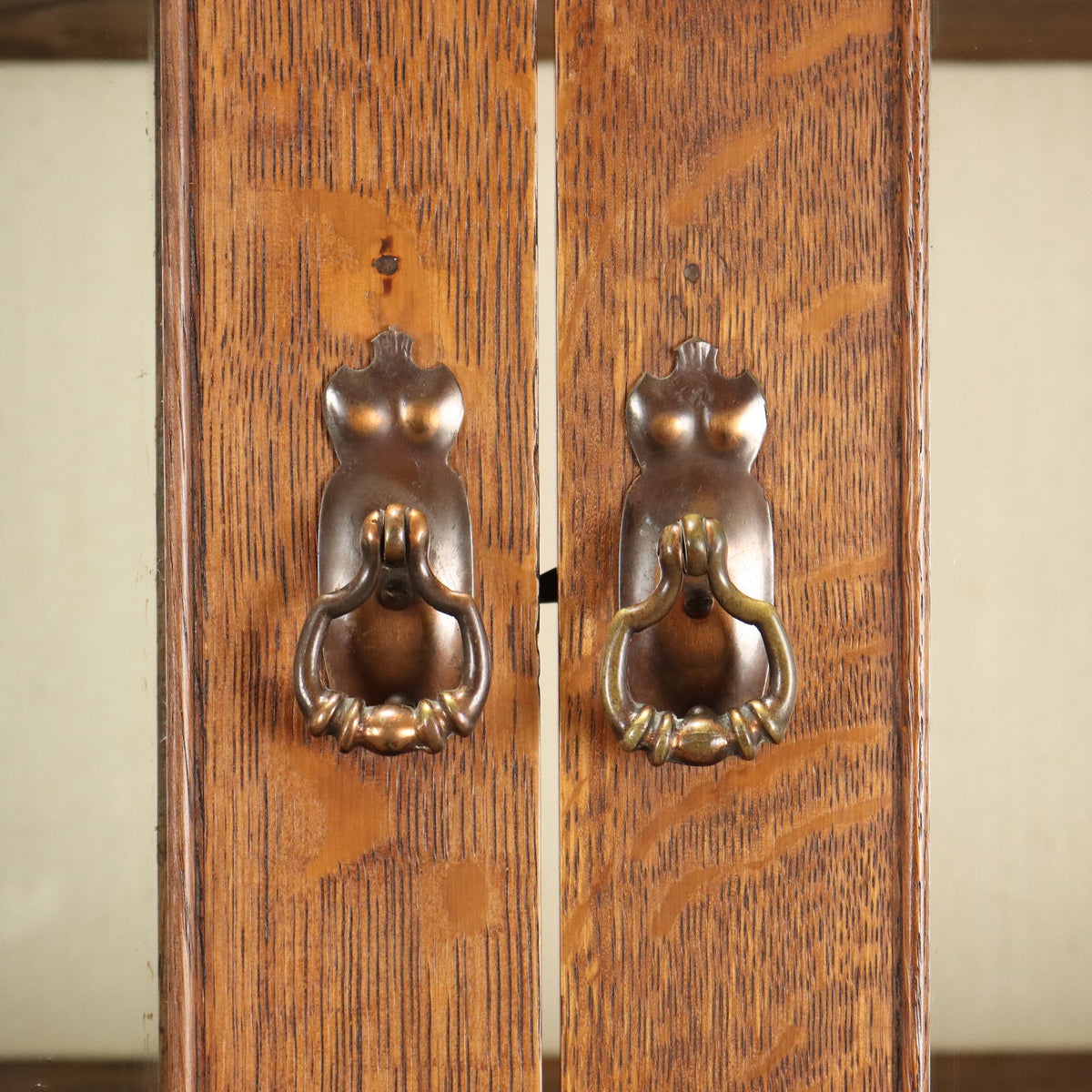 Oak cupboard, base with pair of drawers under the top, paneled doors and carved uprights. Upper part with glass doors surmounted by a geometrically carved frame. France, early 20th century. kitchen cabinet, wardrobe, cabinet, pantry, cupboard, chest.