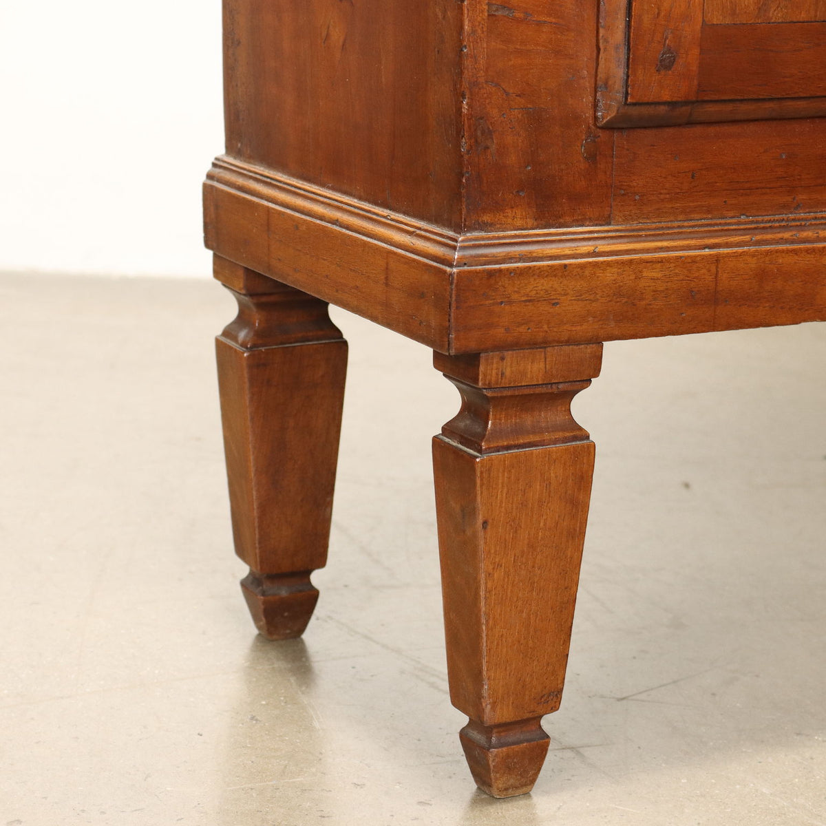 Walnut display cabinet with olive wood inserts, obtained from the top of a two-body bookcase, Front with glass doors, perforated balustrade, truncated pyramidal feet. Interior covered in velvet with four shelves. Italy, late 18th century. Bookcases, Étagère, case, small showcase, shelf, cabinet, bookcase.