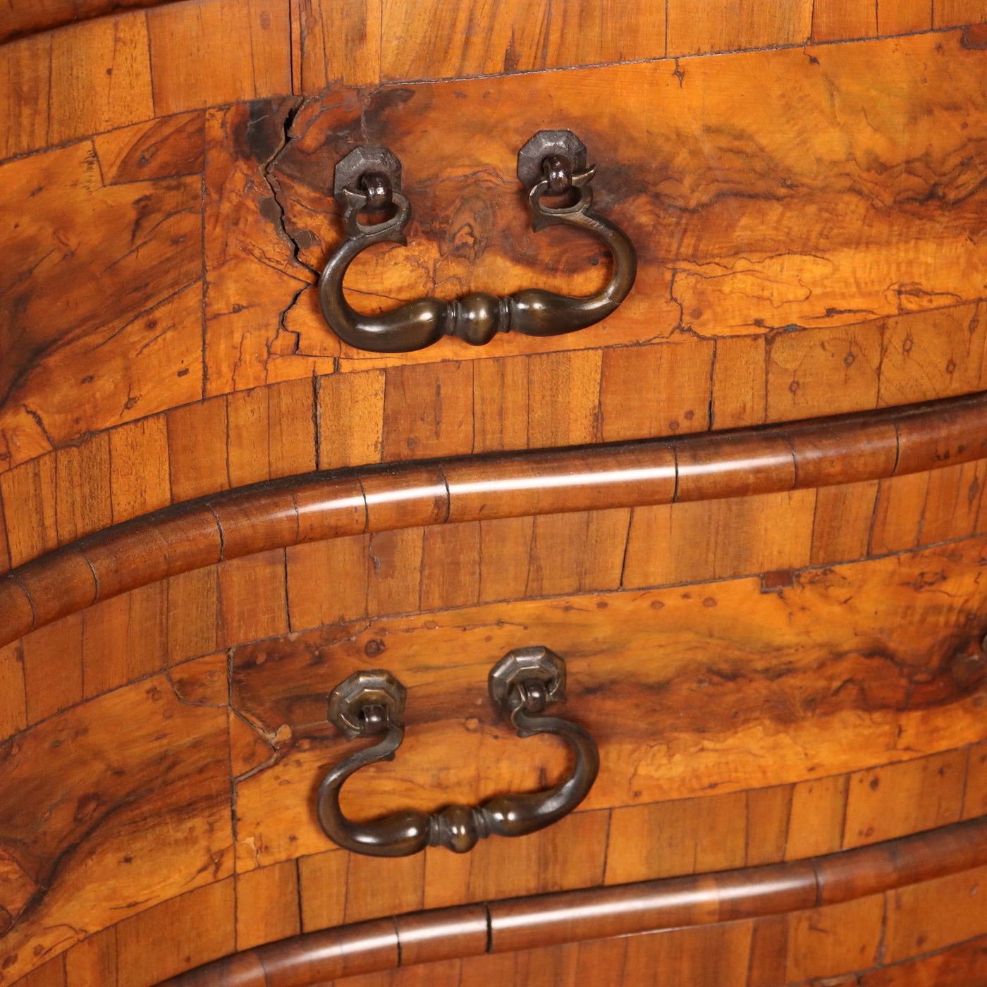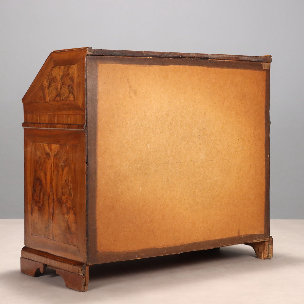 Walnut and burr walnut veneered drop-leaf chest, front with three leaf-spring drawers. Drop-leaf chest conceals a five-drawer internal cabinet, open central compartment with secret compartments. Poplar interior and back, bracket feet, burnished metal escutcheons and handles. Mantua, early 18th century. Flap cabinets, trumeau, writing desk, flap cabinet with étagère, chest of drwers with flap, sécrètaire, cabinet.