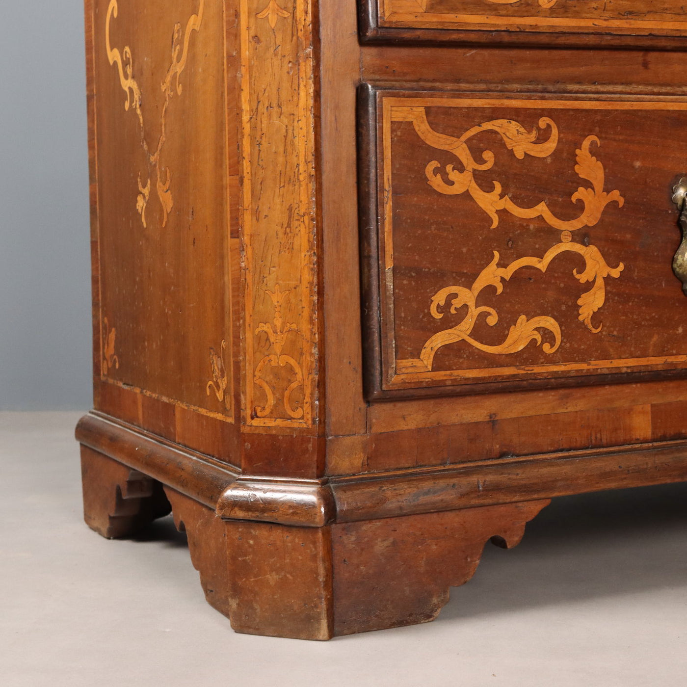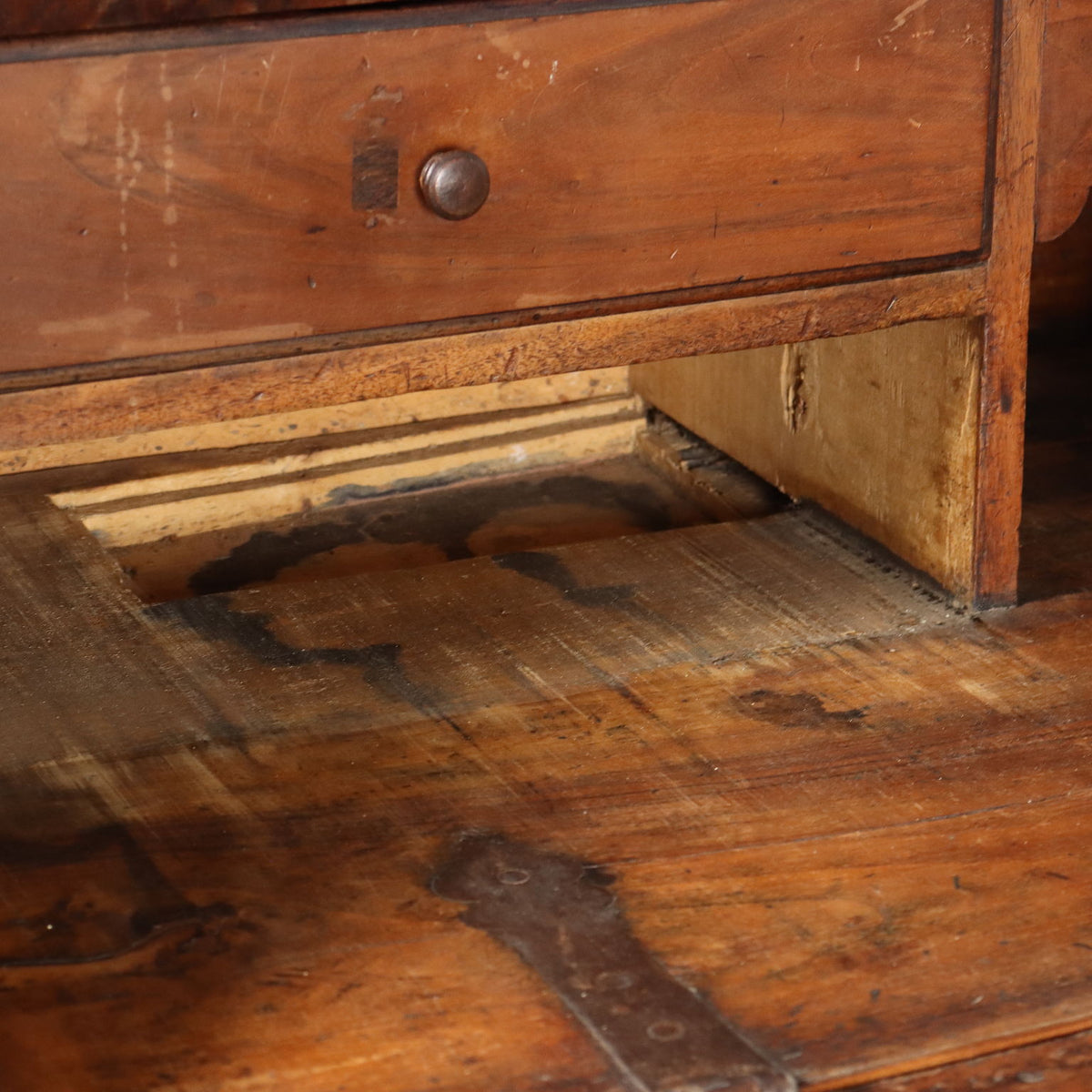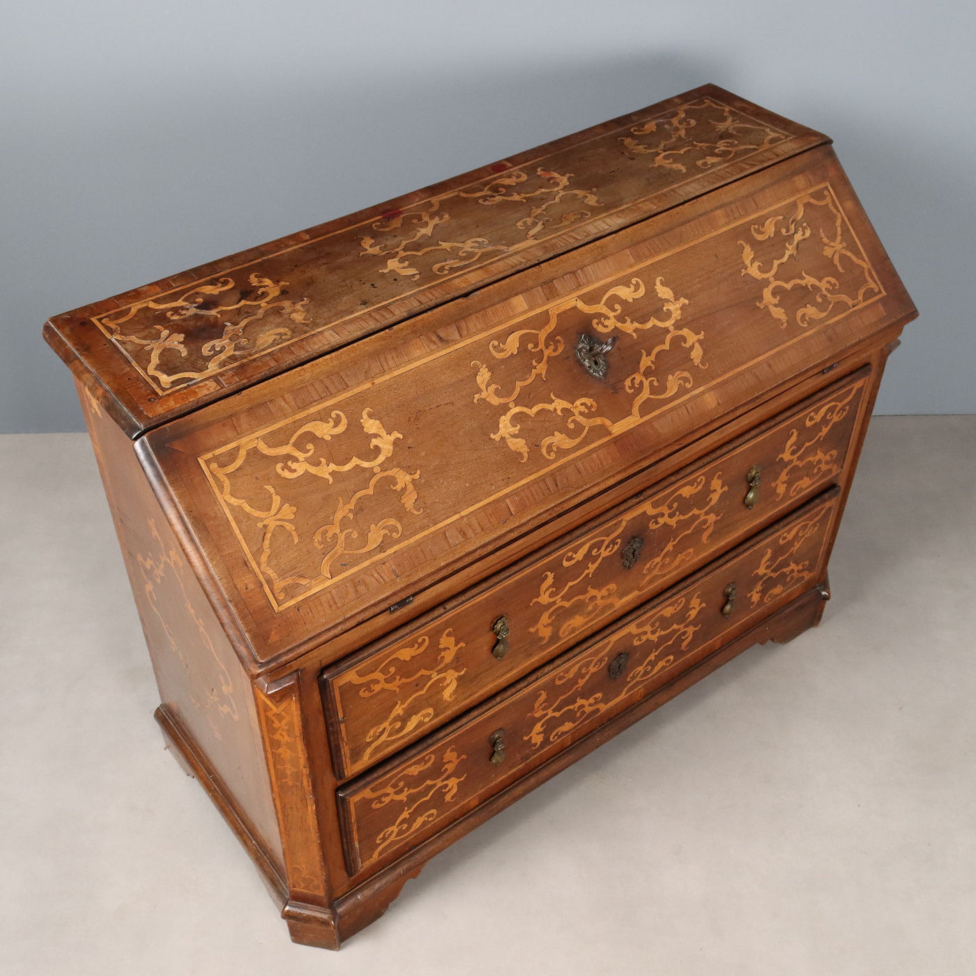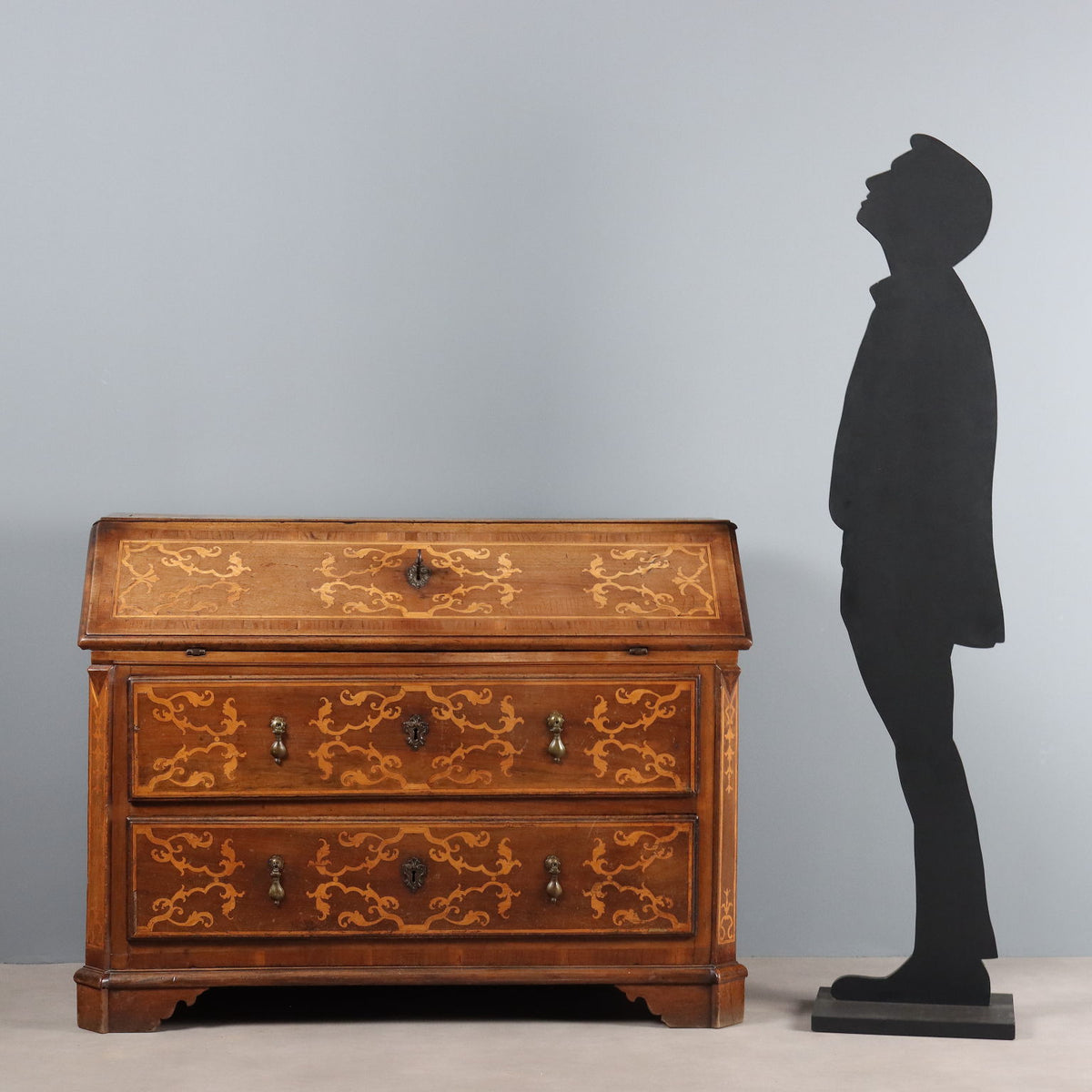 Baroque walnut chest of drawers, maple fillets and inlays, and olive wood frames throughout. Two-drawer front, drop-leaf top concealing a four-drawer cabinet and an open central compartment, forty-five-degree uprights, and bracket feet. Gilded bronze pendants and escutcheons, missing lower drawer lock. Piedmont, 18th century. Flap cabinets, trumeau, writing desk, flap cabinet with étagère, chest of drwers with flap, sécrètaire, cabinet.
