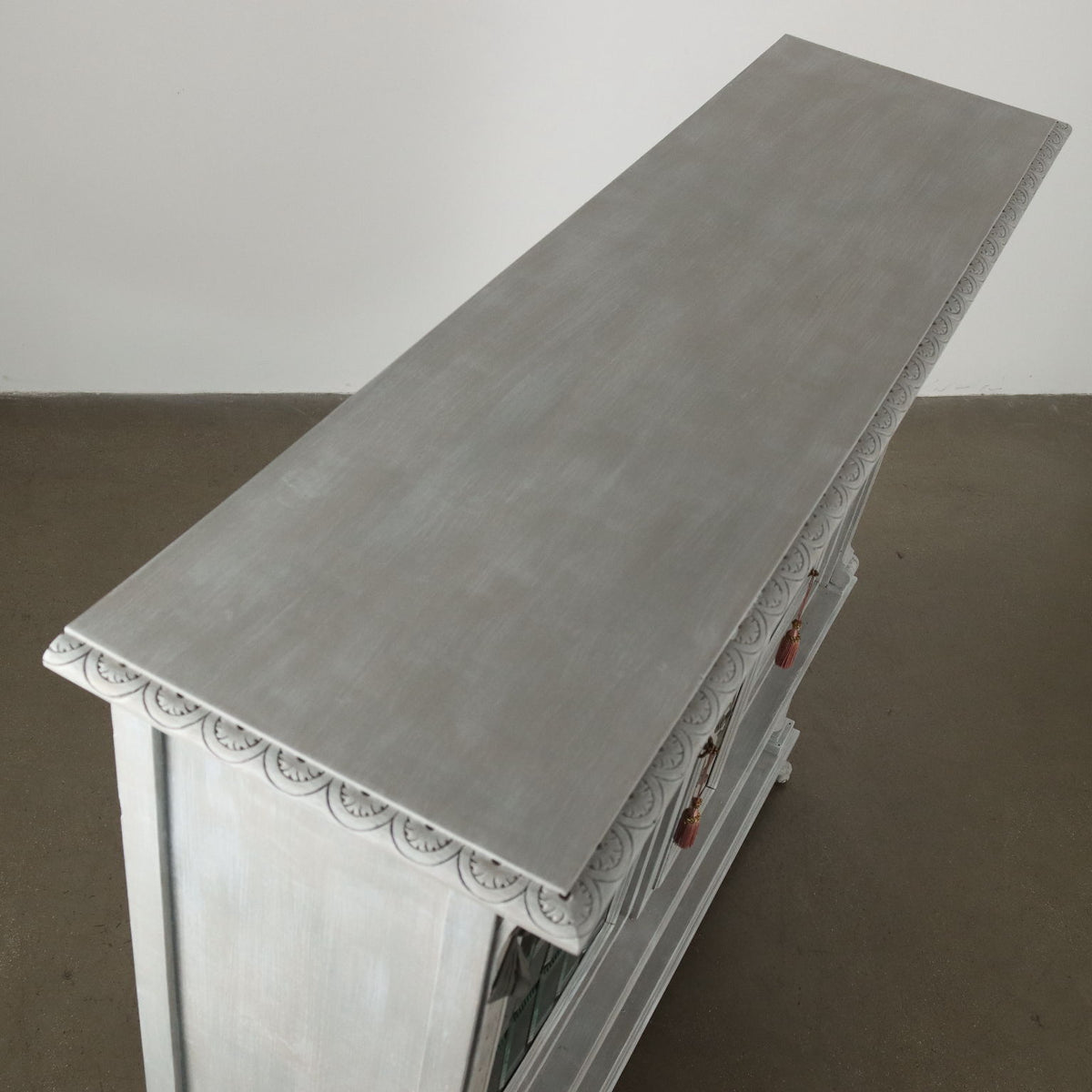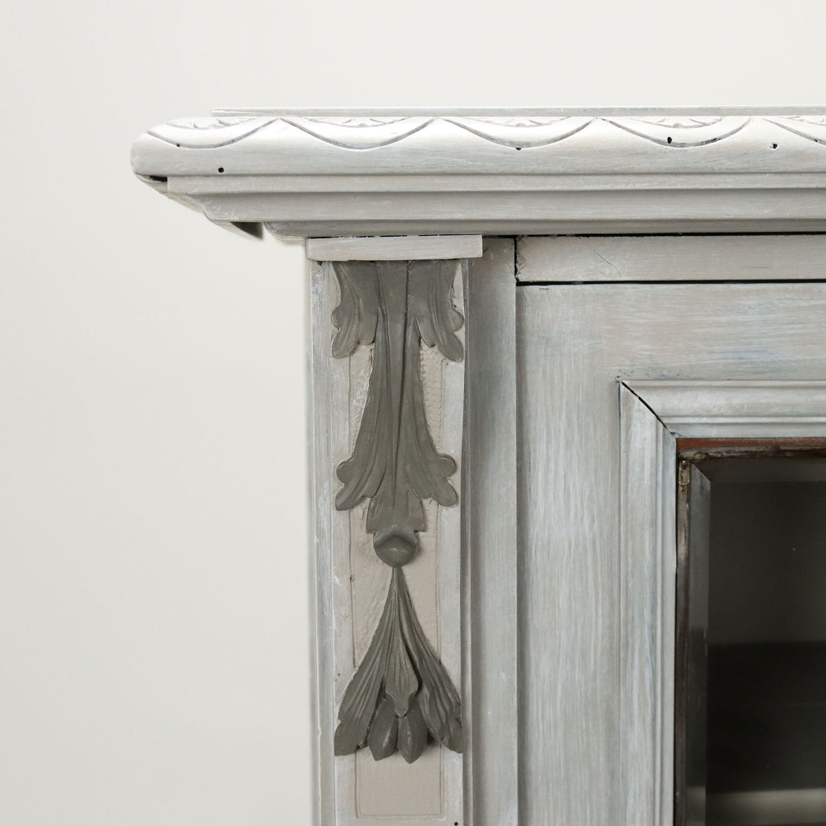 Two-door showcase in neo-Renaissance style, early twentieth century. Renaissance-style carvings and 'Cathedral' stained glass, restored and lacquered in shades of gray. Showcases, showcase, case, small showcase, shelf, cabinet, bookcase.