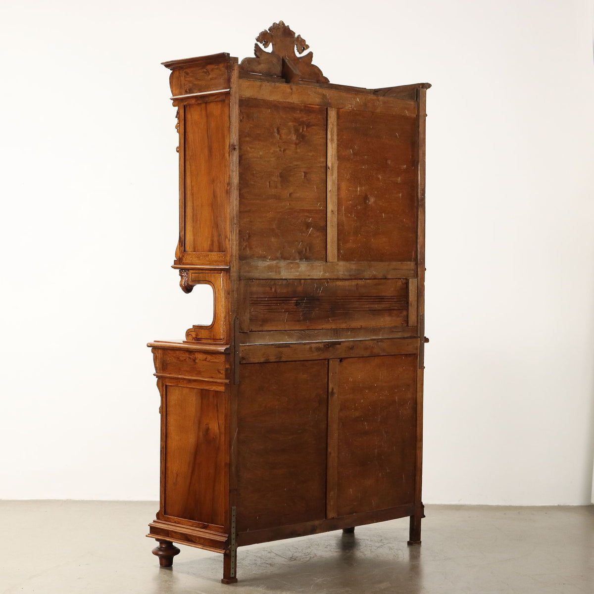 Neo-Baroque walnut cupboard, richly carved. Base with pair of drawers in the band below the top and paneled and carved doors, upper part with colored glass doors culminating in a carved frieze depicting a pair of dragons and a fruit basket. Italy, late 19th century. kitchen cabinet, wardrobe, cabinet, pantry, cupboard, chest.
