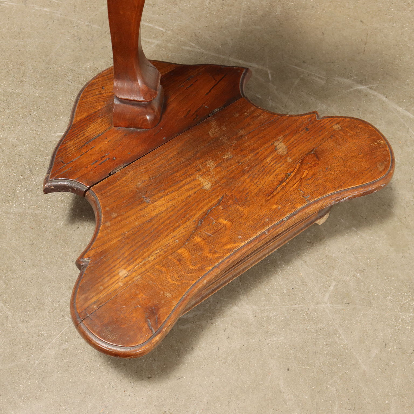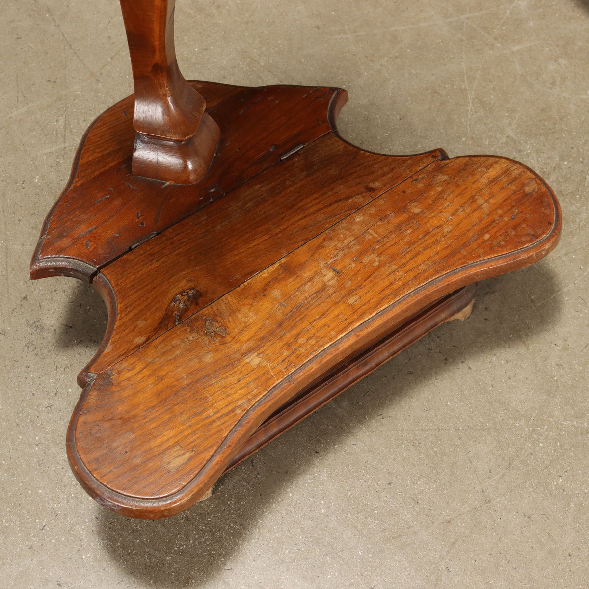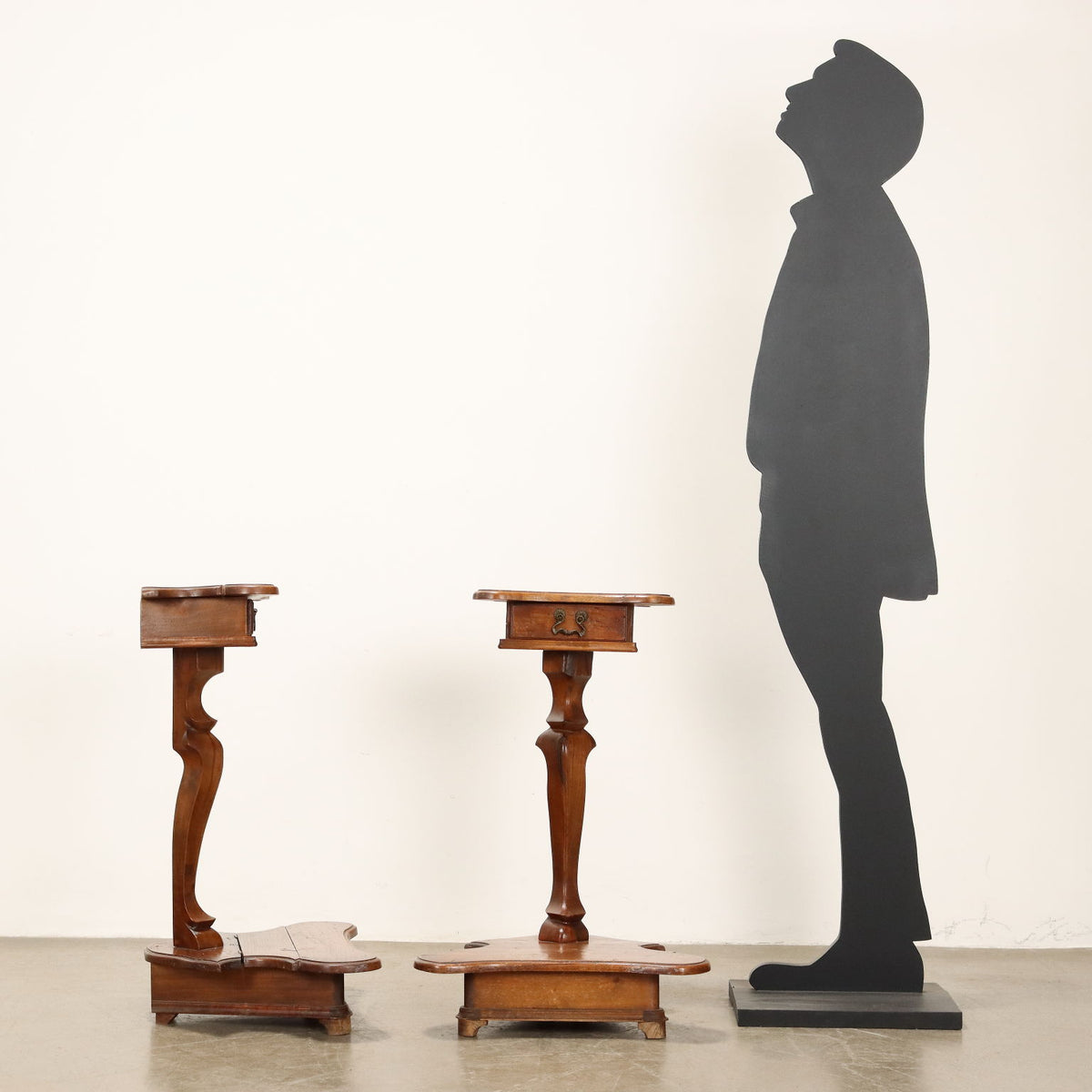 Pair of Baroque style kneeling nightstands, walnut stained beech. Drawer under the top, curved central leg, drop-down top concealing open compartment in the kneeling table. Italy, late 19th century. bedside table, bedroom cabinet, chest of drawers.