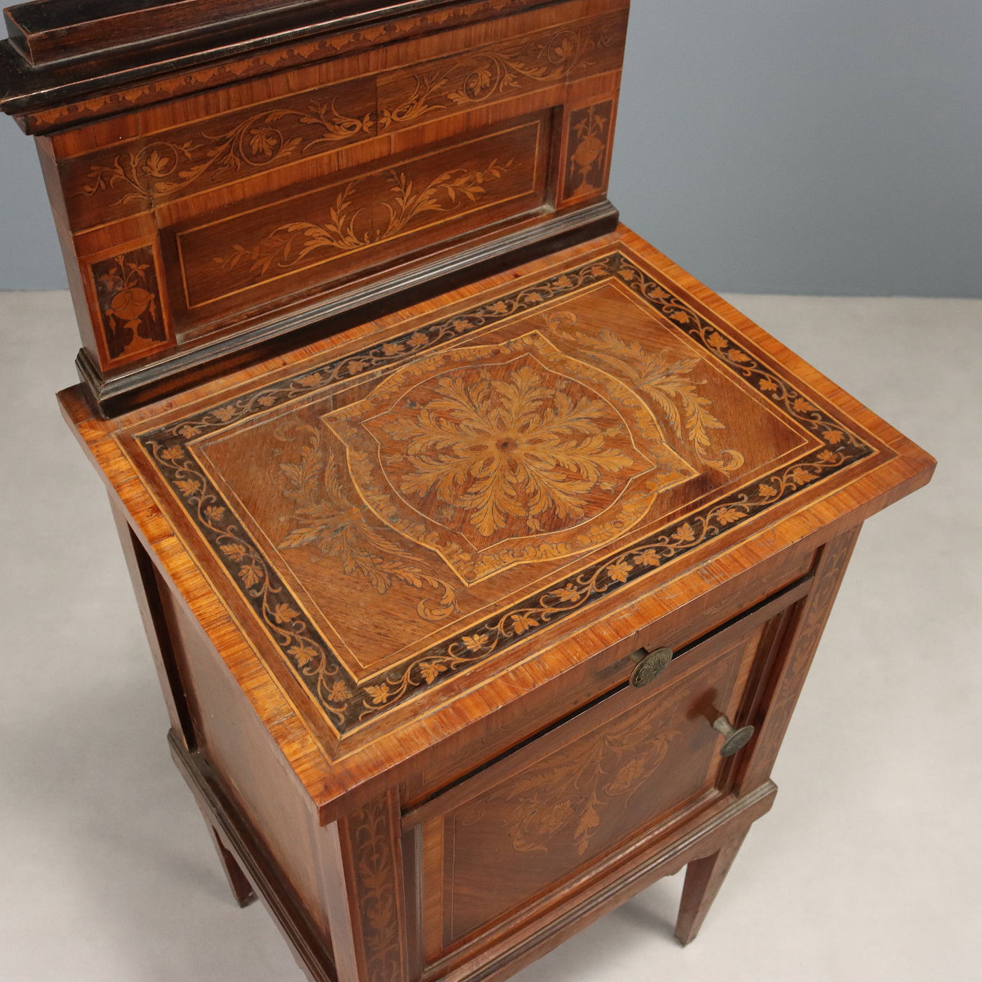 Bedside table, beech veneered in mahogany, rosewood and walnut, richly inlaid in maple with leafy and floral subjects. Backsplash, drawer in the band under the top, central door and truncated pyramidal feet. Italy, early 20th century. bedside table, bedroom cabinet, chest of drawers.