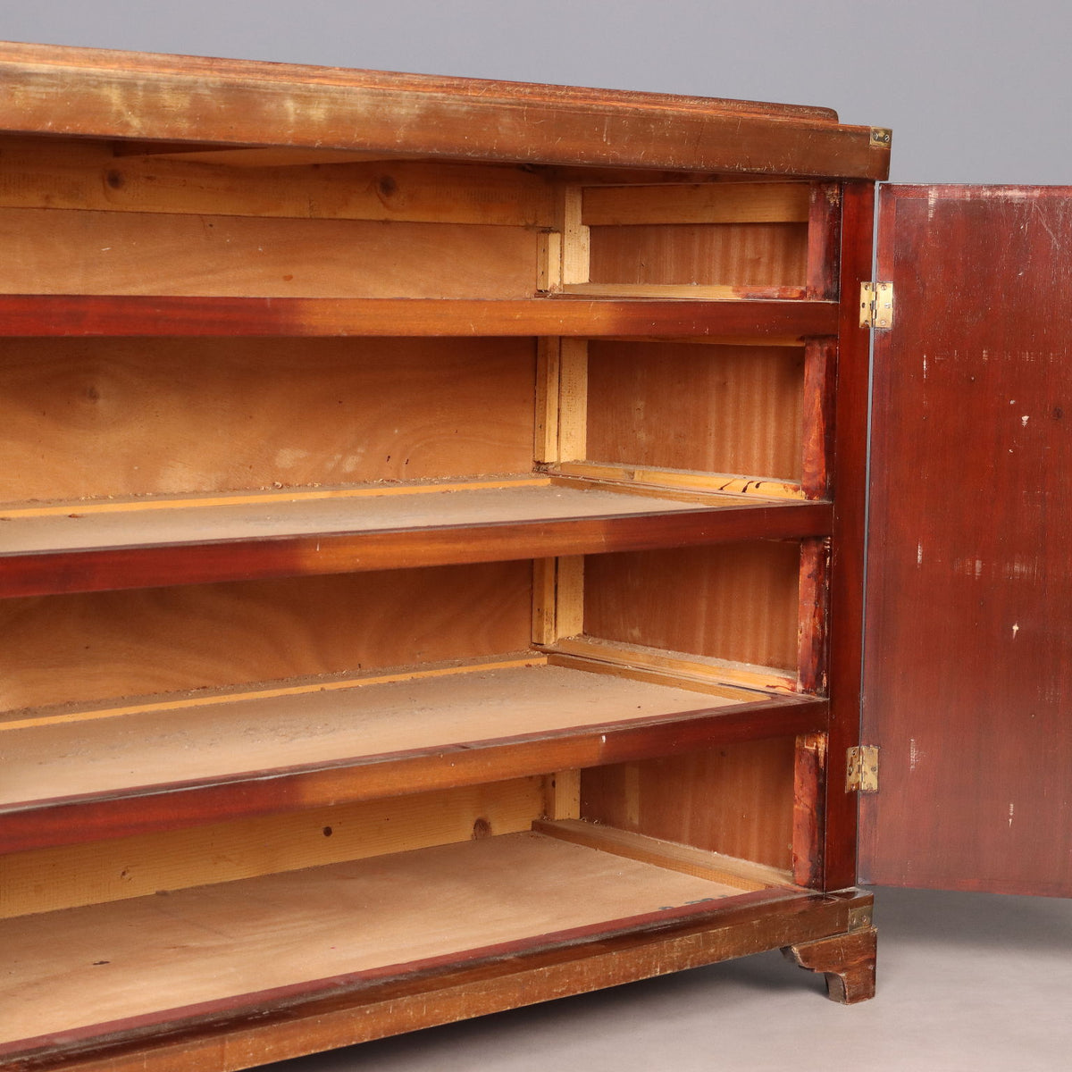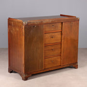 Mahogany chest of drawers, front with four drawers enclosed by a pair of doors, bracket feet, brass details. Italy, mid-20th century. kitchen cabinet, wardrobe, cabinet, pantry, cupboard, chest.