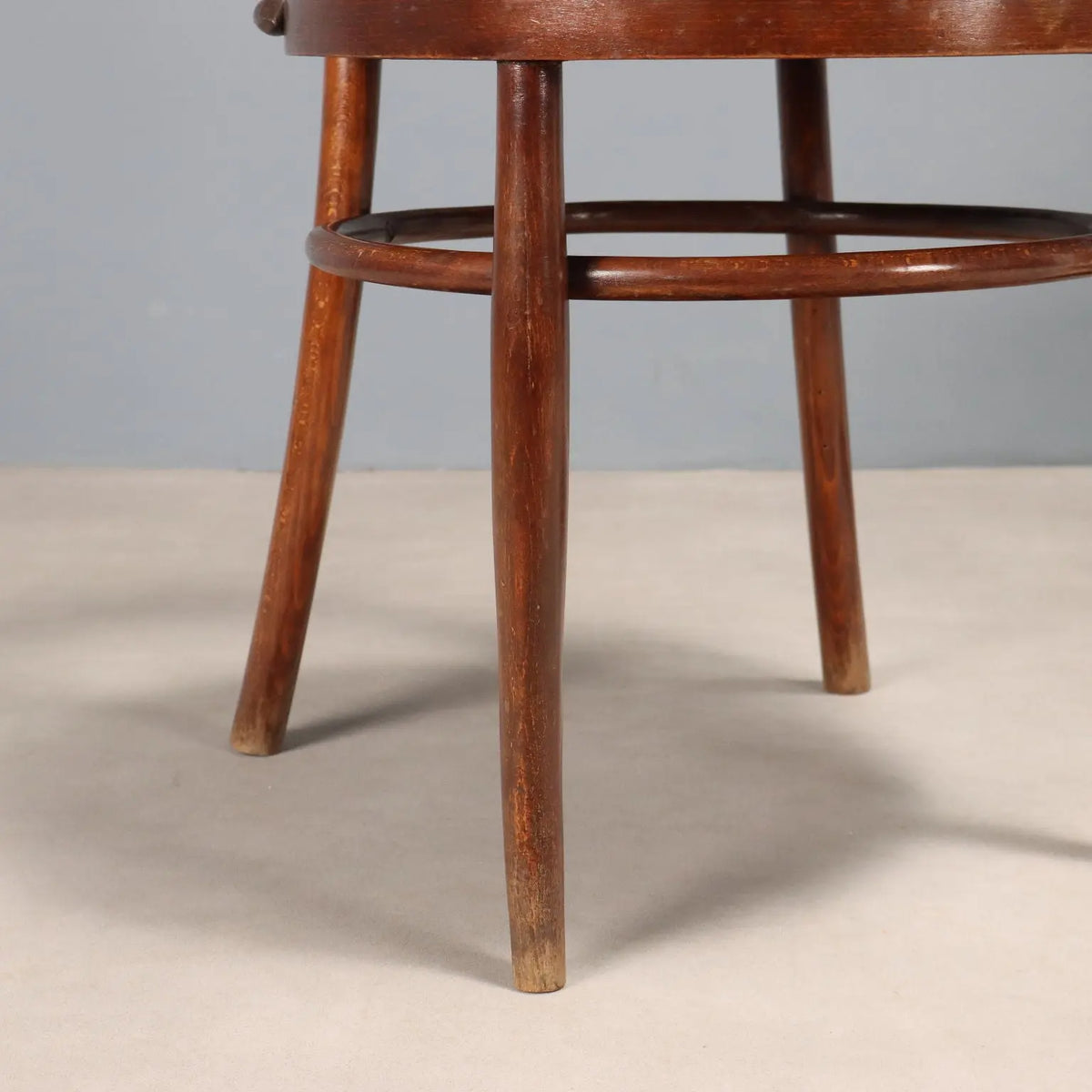 Set of three walnut-stained beech armchairs. Open backrest, wraparound armrests, two seats with molded shells. Austria, early 19th century.