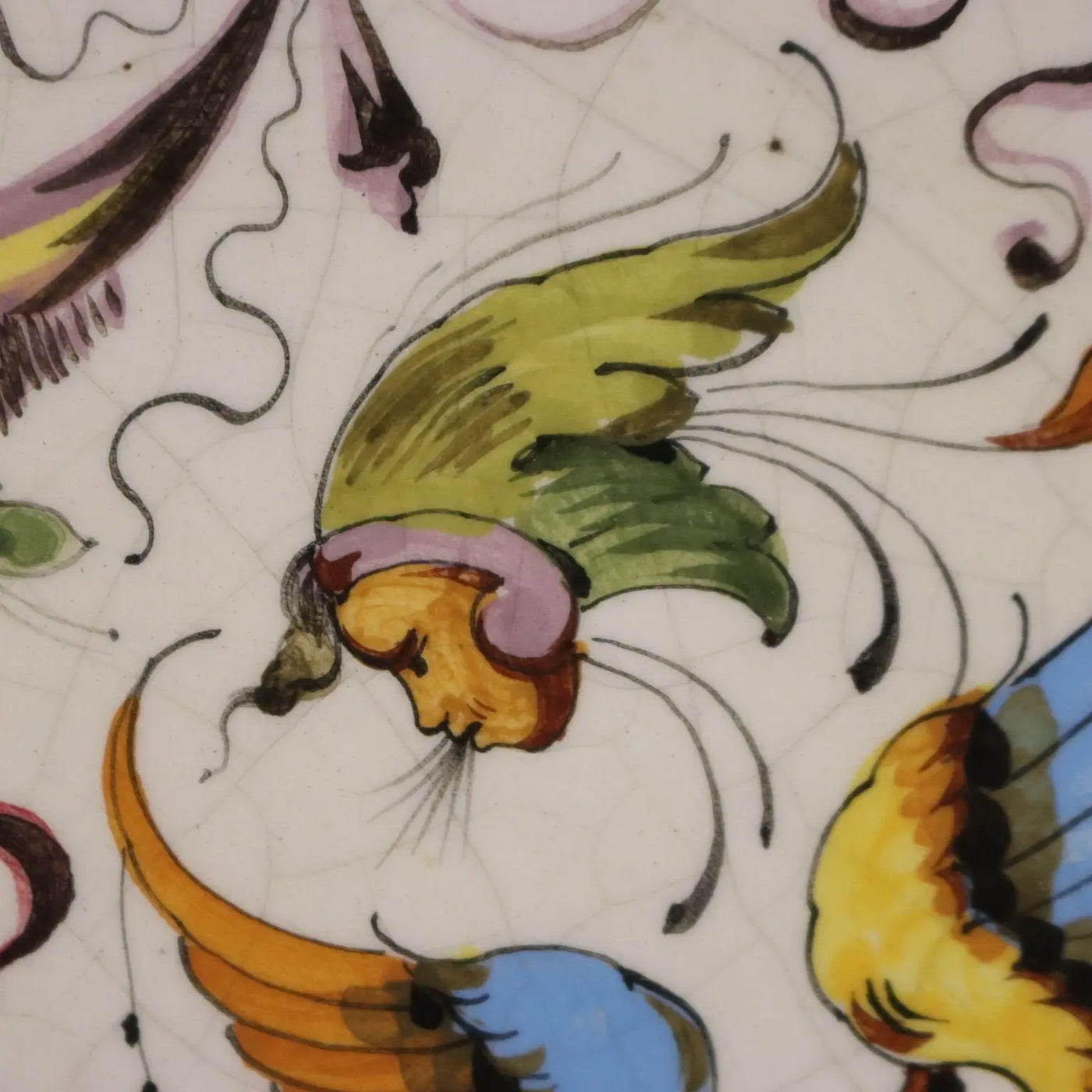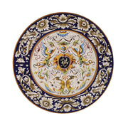 A polychrome glazed ceramic display plate in a Neo-Renaissance style. The rim features a plant motif on a blue background,...