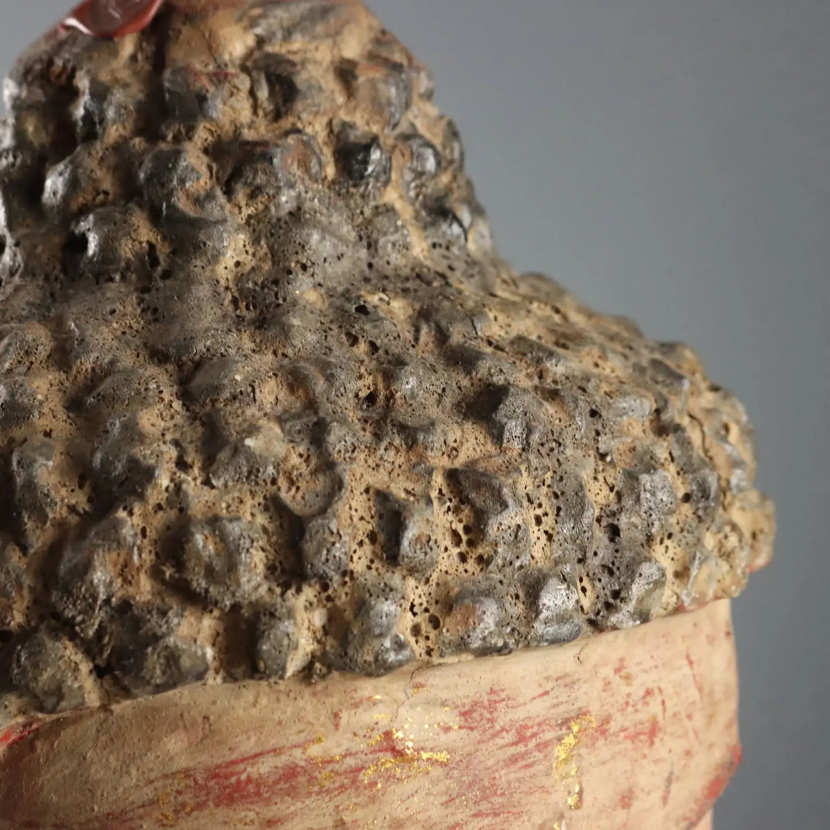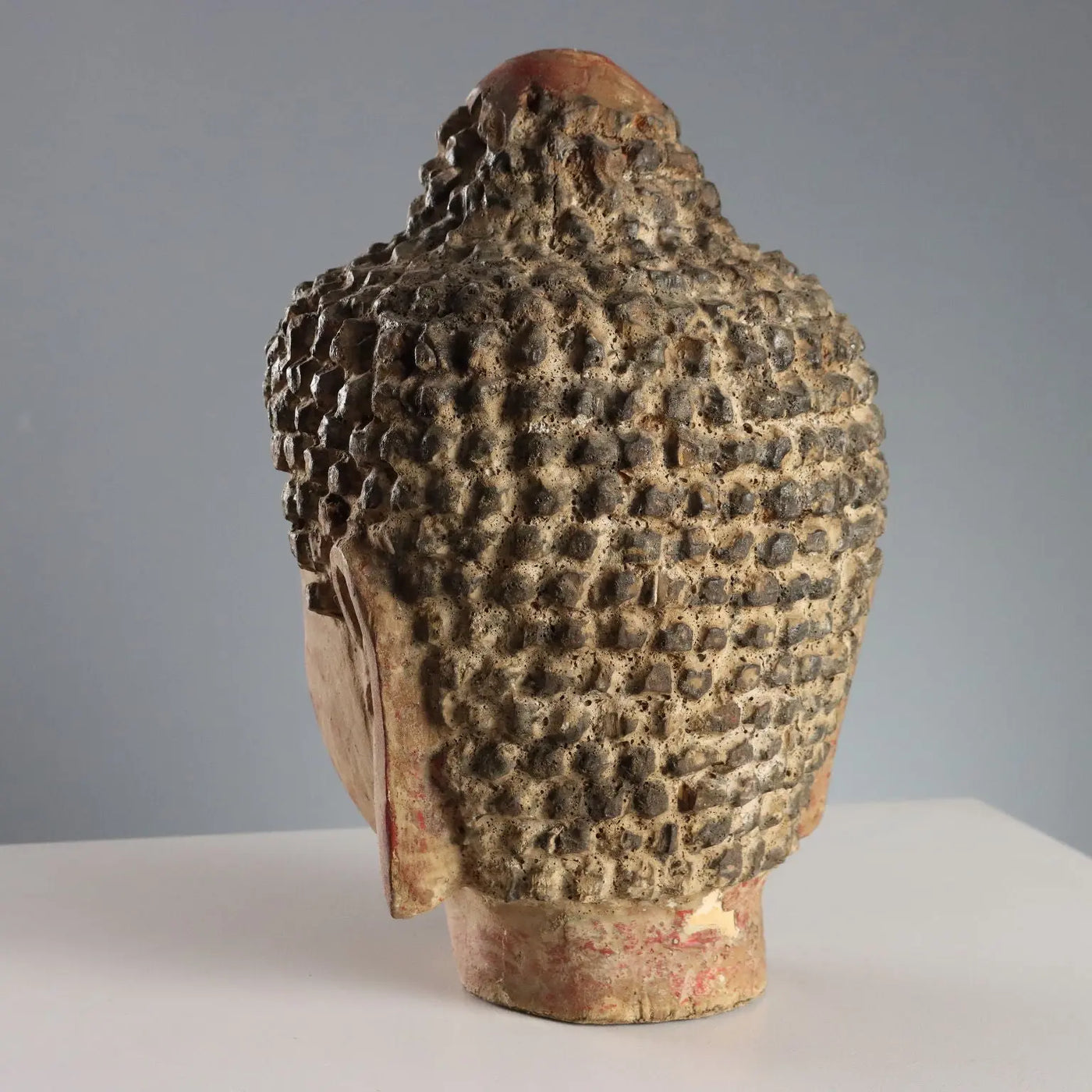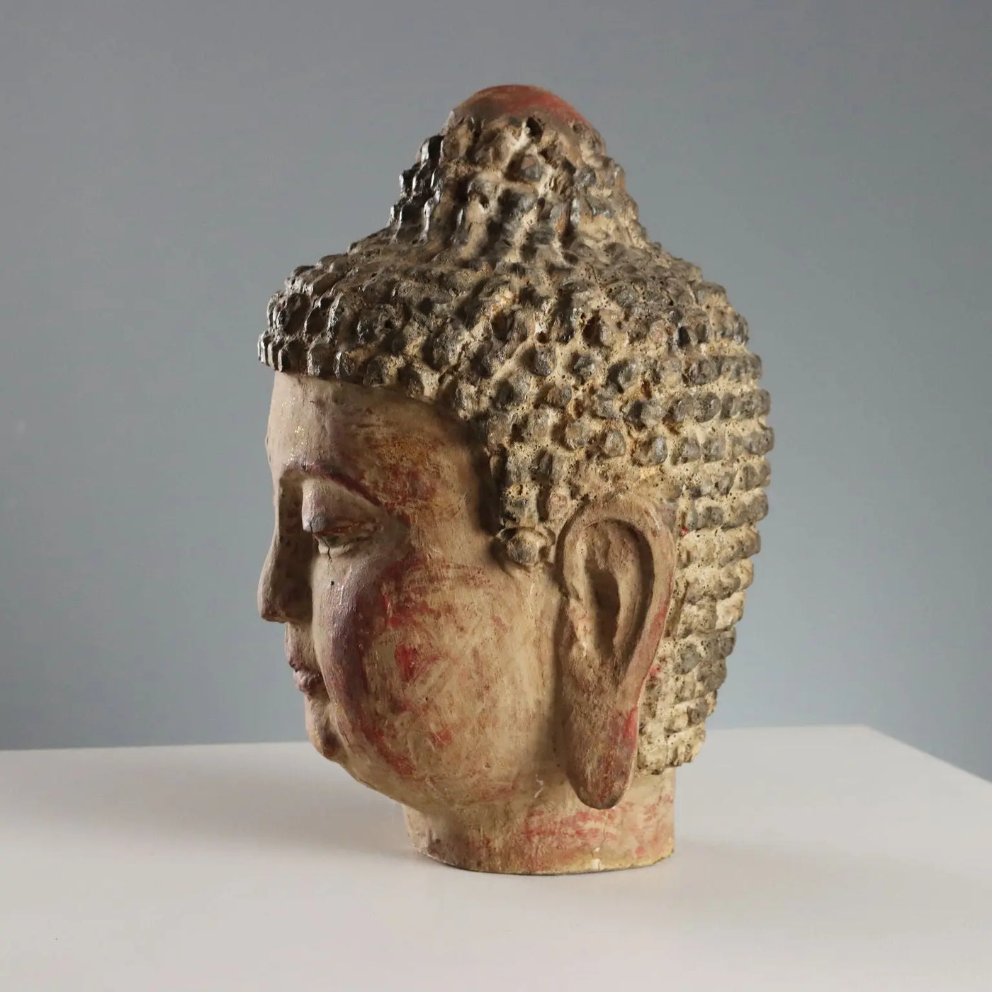 Antique style Buddha head in polychrome patinated wood with light gold highlights.