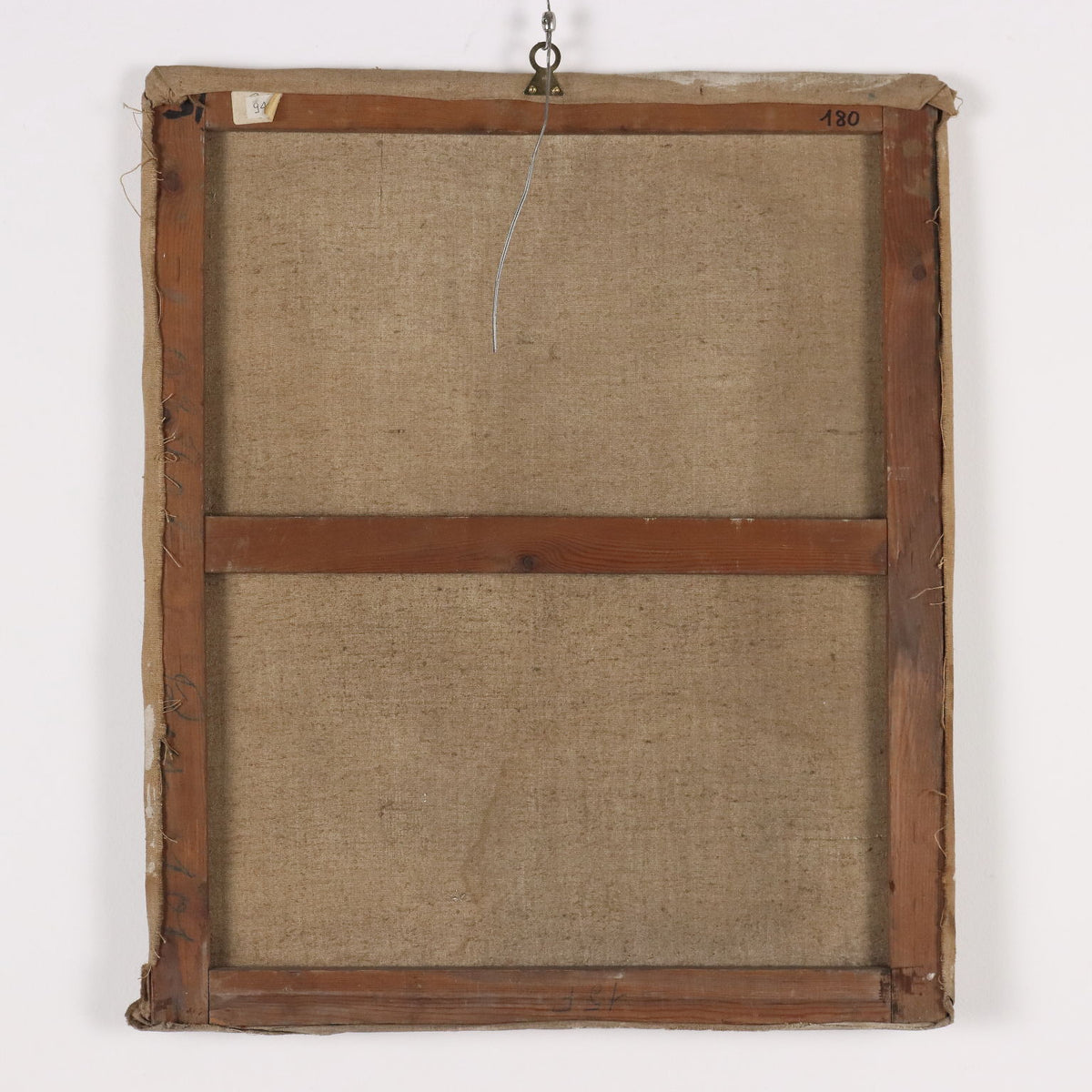 Oil on canvas. Signed and dated lower left. The date of the work places this work in the period in which ORAZI was already projecting himself towards a less realistic painting, creating a portrait characterized by very marked physiognomic features, almost geometric, and a color scheme that plays on the variation of a single color range. The figure portrayed is that of an elderly woman, belonging to the peasant world. Contemporary art, , abstract art, italian painters oil on canvas paintings landscapes.