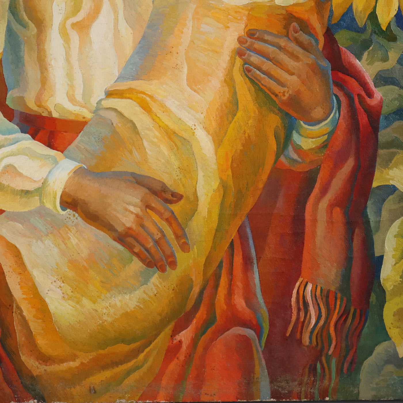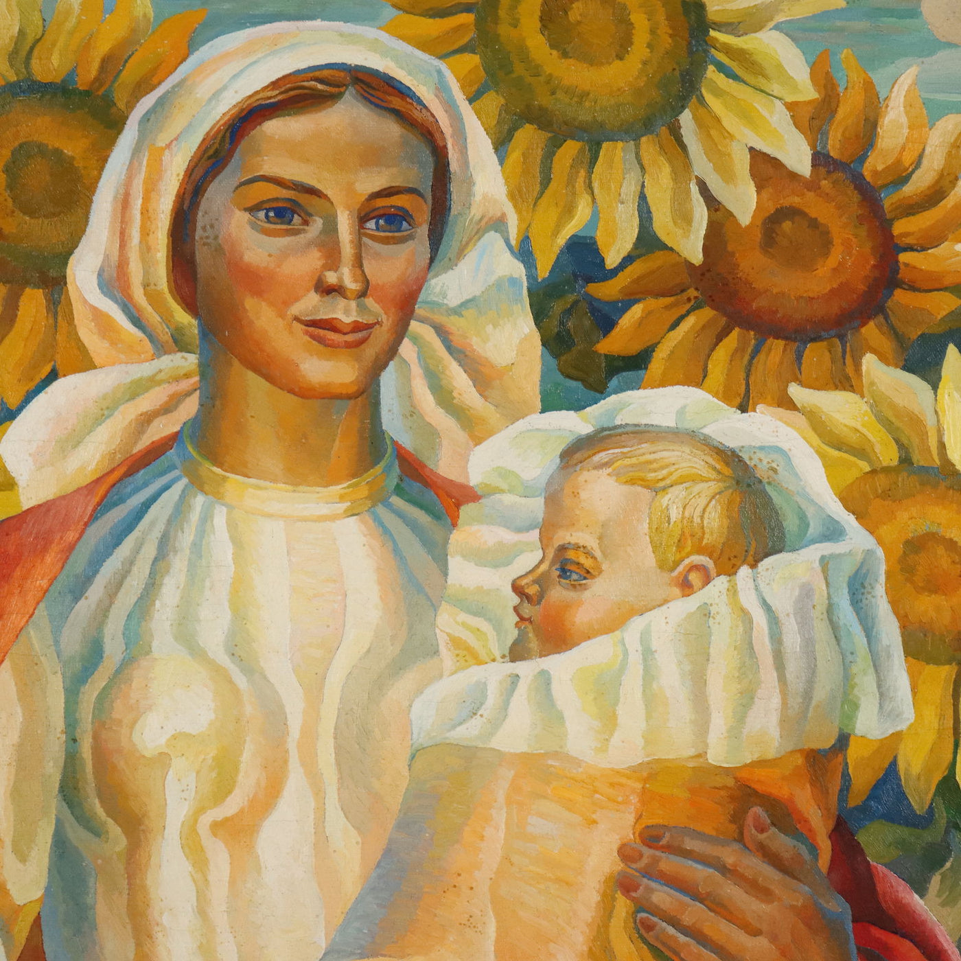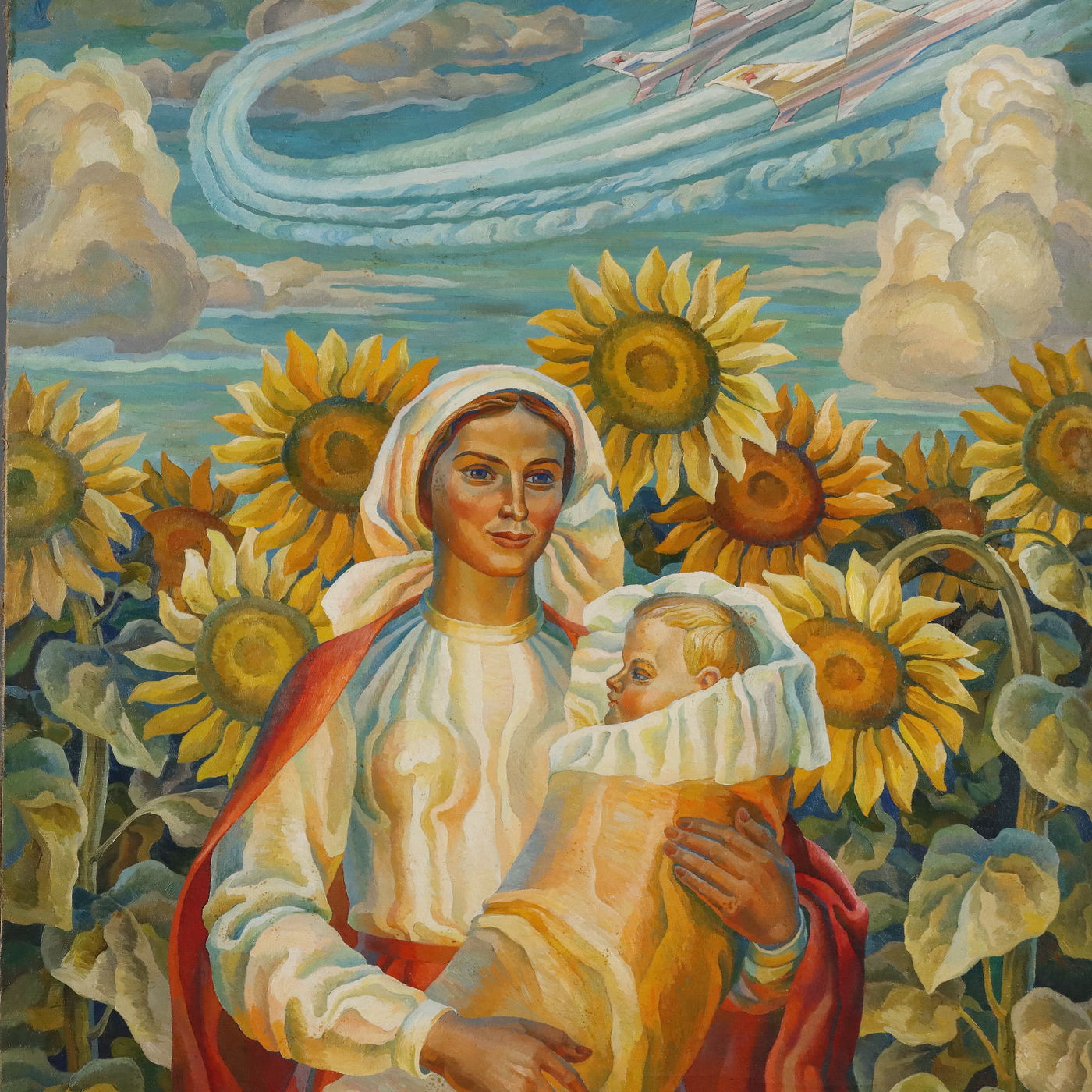 Oil on canvas. Signature, title, and date in Cyrillic on the back. Viktor Petrovich Rudametkin is a Ukrainian artist who has established himself as a landscape painter and colorist. In this work, using his characteristically vibrant palette, he depicts a peasant mother in the middle of a field of sunflowers, a symbol of life and peace, contrasting with the images of military planes streaking across the sky. Created during the years when Ukraine was part of the Soviet Union, the image can be thought of as a call to peace and a message of hope for the artist's native land, still torn apart by the serious conflict with Russia. Contemporary art, , abstract art, italian painters oil on canvas paintings landscapes.