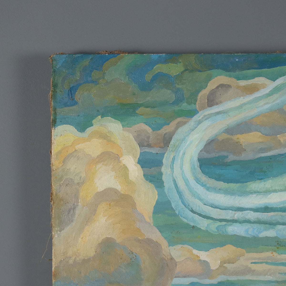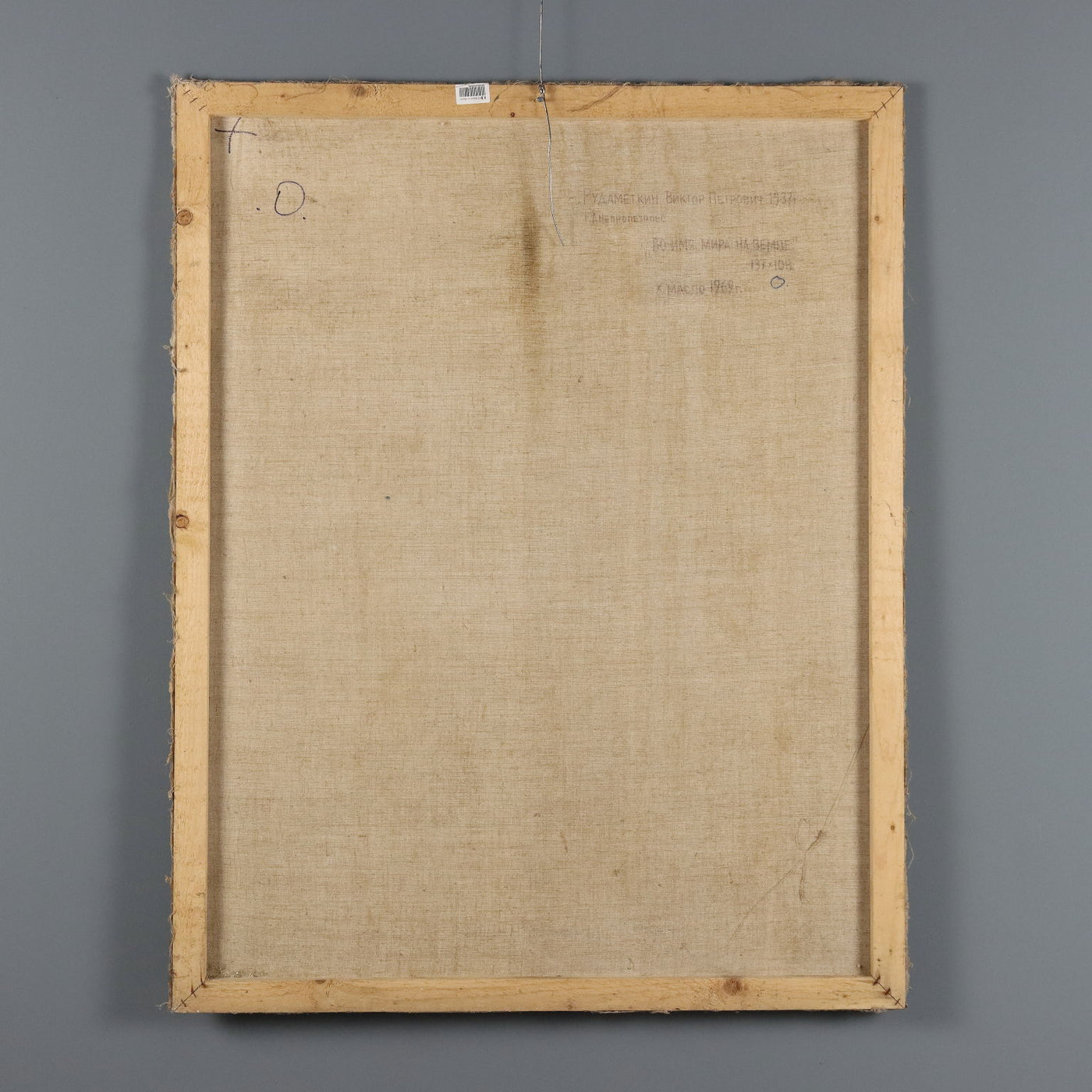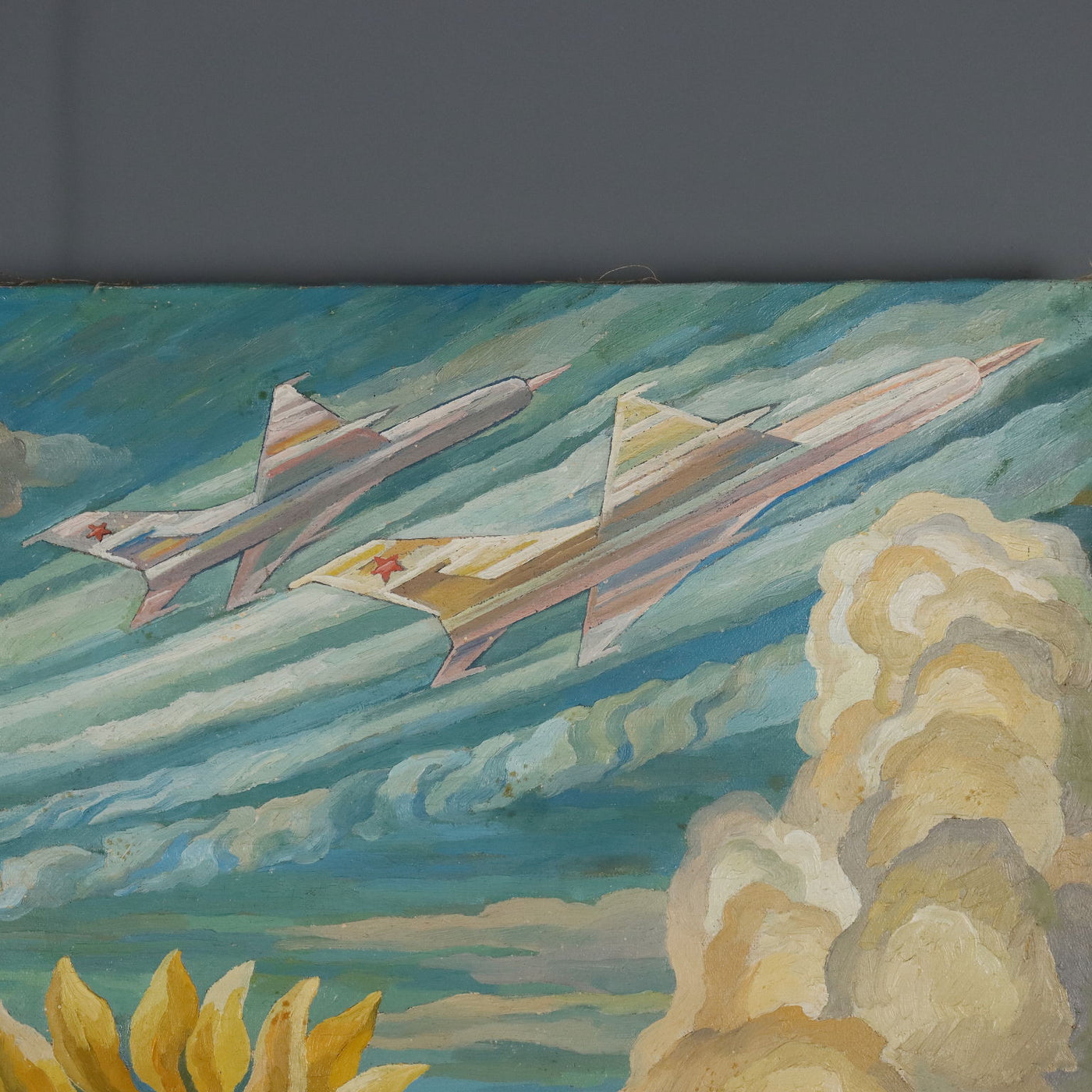 Oil on canvas. Signature, title, and date in Cyrillic on the back. Viktor Petrovich Rudametkin is a Ukrainian artist who has established himself as a landscape painter and colorist. In this work, using his characteristically vibrant palette, he depicts a peasant mother in the middle of a field of sunflowers, a symbol of life and peace, contrasting with the images of military planes streaking across the sky. Created during the years when Ukraine was part of the Soviet Union, the image can be thought of as a call to peace and a message of hope for the artist's native land, still torn apart by the serious conflict with Russia. Contemporary art, , abstract art, italian painters oil on canvas paintings landscapes.