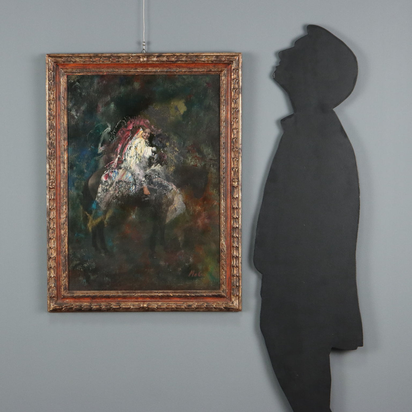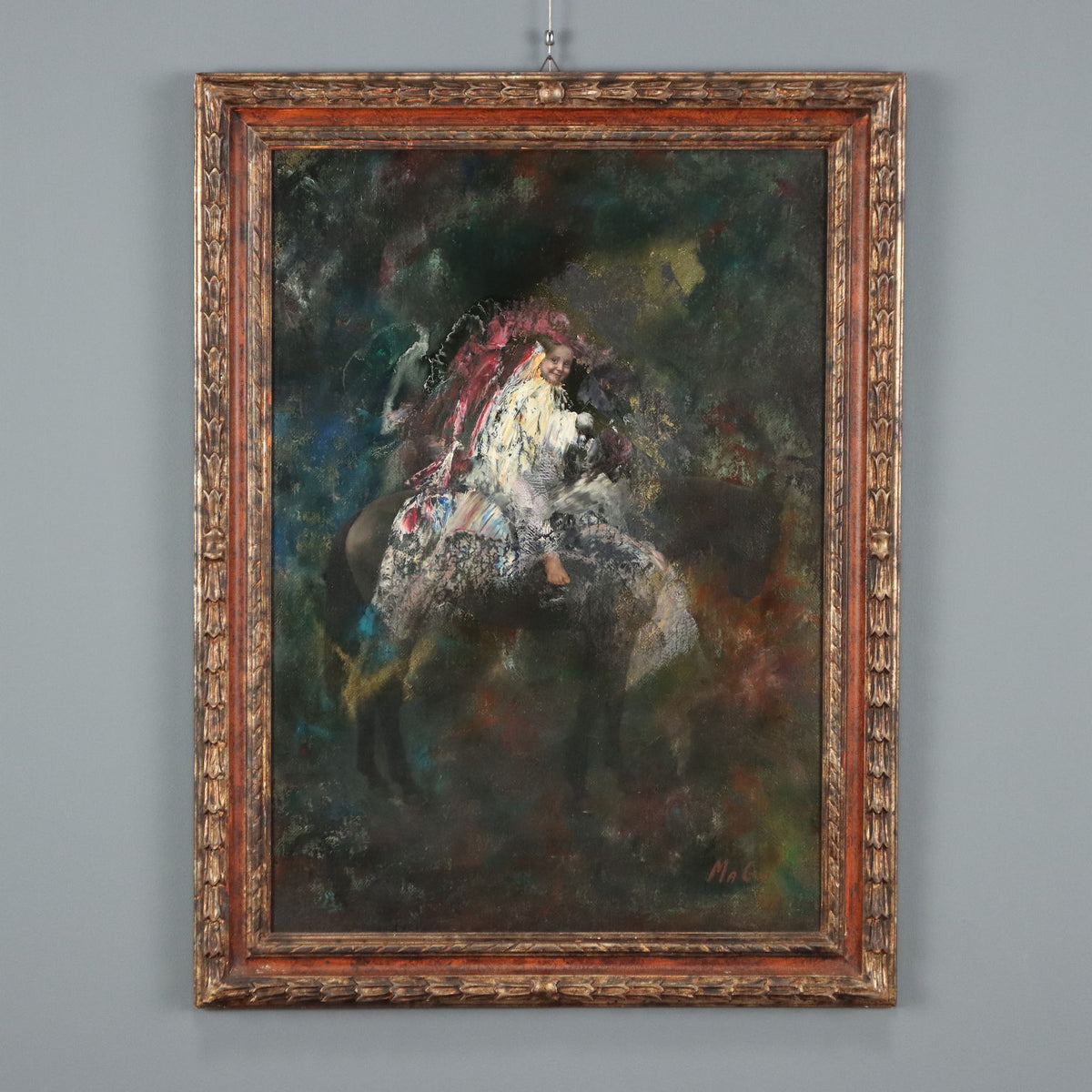 Oil on canvas. Signed MAGO lower right. Maurizio Goracci, aka Mago, is a Roman painter of figurative subjects, with figures that, though well-defined, are always set against a surreal background, shaded in acidic palettes, lending a sense of the fantastic. A recurring theme is a figure on horseback, this time a child, whose face and extremities are recognizable, while the entire body, as well as the horse's silhouette, are covered in bright, floral fabrics, standing out against the undefined, dark background. The work is presented in a frame. Contemporary art, , abstract art, italian painters oil on canvas paintings landscapes.