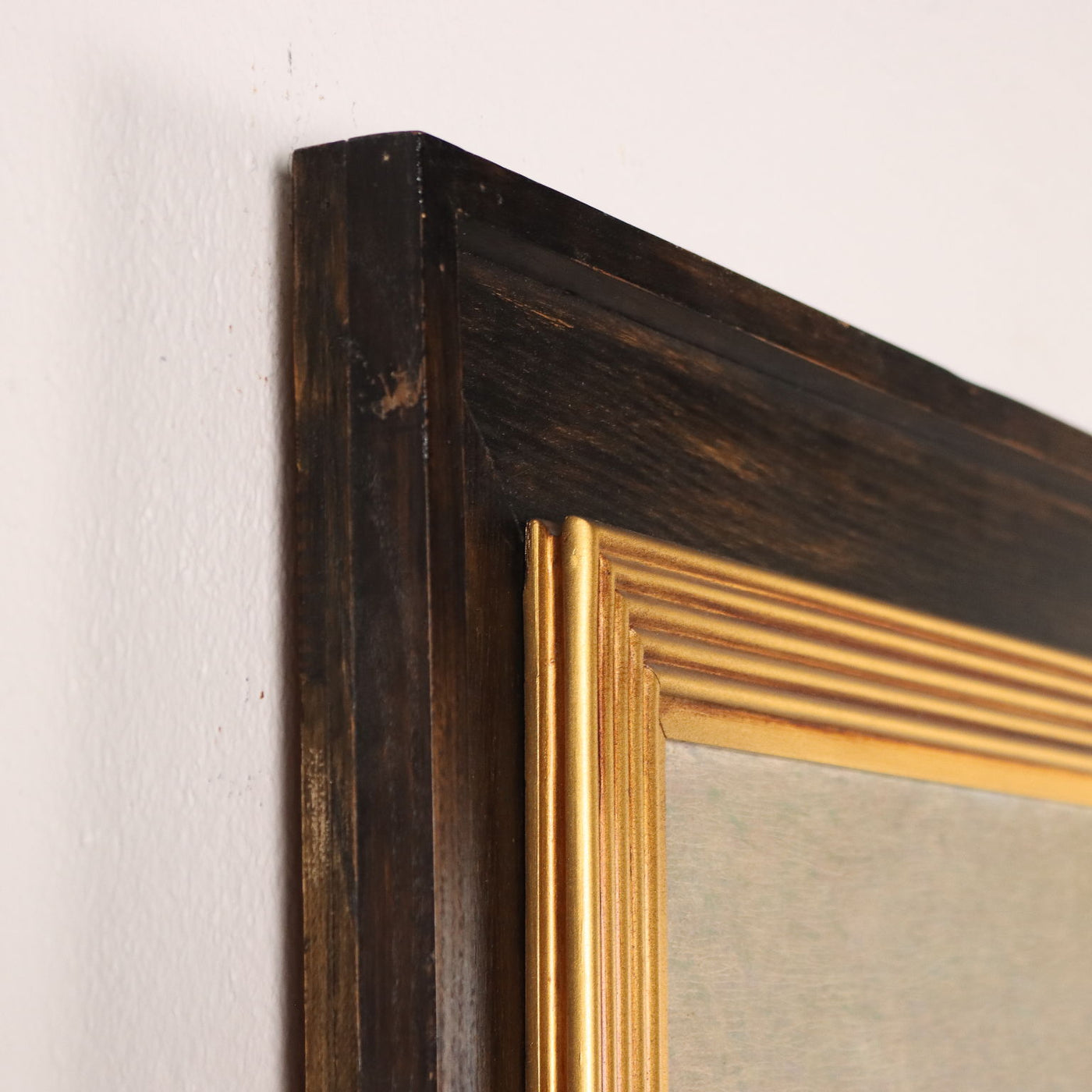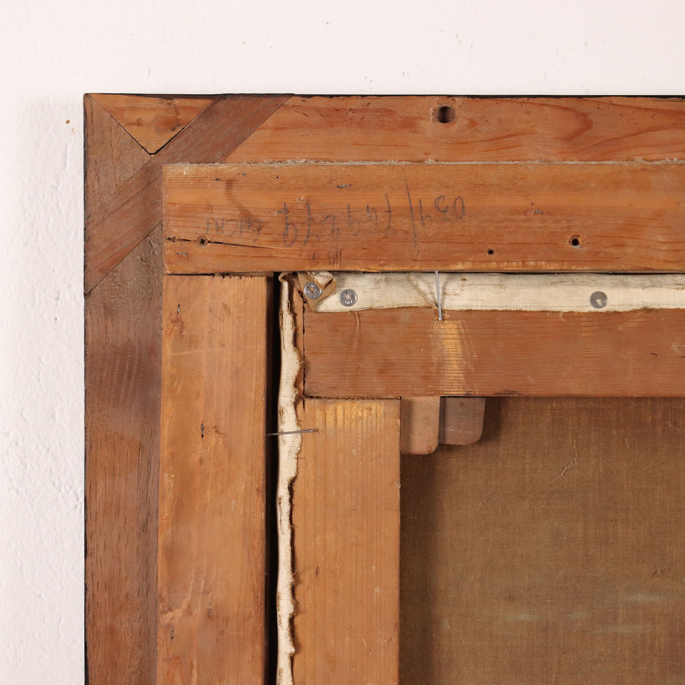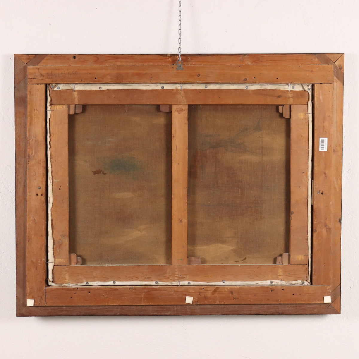 Oil painting on canvas. Signed lower left. The Roman-born artist Cesare Maggi established himself as a pointillist landscape painter, portraying alpine landscapes in the Engadine and Aosta Valley, often enlivened by the inclusion of figures and animals. Becoming a friend of the painter Giacomo Grosso in Turin in 1901, he then successfully oriented himself towards the portrait genre, setting aside the pointillist technique. While still favoring high mountain views, he broadened his subjects by also engaging in seascapes and still lifes. In this work, still from the first period, Maggi portrays a glimpse of the countryside crossed by a calm river, bordered by rows of bare trees and small grassy hills, behind which the farmhouses overlook: already no longer linked to the techniques divisionist, the work is rather characterized by dense and opaque mixtures of color, in which the earth, the water and the farmhouses are superimposed in a continuum broken only by the band of sky above. The work is presented in a period frame. Art 900s, , 1900s painting, large painting, oil on canvas painting.