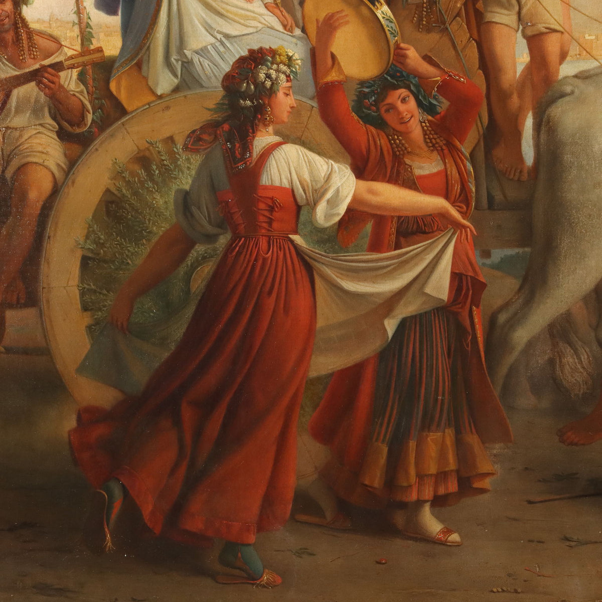 Oil on canvas. This is a copy of a famous painting by the painter Louis Léopold Robert (1794 -1835), which was exhibited at the Salon de Paris in 1827 and bought by King Louis Philippe; it is currently preserved in the Louvre Museum. The painting depicts a joyful festive scene, rich in folklore with costumed characters dancing the tarantella and in the background the fantastic panorama of the city of Naples. Robert, a Swiss artist, stayed several times in Italy, where he found inspiration for the creation of many works and established himself as a romantic genre painter and Grand Tour landscape painter, whose subjects were highly appreciated and replicated. The painting of the 'Return from the feast of the Madonna dell'Arco in Naples', was part of a project by Robert, who intended to paint four large canvases on the seasons, set in four different parts of Italy: this one represented Spring. The canvas presented here, unsigned, is nevertheless of high pictorial quality. Restored and relined, it is presented in a late 19th - early 20th century frame. Art '800, , oil on canvas painting, ancient painting, landscape painting, still life paintings, ancient art, painting oil on wooden board.