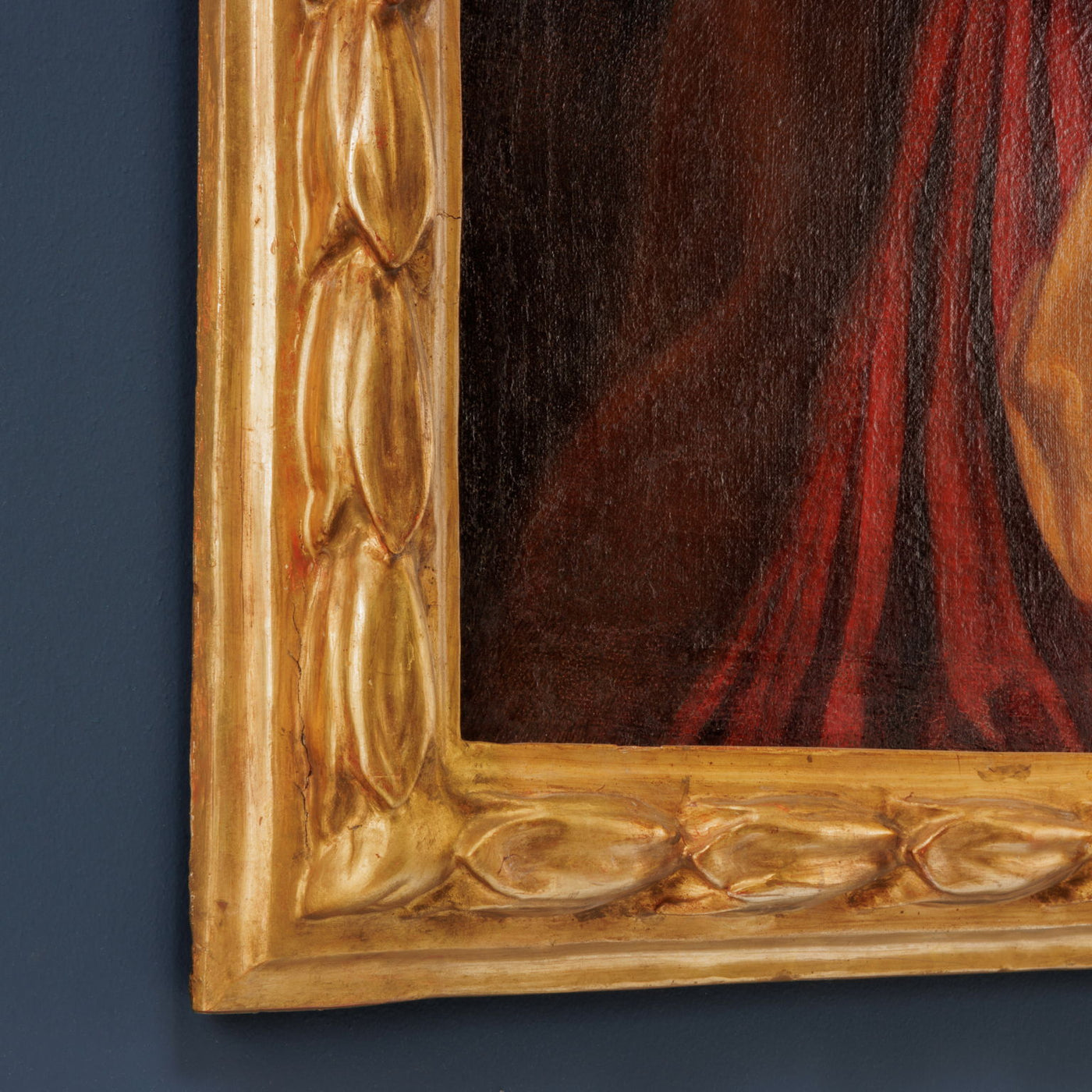 Oil on canvas. The figure of Mary Magdalene is represented here, as per tradition, with long red hair; with a gesture of painful dedication she fixes her gaze on the crucifix, which she holds with her left hand pressed against her right arm, which in turn is folded in a sign of collected penitence. The whole body is rendered with a splendid counter-twist, which has the effect of making the viewer feel the tension of the moment experienced by the saint. On her left is visible the skull, her traditional attribute, and in the background one can glimpse the outline of the cave in which she is placed. The part of the body emerges, thanks to the intense luminosity of the arms, connected to the red ochre shades of the hair and face, thus also accentuating the erotic character of the scene, recalling the exuberant painting of Rubens, which had a great influence on Crespi's work. This captivating and delightful figure of the Magdalene follows the widespread trend in the 17th and 18th centuries to depict saints with an undertone of human sensuality, revealing the patrons' preference for sacred themes imbued with profane elements. The painting, restored and relined, is presented in a late 19th-early 20th century frame.