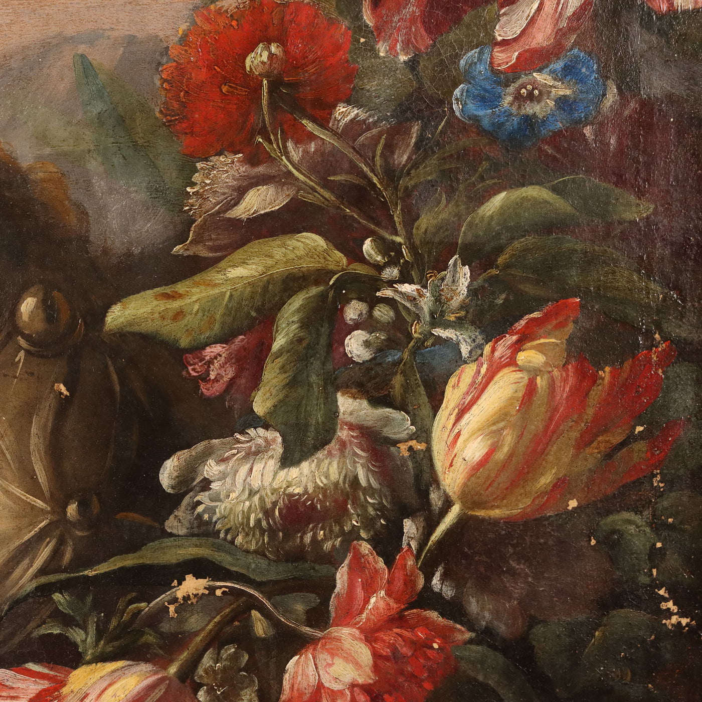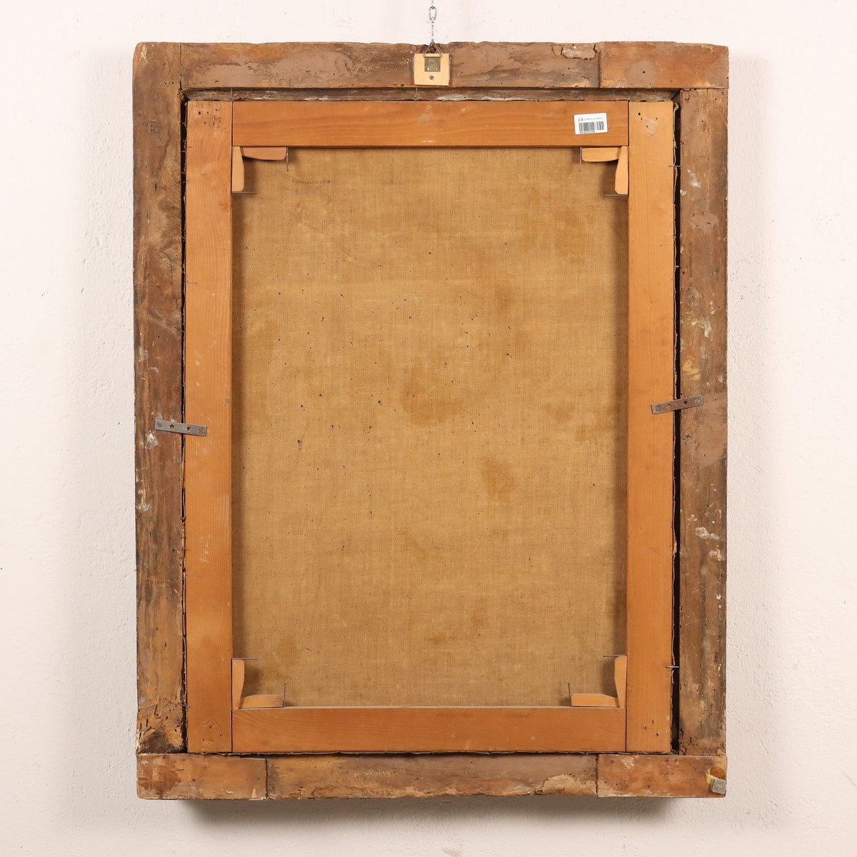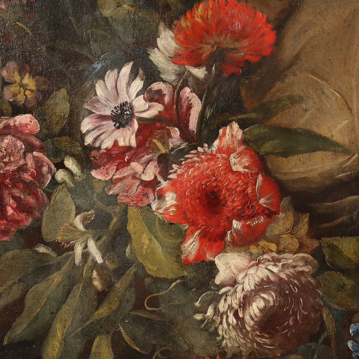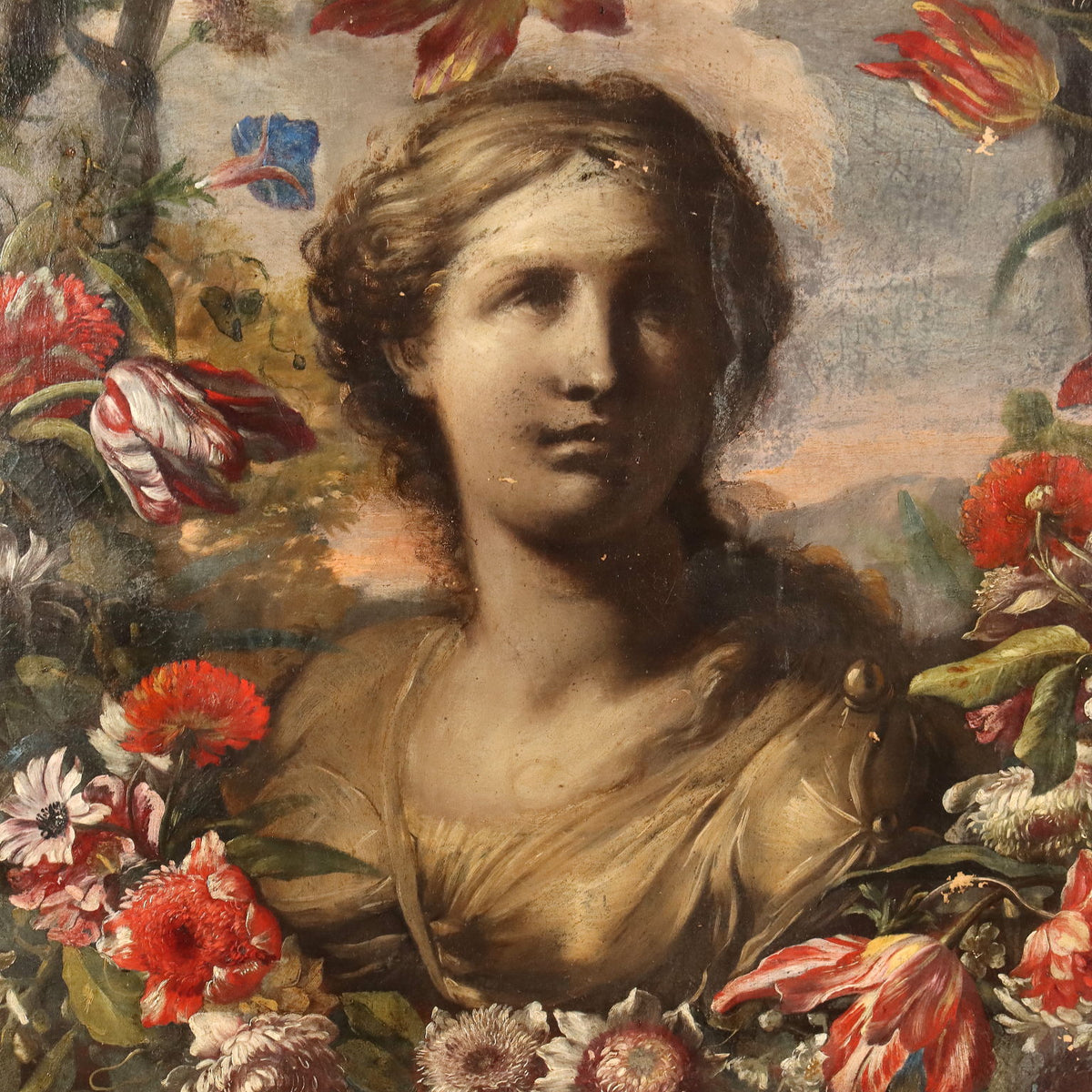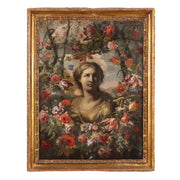 Oil painting on canvas. Central Italian school of the late 1600s-early 18th century. The composition proposes a female bust in the centre, portrayed as if it were a sculptural effigy, for the monochrome that evokes marble; it is surrounded by a garland of colorful flowers, which stretch from twisted branches above, while a landscape fades in the background. This type of portrait came from a solution born in the Flemish environment and spread in Italy by Daniel Seghers. Restored and relined, the painting has slight drops of colour. It is presented in an antique frame. Ancient painting, , art articles, lady's portrait, animal paintings, painting mountain landscape, oil on canvas painting, still life paintings, 1600s painting, italian painters oil on canvas paintings landscapes, painting sea landscape, painting winter landscape, painting autumn landscape, landscape painting, ancient art, religious painting.