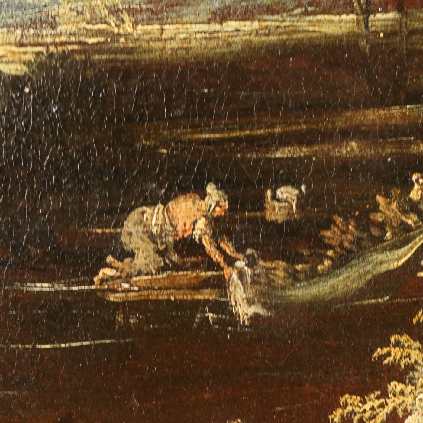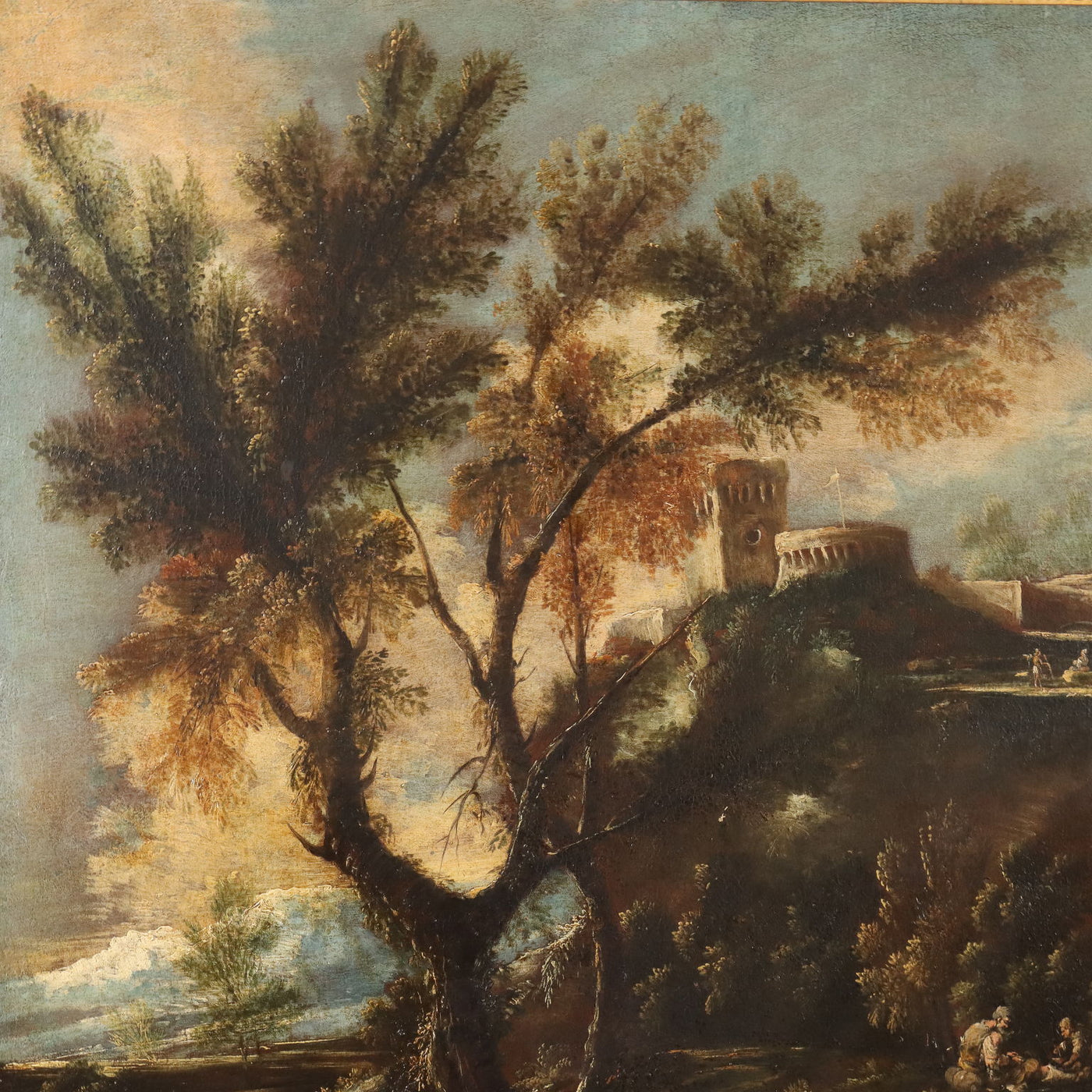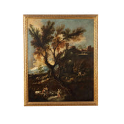 Oil painting on canvas. The large composition proposes a landscape with a large tree in the centre. to surmount with its sparse branches the countryside below, crossed by a stream and animated by various figures of commoners intent on activity or at rest; at the top right stands a fortress, which dominates the valley. Already attributed to Peruzzini from the Marches, the painting can certainly be traced back to his circle, due to the rapid and poorly aggregated pictorial strokes. Antonio Francesco specialized in landscape painting, undergoing the influence of Salvator Rosa and landscape painters such as Pietro Montanini and Pandolfo Reschi, and further influences also came to him from Nordic painters active in Italy, above all from Pieter Mulier known as il Tempesta. In his first works the originality of his painting can already be distinguished given a rapid drafting and an intense and brilliant chromatic timbre. The long artistic bond between Antonio Francesco Peruzzini and Alessandro Magnasco began in the early 1990s, following their meeting in Milan, where Peruzzini had settled; from this period onwards his painting seems to fall apart, through forms that become more dynamic and light, almost fantastic, to finally arrive at a style marked by an ever greater disintegration of the forms of nature and their movement. Restored and relined, the painting is presented in a period frame.