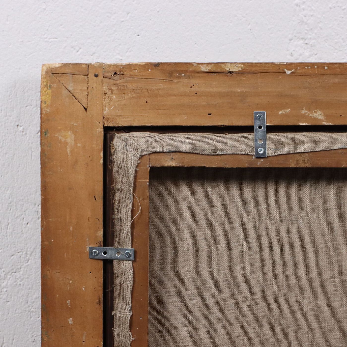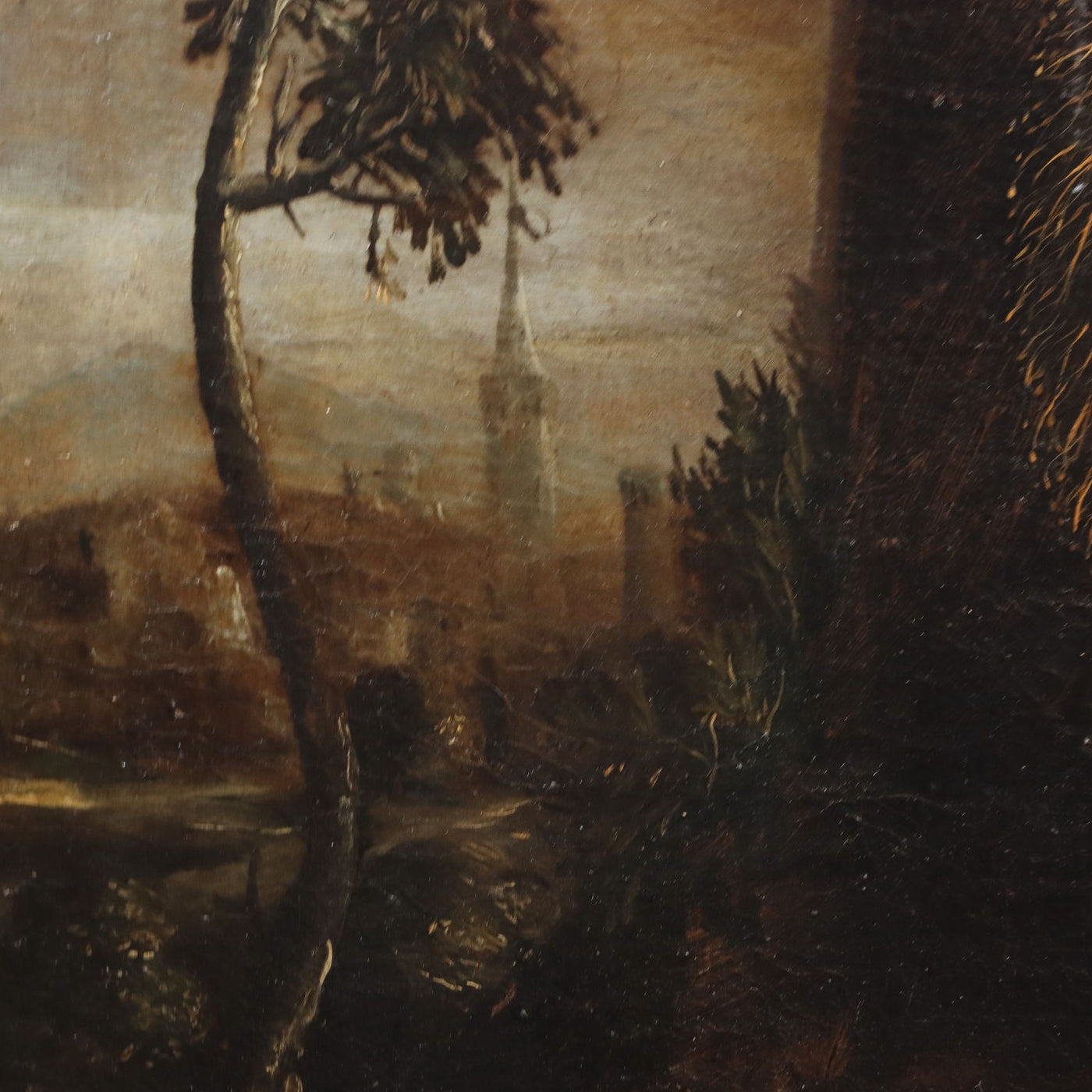 Oil painting on canvas. Neapolitan school of the 17th century. A composition of variegated flowers, in light shades, is placed in a vase, black like the background, on a marble base, of which only the base can be distinguished, because it is covered with a fabric that is also black, of which only the golden trimmings stand out willing to create a game of curves; Two birds rest on both sides of the top, a large pigeon on the left holding a twig stolen from the composition in its beak, and a red-headed woodpecker on the right. Along the left margin a landscape opens up, with a tall curved tree under a dark sky, and a city in the background. Restored and relined, the painting is presented in a late 19th century frame. Ancient painting, , art articles, lady's portrait, animal paintings, painting mountain landscape, oil on canvas painting, still life paintings, 1600s painting, italian painters oil on canvas paintings landscapes, painting sea landscape, painting winter landscape, painting autumn landscape, landscape painting, ancient art, religious painting.