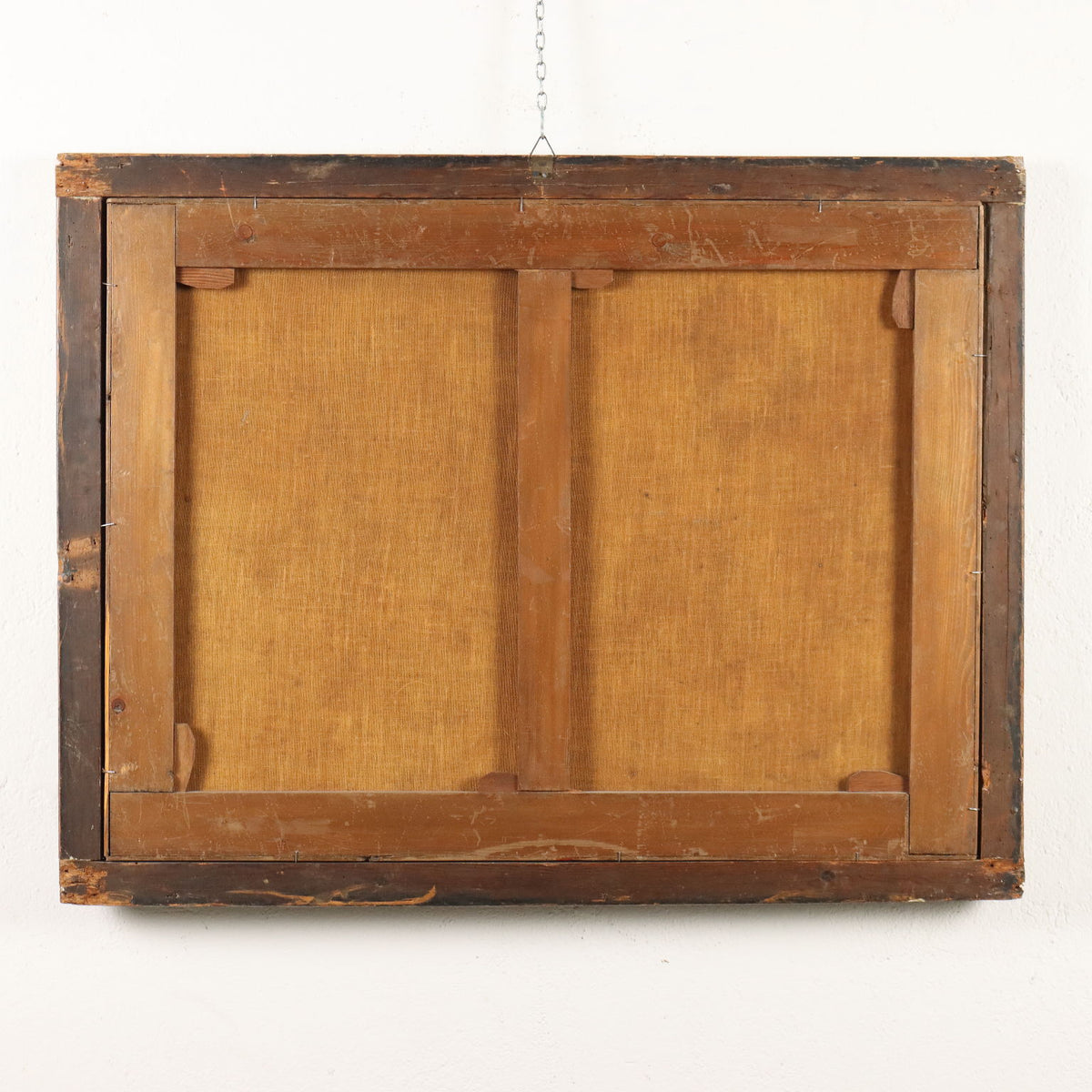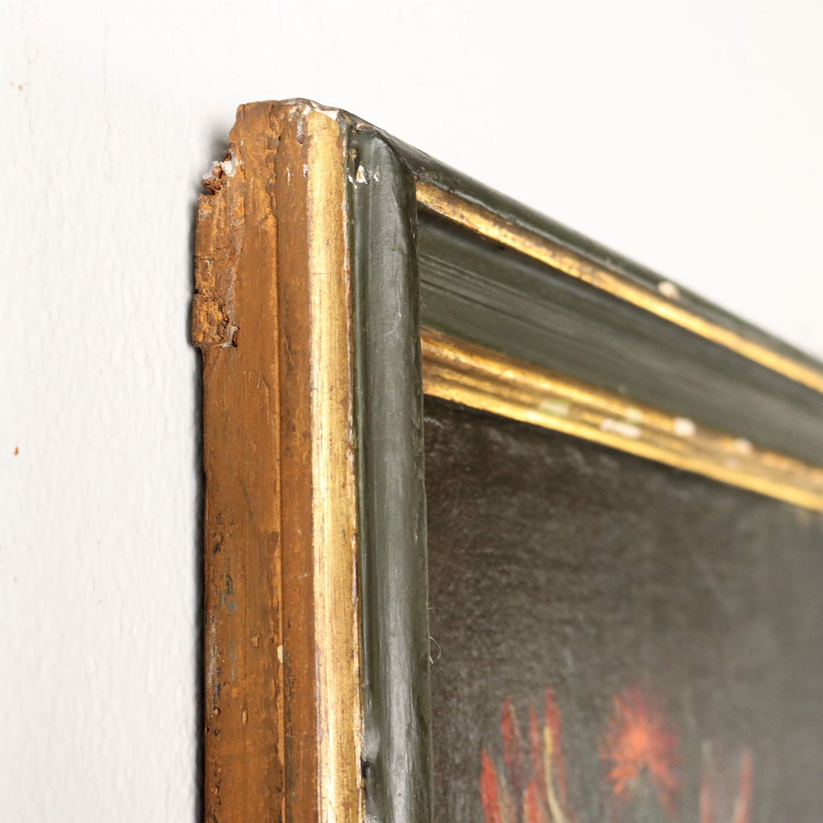 Oil painting on canvas. The composition features a hanging hare in the centre, flanked by some quails and a pigeon; on the right side, a wicker basket containing chestnuts and pine branches; on the left side a bunch of asparagus and a vase of colorful flowers, whose bright and lively colors create a chromatic contrast with the other elements, all in brown and gray tones. Restored and relined, the painting is presented in a repurposed 19th century frame. Ancient painting, , art articles, lady's portrait, animal paintings, painting mountain landscape, oil on canvas painting, still life paintings, 1600s painting, italian painters oil on canvas paintings landscapes, painting sea landscape, painting winter landscape, painting autumn landscape, landscape painting, ancient art, religious painting.