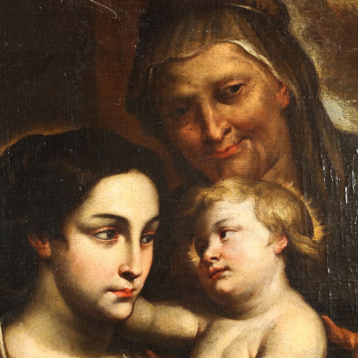 On the left side, somewhat separated and in the dark, Joseph watches pensively and worriedly: the only human figure who does not fit into the light emanating from the Child's face, radiating on Mary's and, by reflection, also on St. Anne's.