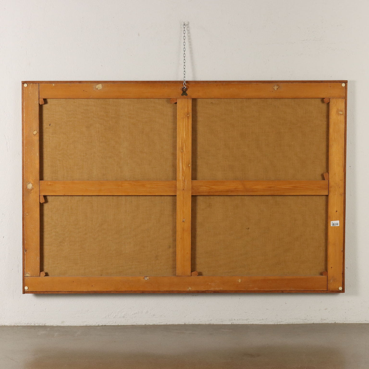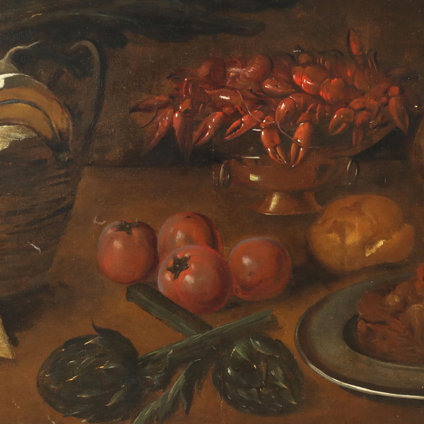 Oil painting on canvas. Italian school of the 17th century. The large composition presents a variety of foods on a kitchen table: on the left a large wicker basket full of vegetables, surmounted by a group of hanging fish; other vegetables are placed on the table top, next to a plate of cherries, one with a loaf of bread, and further back another with prawns; on the right stands a vase full of colorful flowers and, sitting on the shelf of a cupboard, a black cat calmly licking its paw. The sharpness of the colors stands out, enhanced by the reflections of light on some foods, such as cherries or prawns, and on the copper jug ​​in front of the flowers. The painting, restored and relined, is presented in a strip frame. Ancient painting, , art articles, lady's portrait, animal paintings, painting mountain landscape, oil on canvas painting, still life paintings, 1600s painting, italian painters oil on canvas paintings landscapes, painting sea landscape, painting winter landscape, painting autumn landscape, landscape painting, ancient art, religious painting.