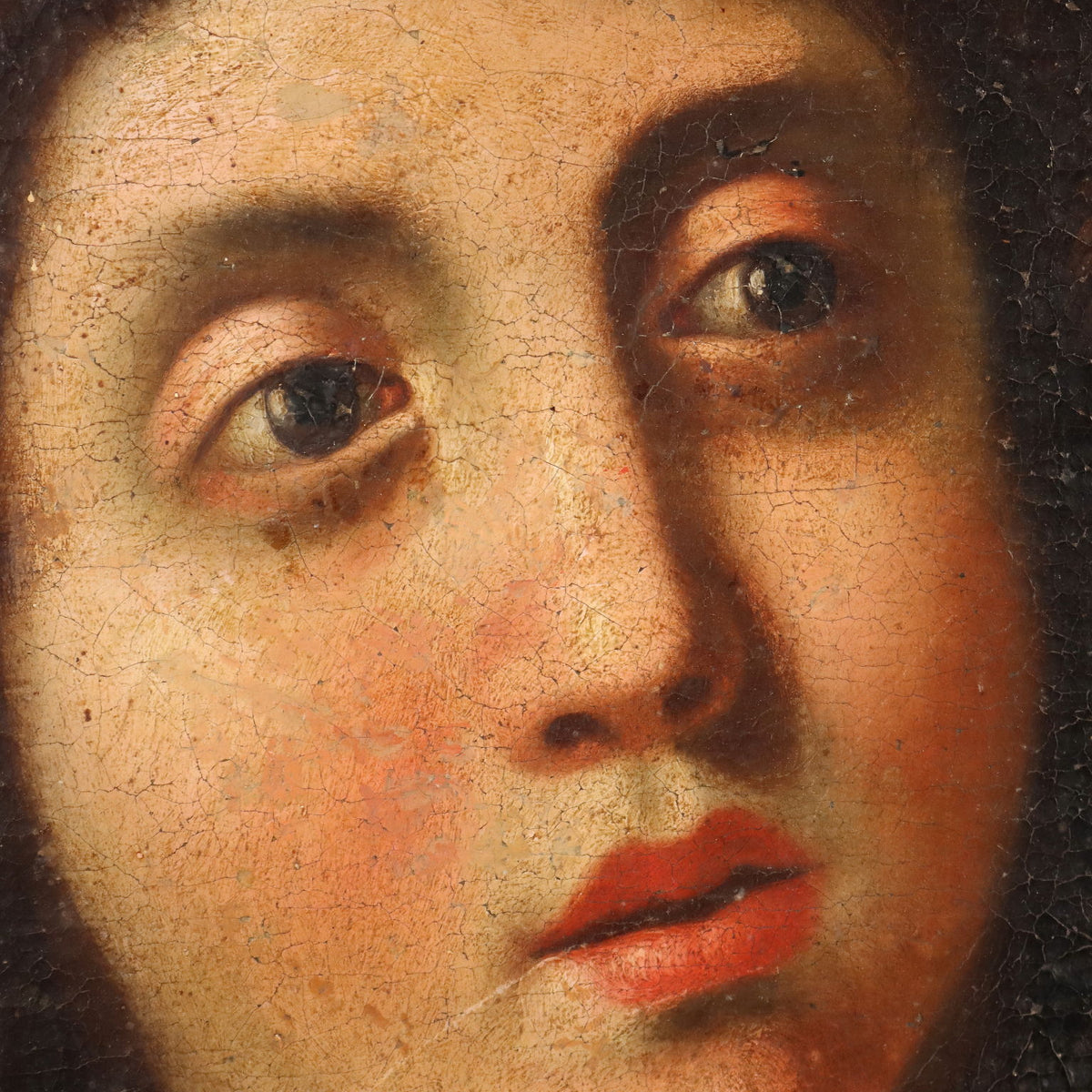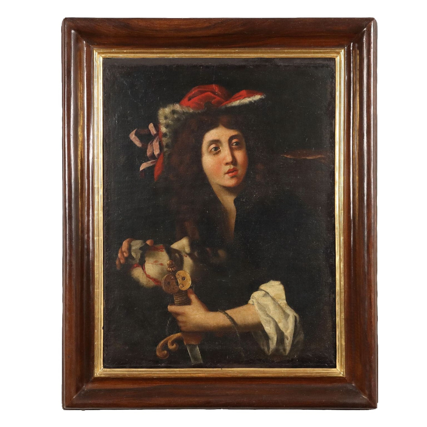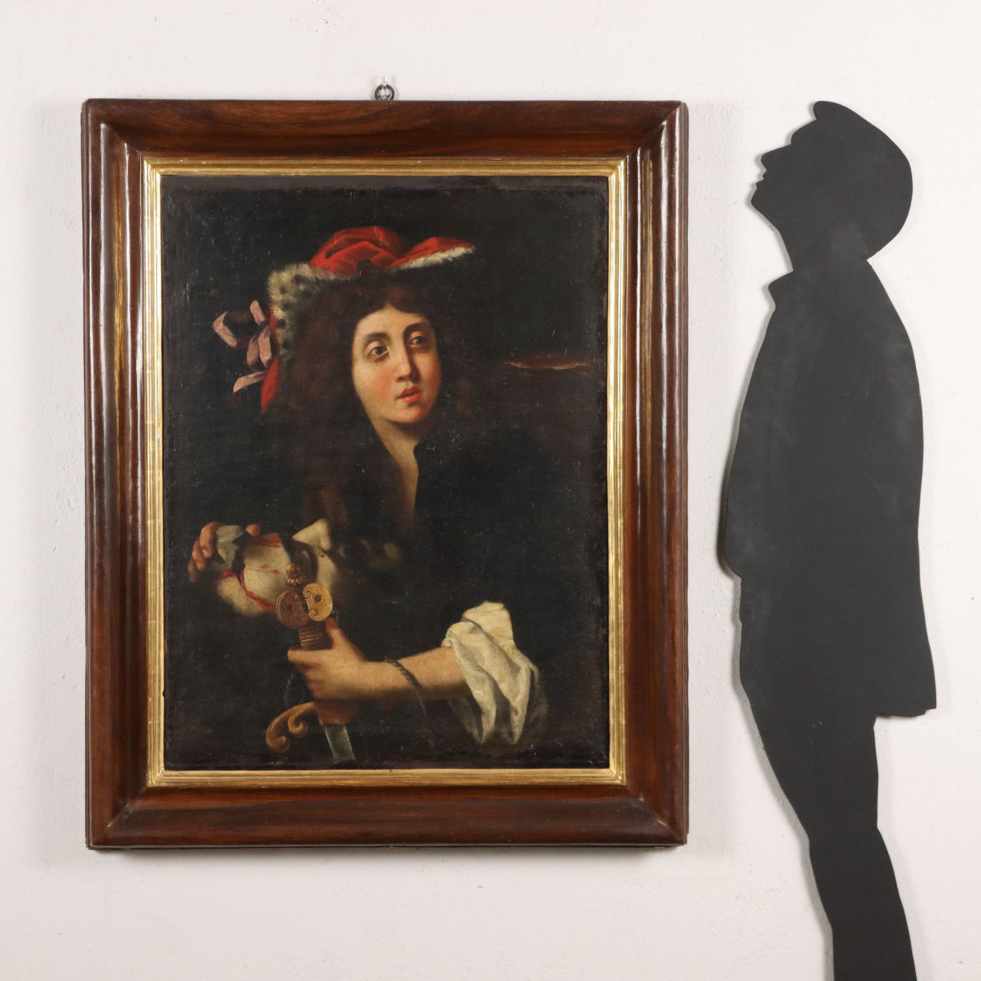 Oil painting on canvas. Central Italian school of the 17th century. In its pictorial style, the painting recalls the production of Angelo Caroselli (1585-1652), a Roman Baroque artist who was a painter, copyist, restorer, but also a pasticheur and connoisseur of art, i.e. creator of paintings 'in the manner of'- in “technique” and in the “style” of a specific artistic period or of a specific author, even assembling “parts” taken from different paintings. Initially Caravaggesque, Il Caroselli later developed his own personal artistic language, which was copied by many minor artists. In this work the fixed and almost exasperated expressiveness of the character stands out, whose elegance of the seventeenth-century dress and the almost feminine features of the face with its rosy complexion contrast with the crudeness of Goliath's head, bloody, with the large stab wound that stands out against the mortal pallor. The painting has been restored and relined, retaining the original wooden frame. It is presented in a contemporary wooden frame. Ancient painting, , art articles, lady's portrait, animal paintings, painting mountain landscape, oil on canvas painting, still life paintings, 1600s painting, italian painters oil on canvas paintings landscapes, painting sea landscape, painting winter landscape, painting autumn landscape, landscape painting, ancient art, religious painting.