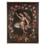 Oil painting on canvas. Central Italian school of the 17th century. According to the iconographic tradition, also in this painting the guardian angel is depicted as a winged young man who accompanies a child along a stretch of road, indicating the sky as the destination of the journey. The winged figure stands out and dominates the scene, lively in its colours, powerful in the physical strength it emanates, albeit sweet in its delicately protective attitude towards the child, whose small figure is enveloped in the limbs of its guardian. The scene is enclosed within a garland of bright and colorful flowers, which give color to the figures, otherwise placed in a dark and almost monochrome landscape. The depiction of characters, mainly religious, enclosed in floral frames had great development especially in Rome, linked to names such as Giovanni Stanchi (1608 -1675), rather than Mario Nuzzi known as Mario de' Fiori (1603 -1673), and others. The painting, restored and relined, is presented in a strip frame. Ancient painting, , art articles, lady's portrait, animal paintings, painting mountain landscape, oil on canvas painting, still life paintings, 1600s painting, italian painters oil on canvas paintings landscapes, painting sea landscape, painting winter landscape, painting autumn landscape, landscape painting, ancient art, religious painting.
